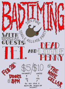 Bad Timing are some sad white boyz, and a non-binary alien angel who play loud music about ~feelings~ and how much it sucks to live under capitalism. We are an Auckland based band who are trying to create conversation around the destruction of our environment and the negative effects that capitalism has on our lives, society and the planet.