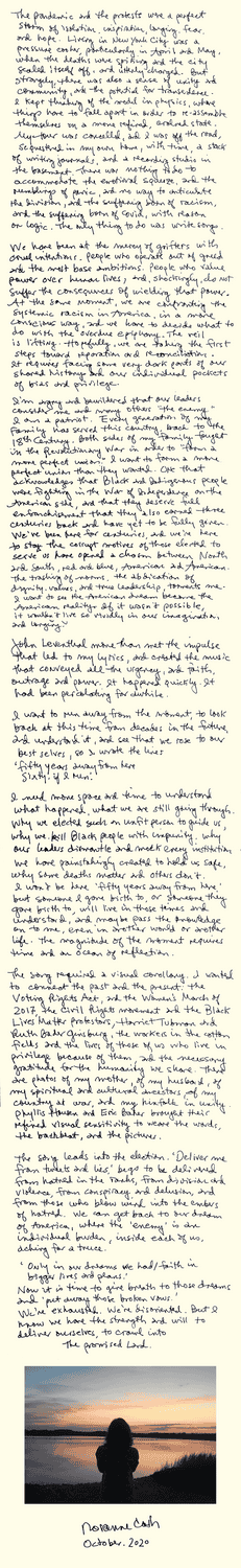“My tour was cancelled, and I was off the road, sequestered in my own home, with time, a stack of writing journals, and a recording studio in the basement. There was nothing to do to accommodate the emotional squeeze, and the rumblings of panic, and no way to articulate the division, and the suffering born of racism and the suffering born of Covid, with reason or logic. The only thing to do was write songs.