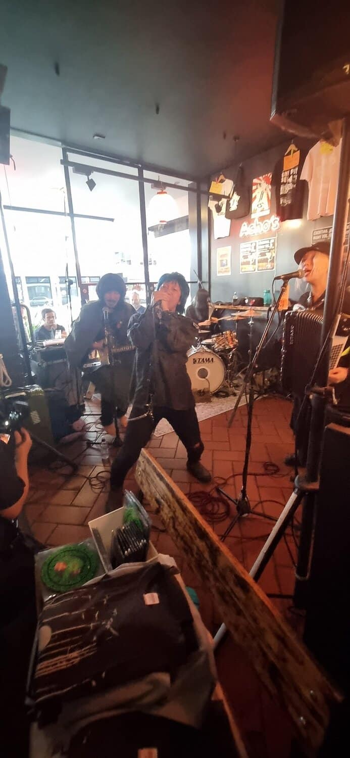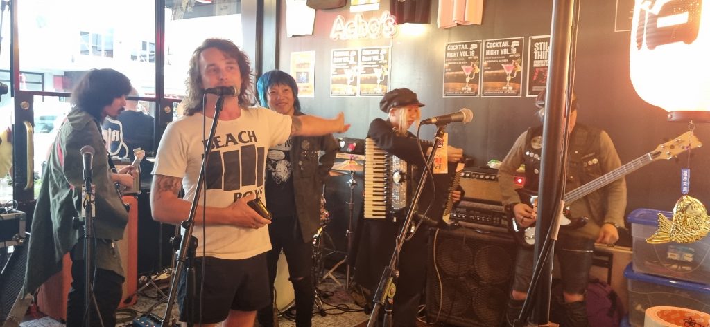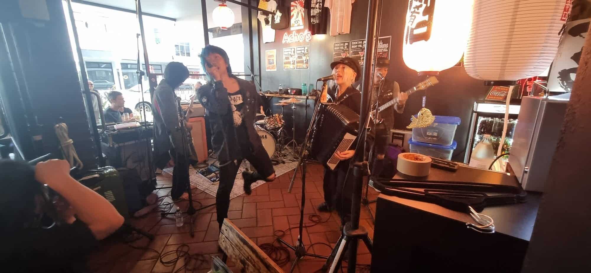 As the guitarist maestro Brian Purington from Swallow The Rat said as we drank fine beverages and ate magnificent Japanese bar food at Acho’s on K’Rd. “How often do you get to see a waycool punk/folk band from Japan in a New Zealand Japanese bar?” AlkaSilka are on the weekend’s bill to play with The King Brothers (also from Japan) and locals Cindy. But tonight, or rather this evening, AlkaSilka have snuck in a surprise-ish early evening show at Tamaki Makaurau’s favourite Japanese bar snack hangout – Acho’s.