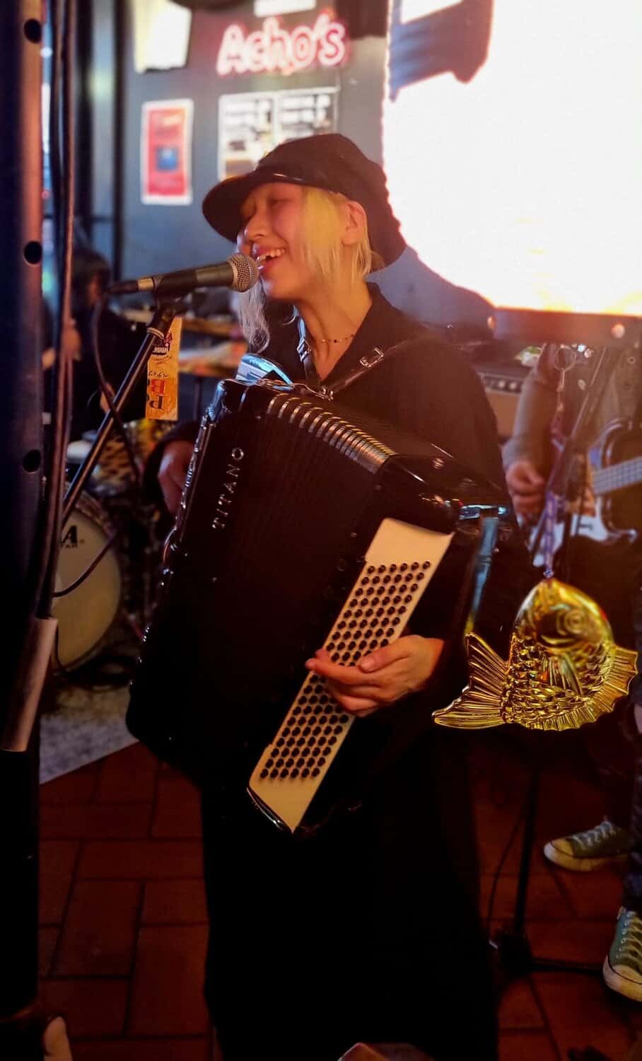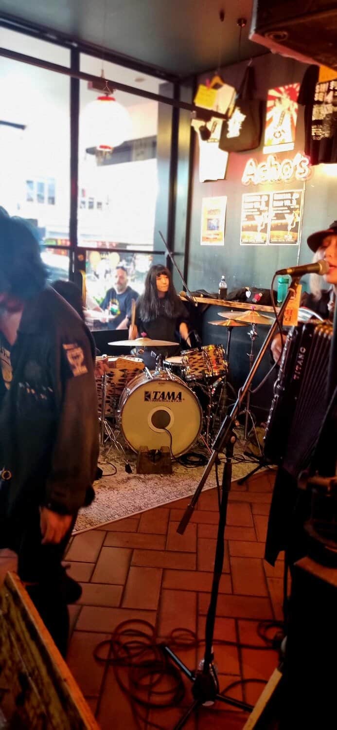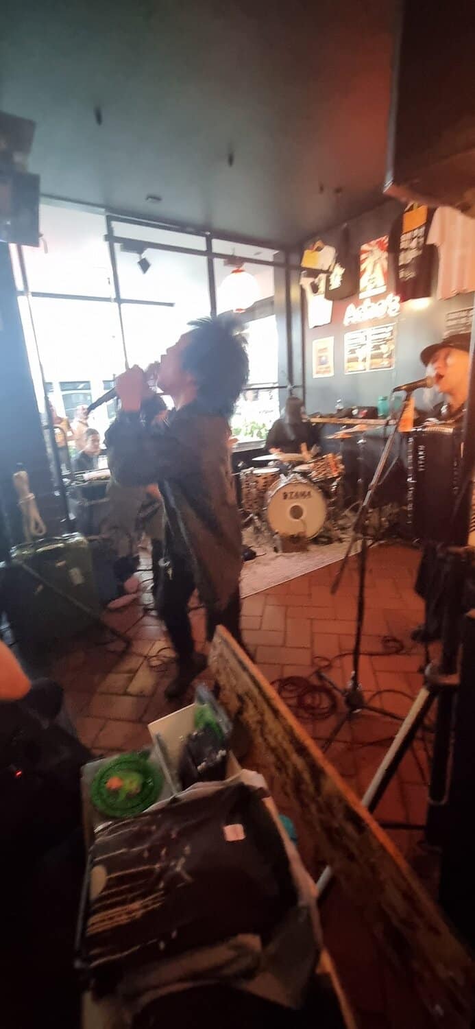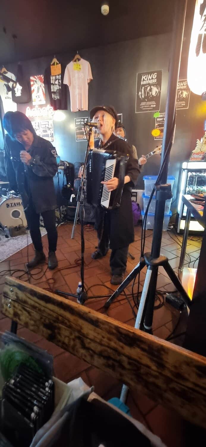 Dinner is so fucking yum, darling Jessica has never been to Acho’s before and is impressed by the food and drink (I am particularly enamoured by discovering 7.5% Yamadanishiki Lager) As we eat, the members of AlkaSilka arrive and start setting up, it’s exciting, I have previewed their music, a synthesis of folk (care of an accordion) anarchic punk, and Japanese mannerisms.