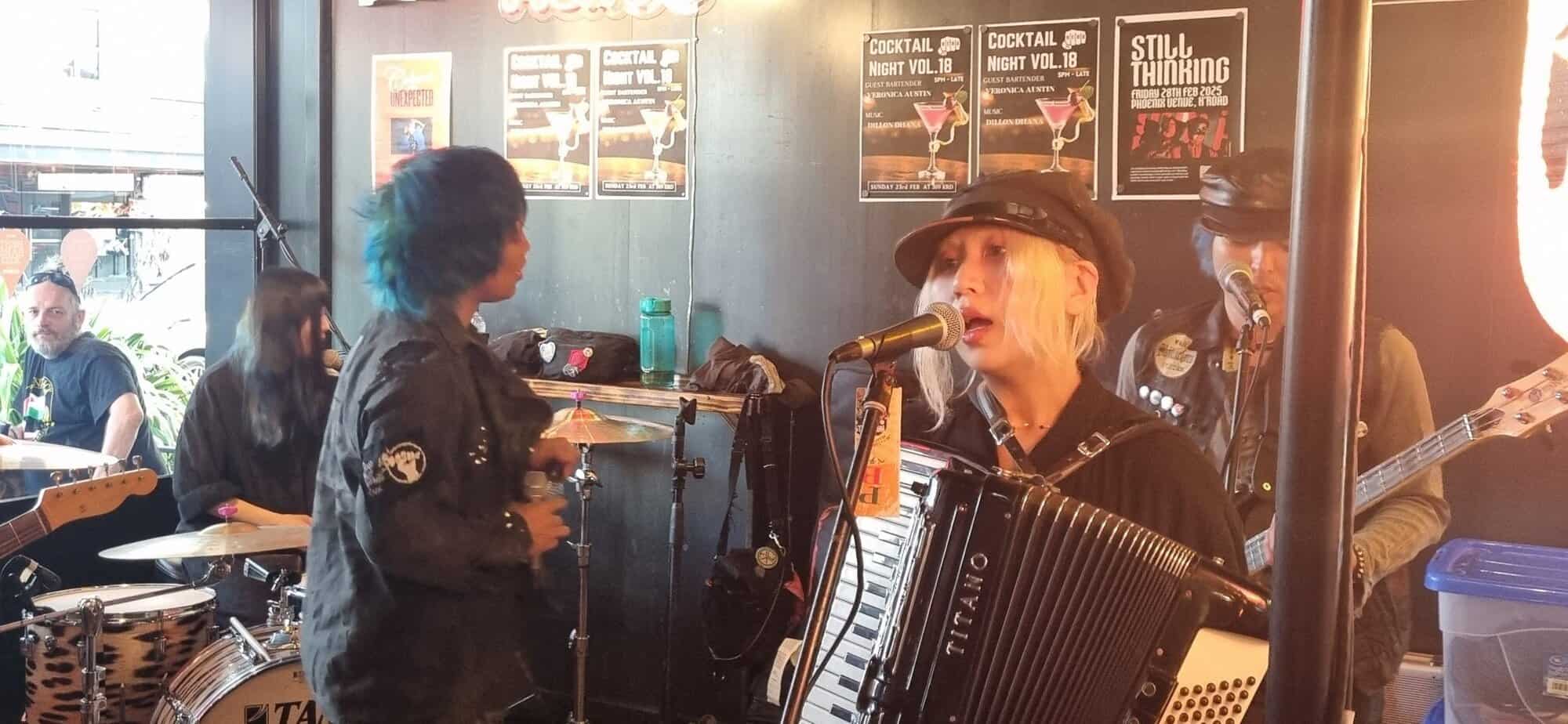 It begins, three guys: singer , guitar, bass and two gals: drums, accordion. It’s brash unforgiving energy, powerful dual, multi vocals, vocals, male and female, intricate harmonies, and dynamic stage presence, with a strong focus on audience engagement, creating a deeply immersive atmosphere that leaves the crowd feeling uplifted and connected, excited, in aroha, for a moment.