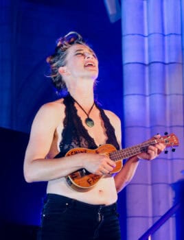 Closing the second half, The Ride. Again, inspired by her patrons as well as a bit by comedian Bill Hicks, it’s one of Palmer’s finest works, an epic ten minute-er that sees her musing on how life “is just a ride”, but “the alternative’s nothingness / might as well give it a try”. For an encore she emerges, top off, quickly followed by shoes too, for Ukulele Anthem from Theatre Is Evil then “a guilty pleasure”; Returning to the piano she masterfully delivers a rendition of Leonard Cohen’s Hallelujah under white lights. When they dim, the crowd are on their feet.