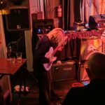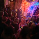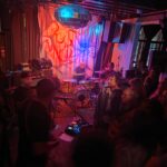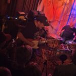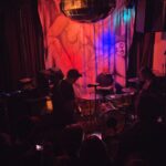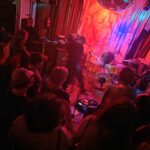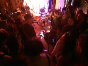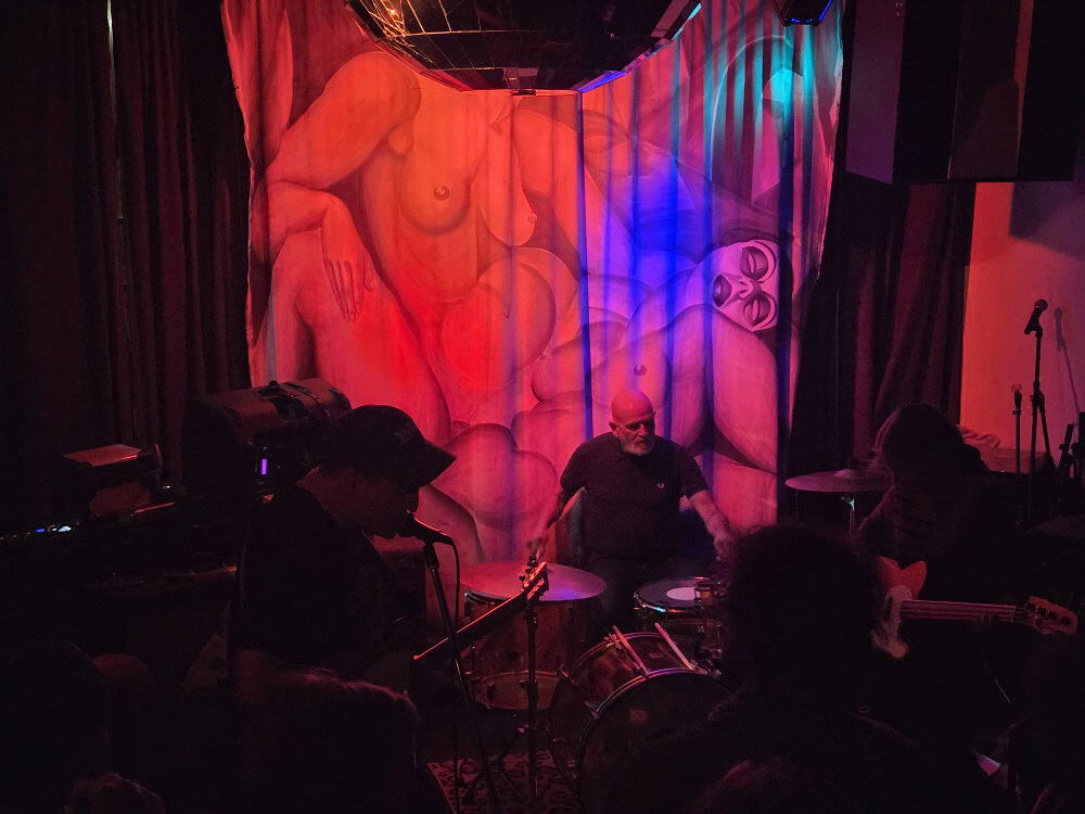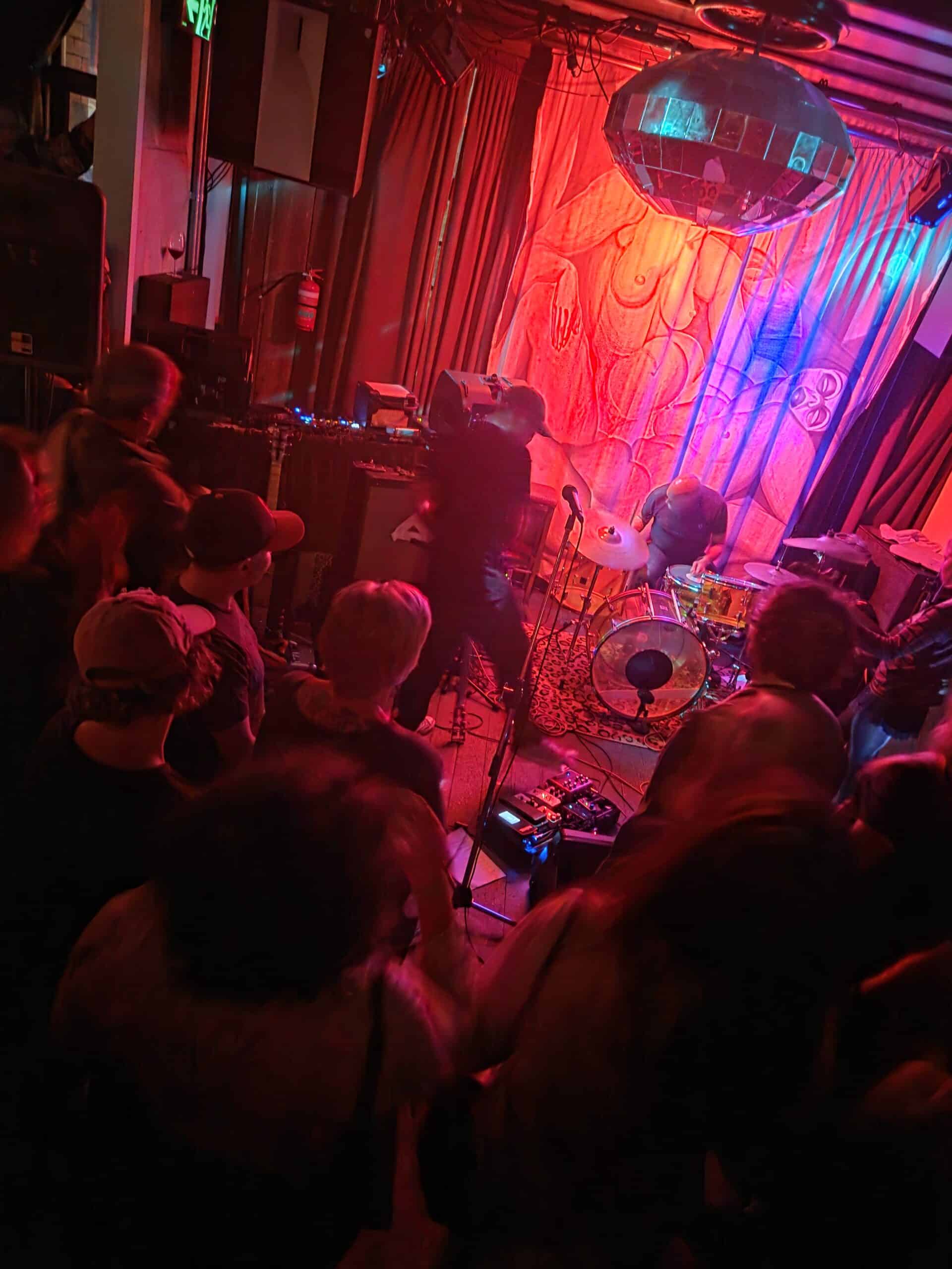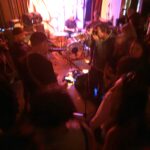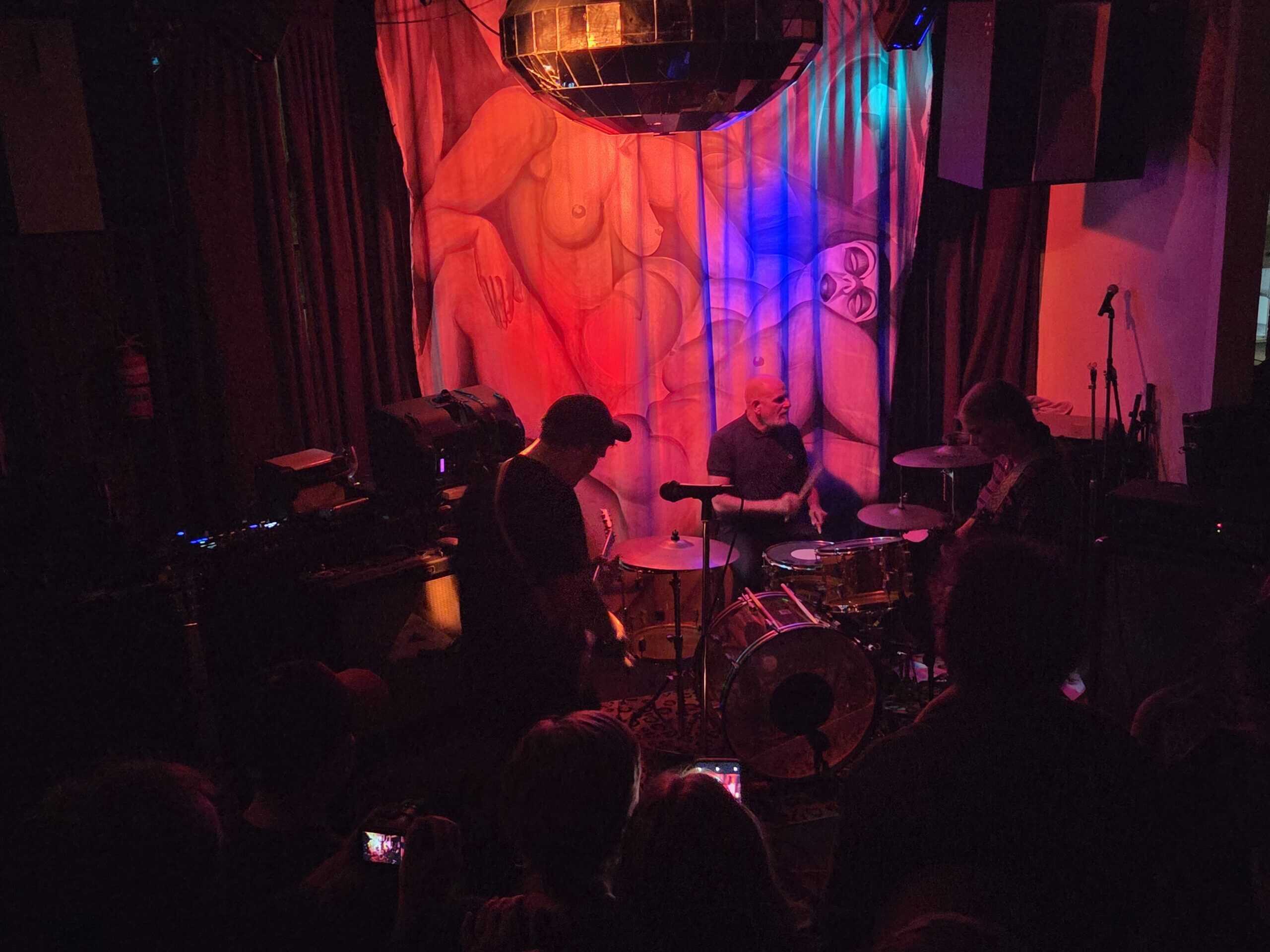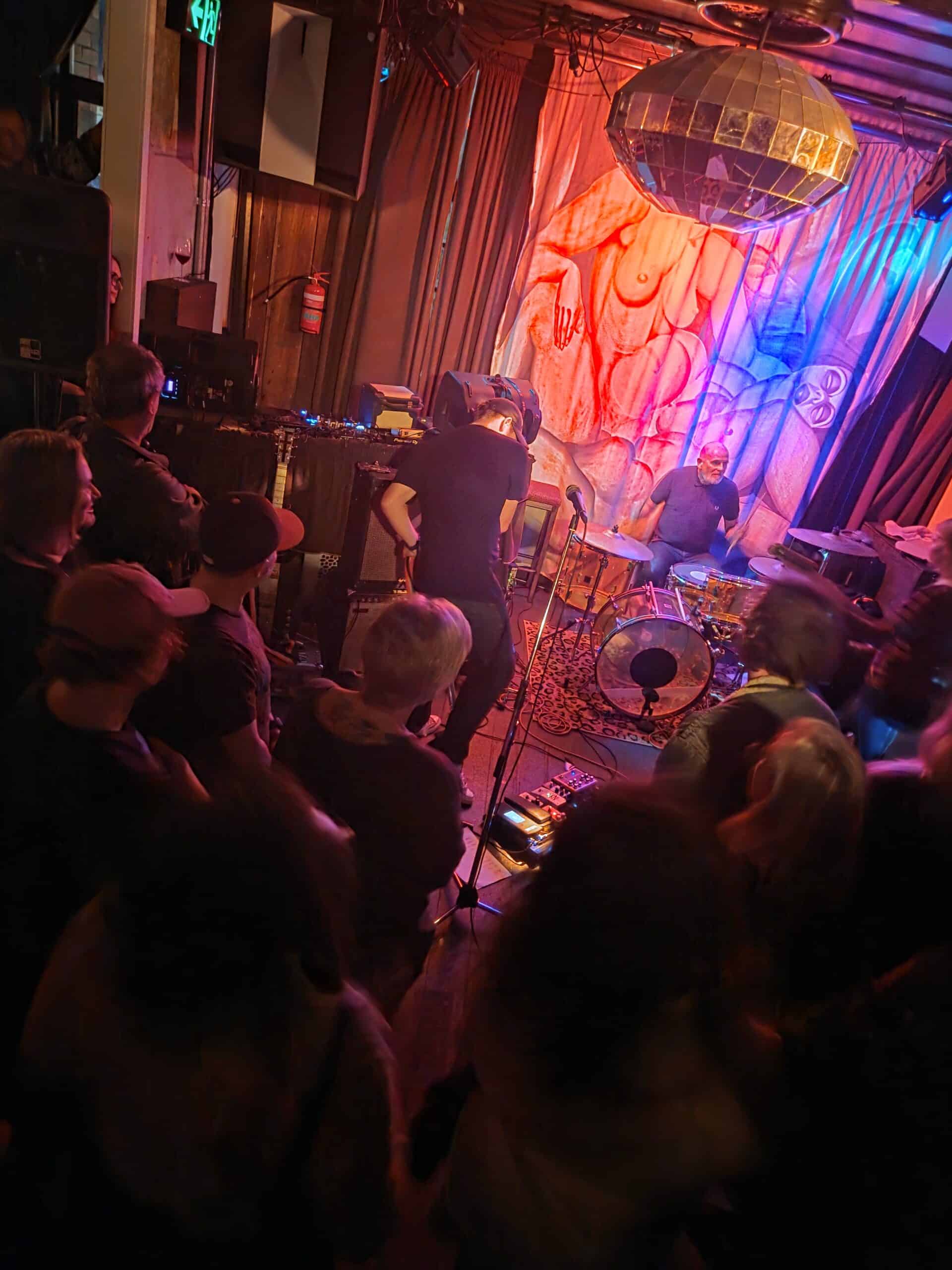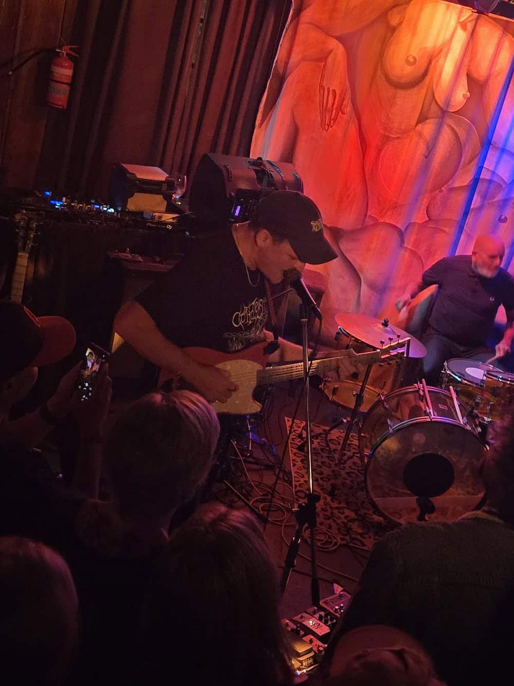 With three on the floor, the band had space, bassist Morgan was free to swing, and Kim had his own kit, meanwhile Andrew had the lion’s share, and later he took more. The space is jammed now, the smokers precariously balancing their cocktails, taking care, and kindness of strangers prevailed.