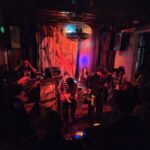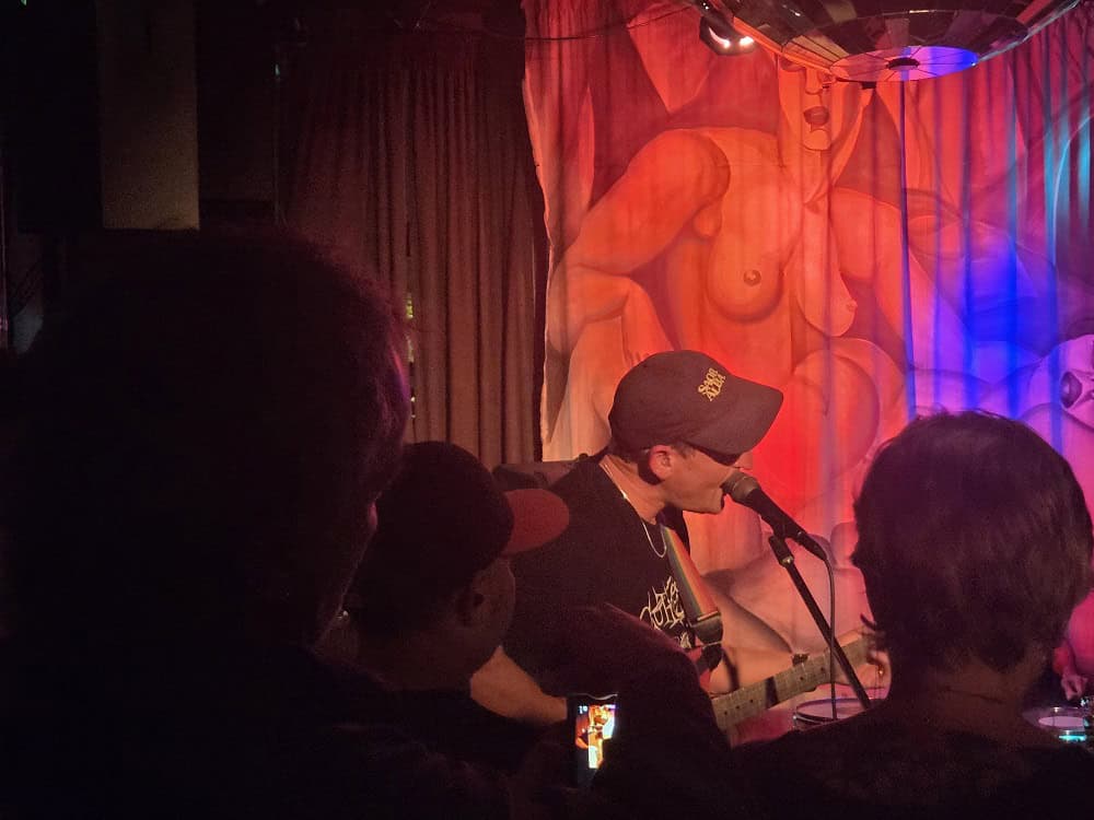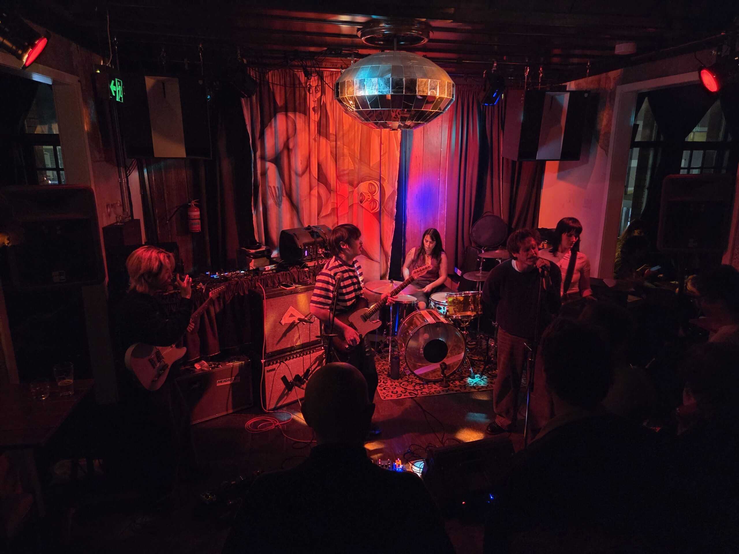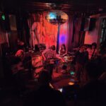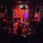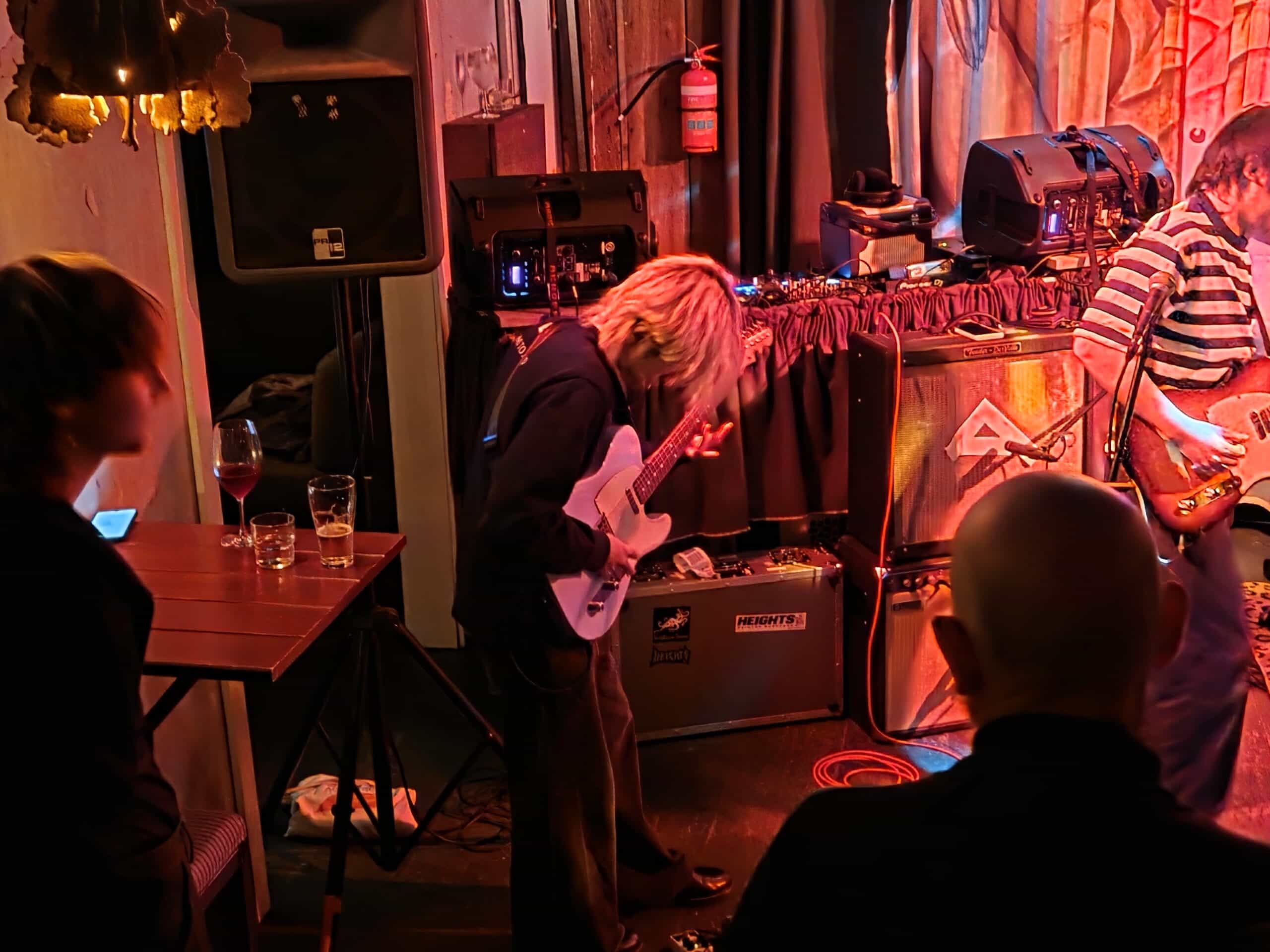 The five are not so squeezed in, the audience is, as the flow to and from the smoking patio is constant, it amuses that these travellers must mix with the rough types. There is a setlist, old-kura, but as the vocalist espoused, it’s in red pen, so under the minimalist red lighting, it’s unreadable. There’s also a fill-in drummer, Jessie, I missed the name of her band, they haven’t fired the old one, he’s just missing or in limbo or washing his hair..