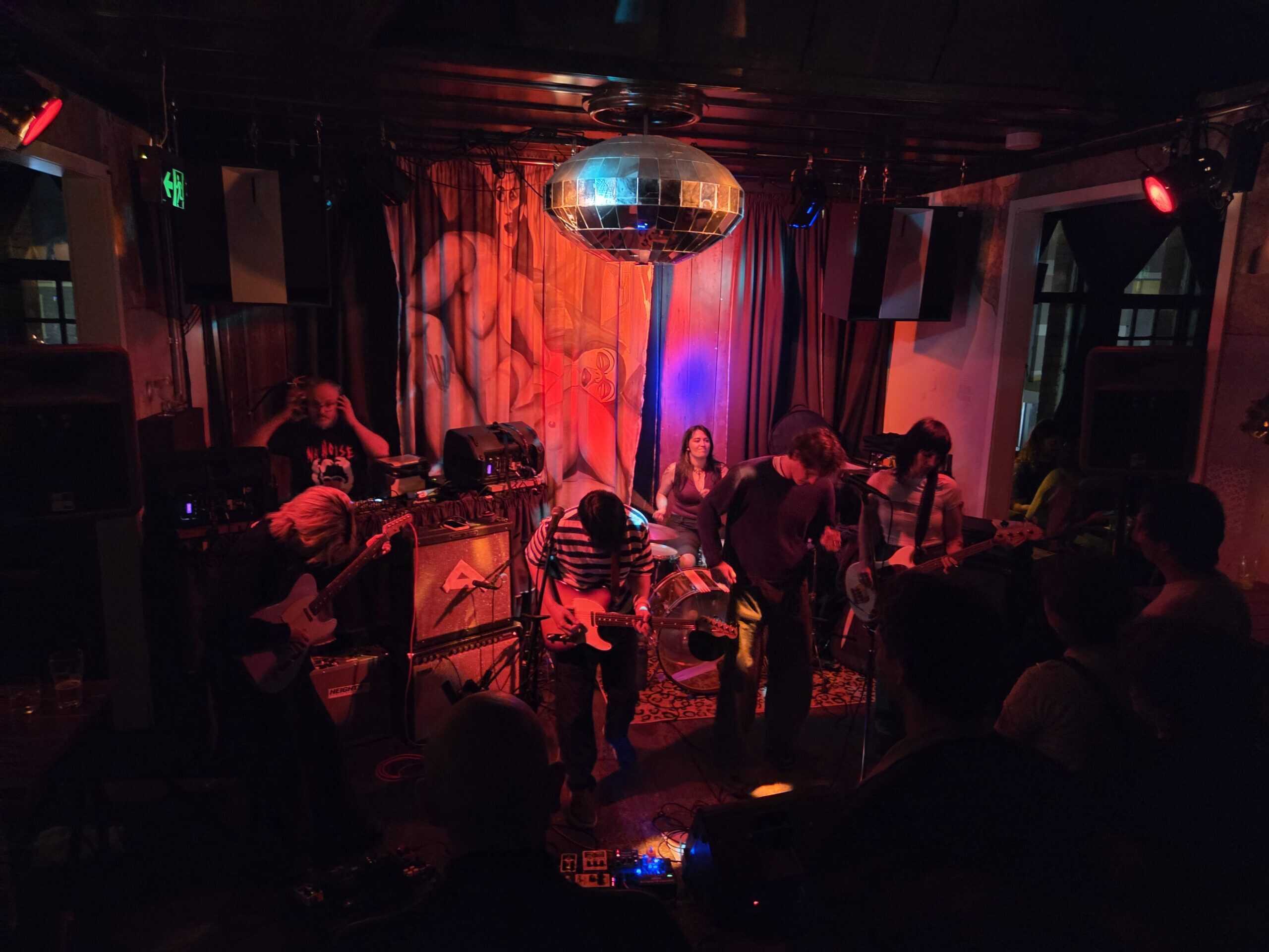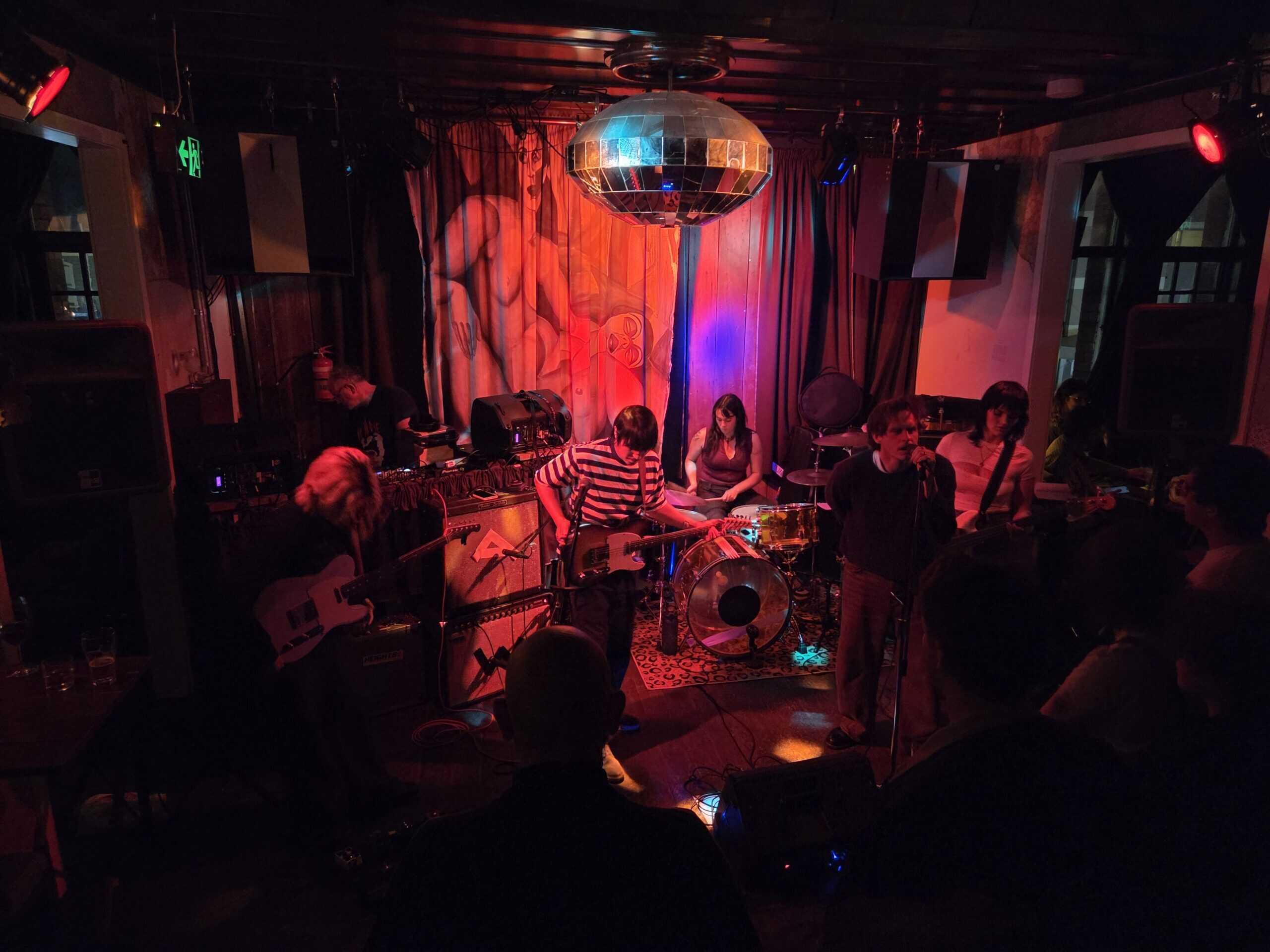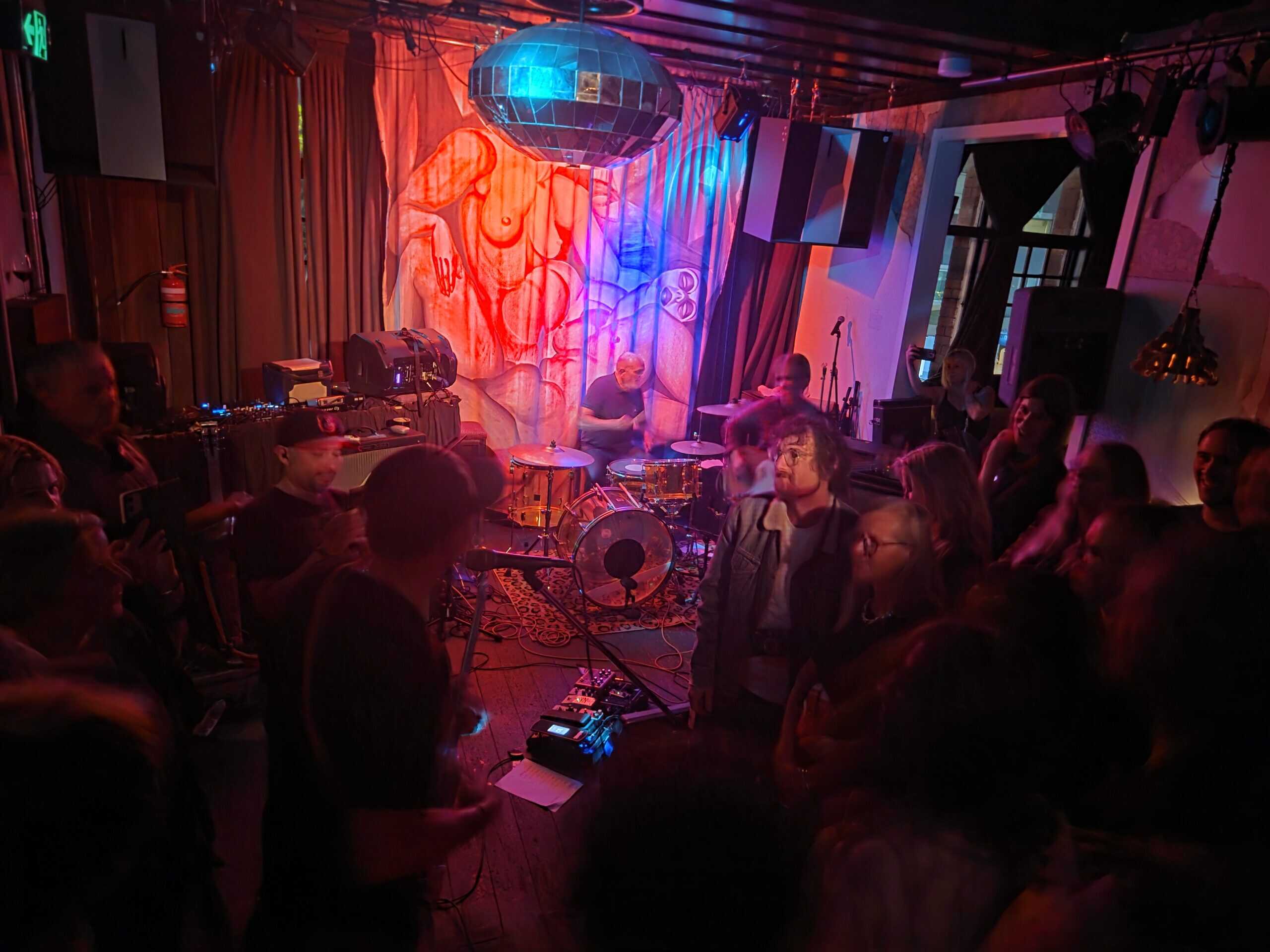 Intermission: While the DJ, Matthew Crawley, spins an eclectic mix including Julee Cruise and James White and the Blacks (or similar) a hand flicks lighting switches, darken the whare, there’s a hope that the massive disco ball that dominates the heavens will begin, but alas, no…