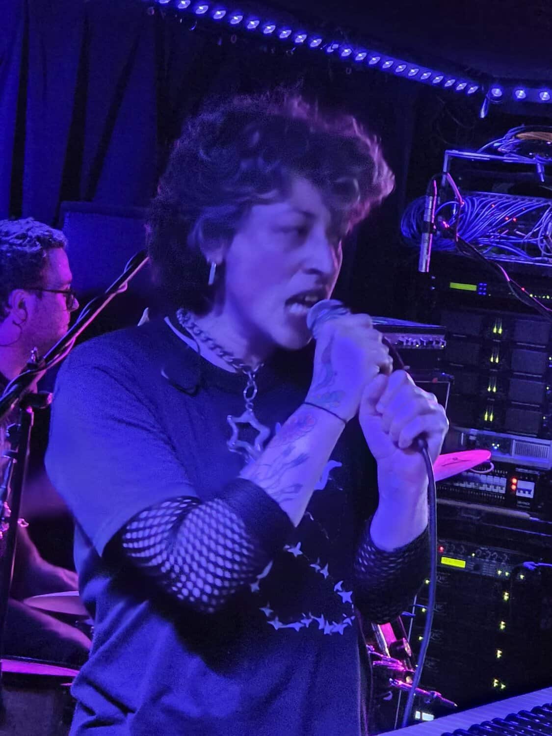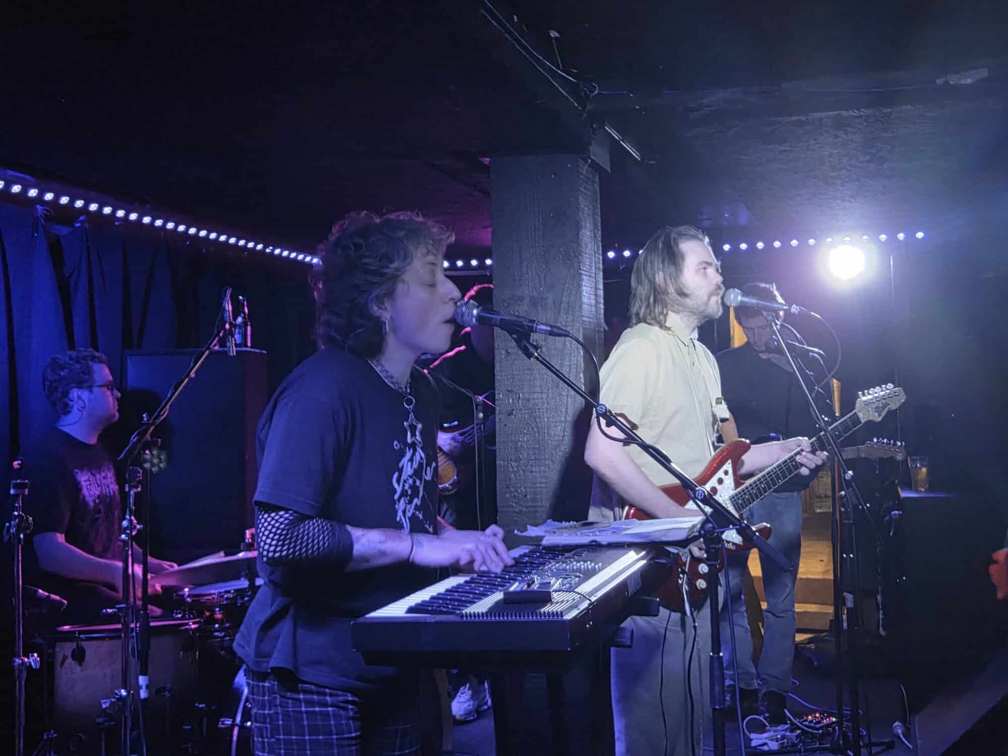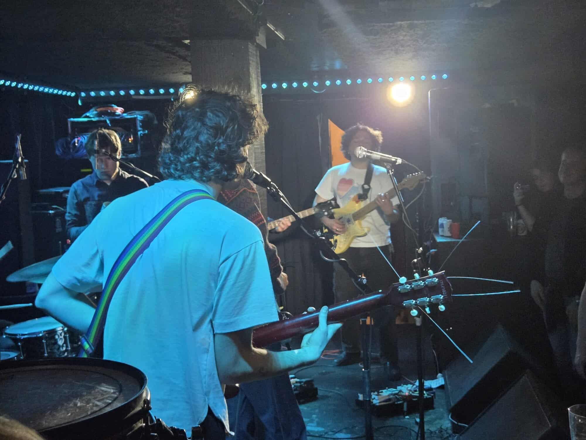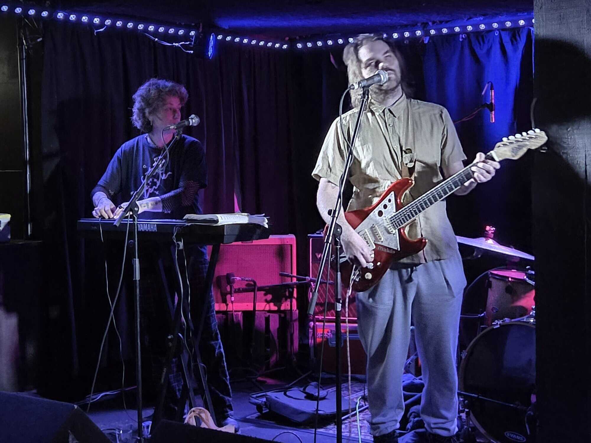 Tonight’s unknown quantity…existing in a form since 2016, with a kete of Bandcamp releases and a new album – Categorical, released just a few months ago, For The Girl Who Has Everything are no new kids on the block (nor NSYNC) even though they emerged post-covid with a revised lineup, and recently did a 95bFM Fancy New Band session. Liam Pram – band leader, guitarist and vocals, was joined onstage by four: Keyboards, drums, bass and lead guitar.