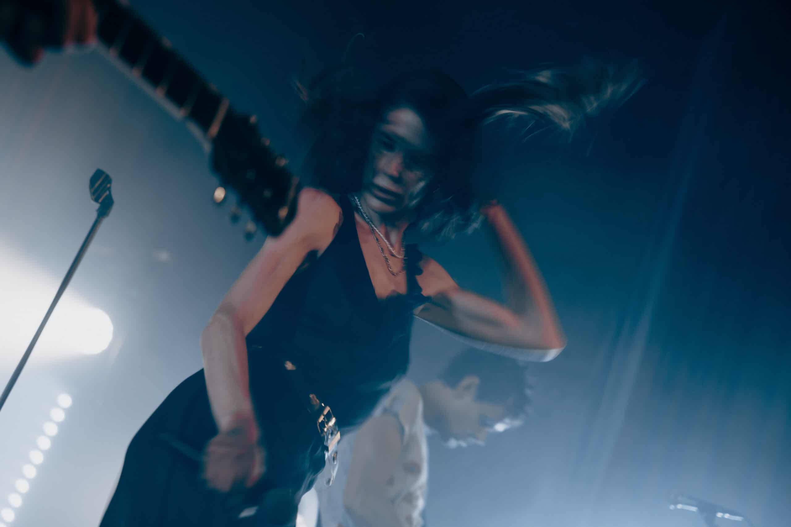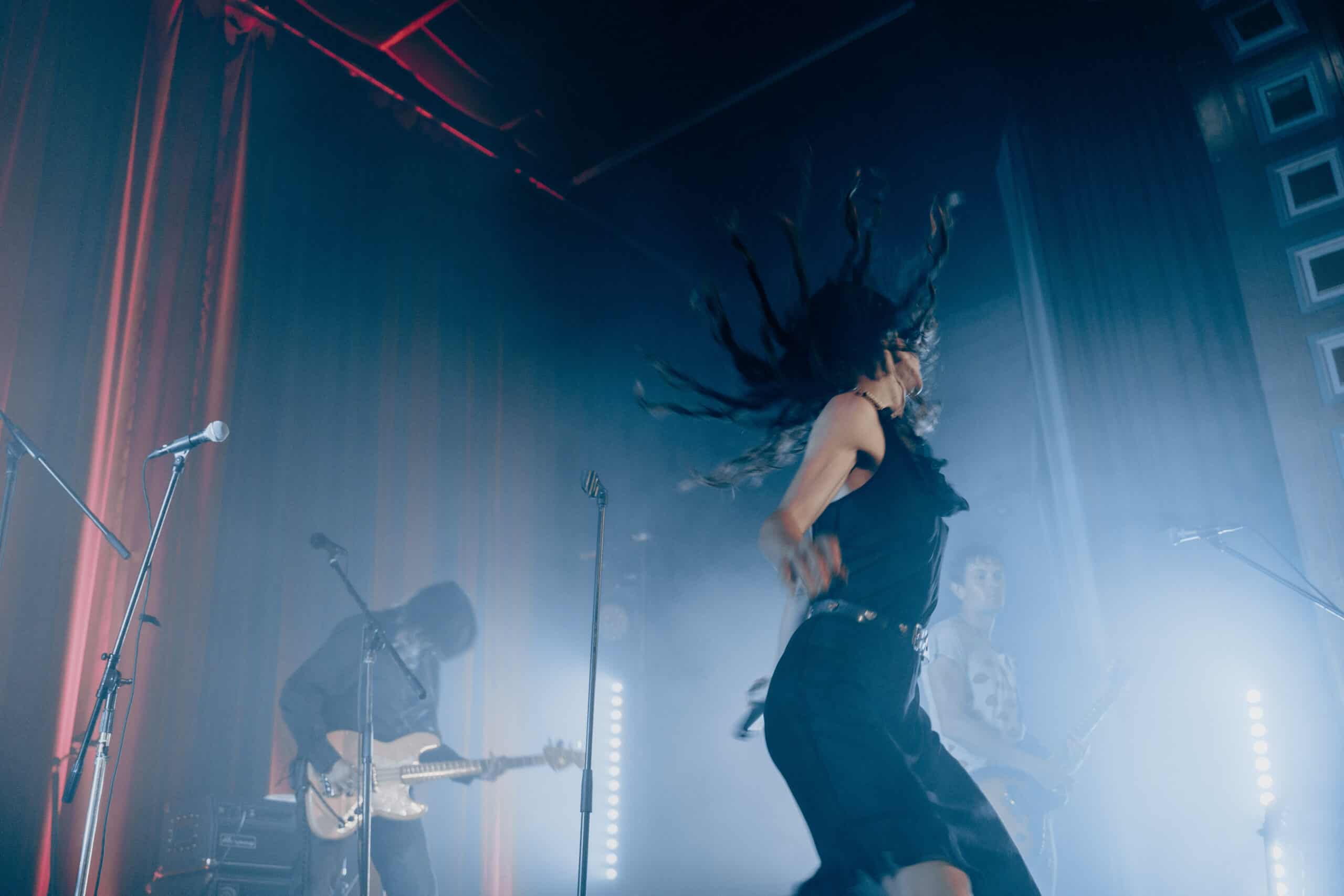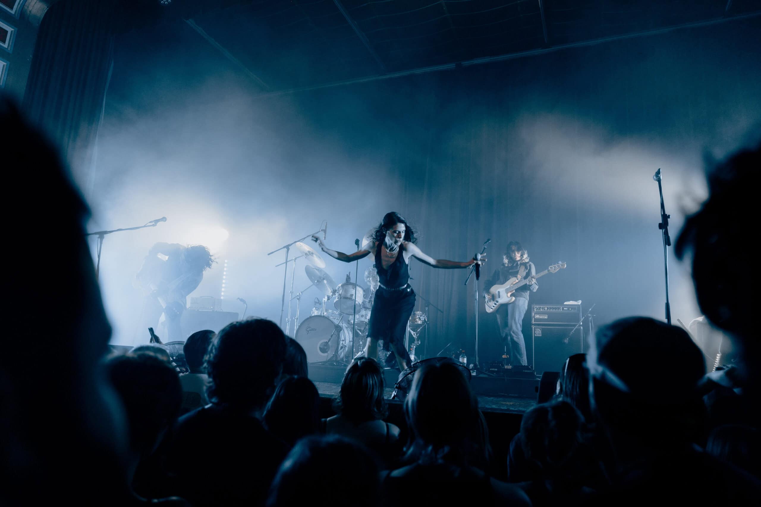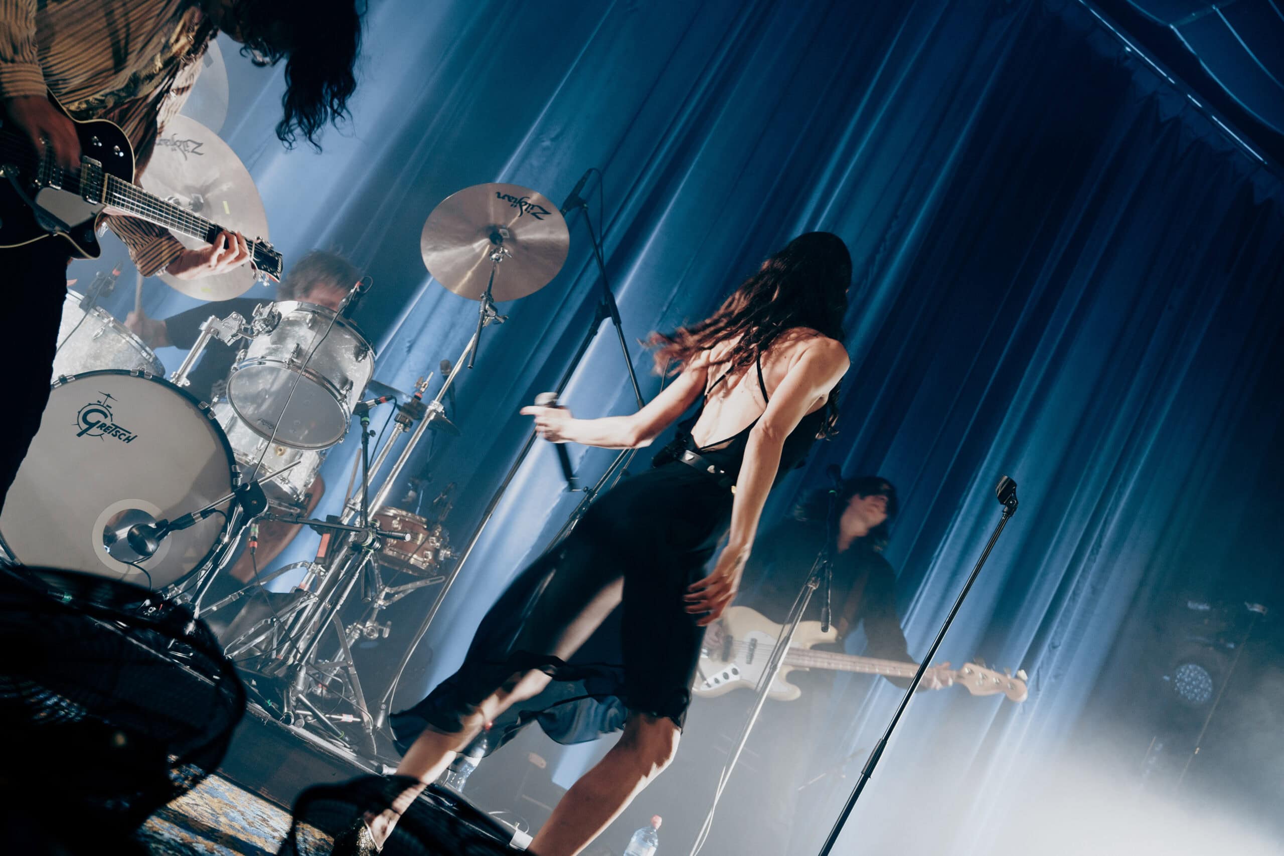 I was at their July 2024 show at Neck of the Woods, and I wasn’t sated. A five-piece again tonight (different bassist?), they’ve got a lot more room onstage this time, The Hollywood is a definite step up. Nina Cristante is wearing vintage Karangahape Road, shall I say a black 70’s style cocktail party dress, that flows and shimmers, it’s a contrast to their down-played image in 2024, tonight’s show is already feeling like a concert experience, rather than a club date.