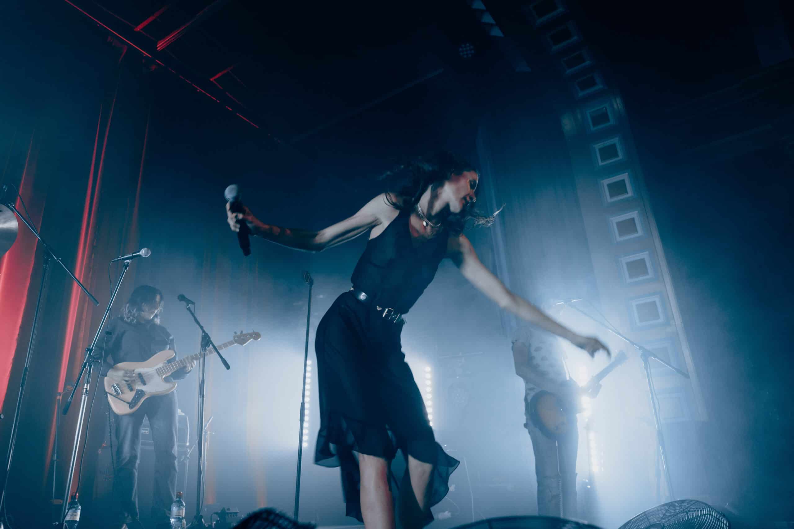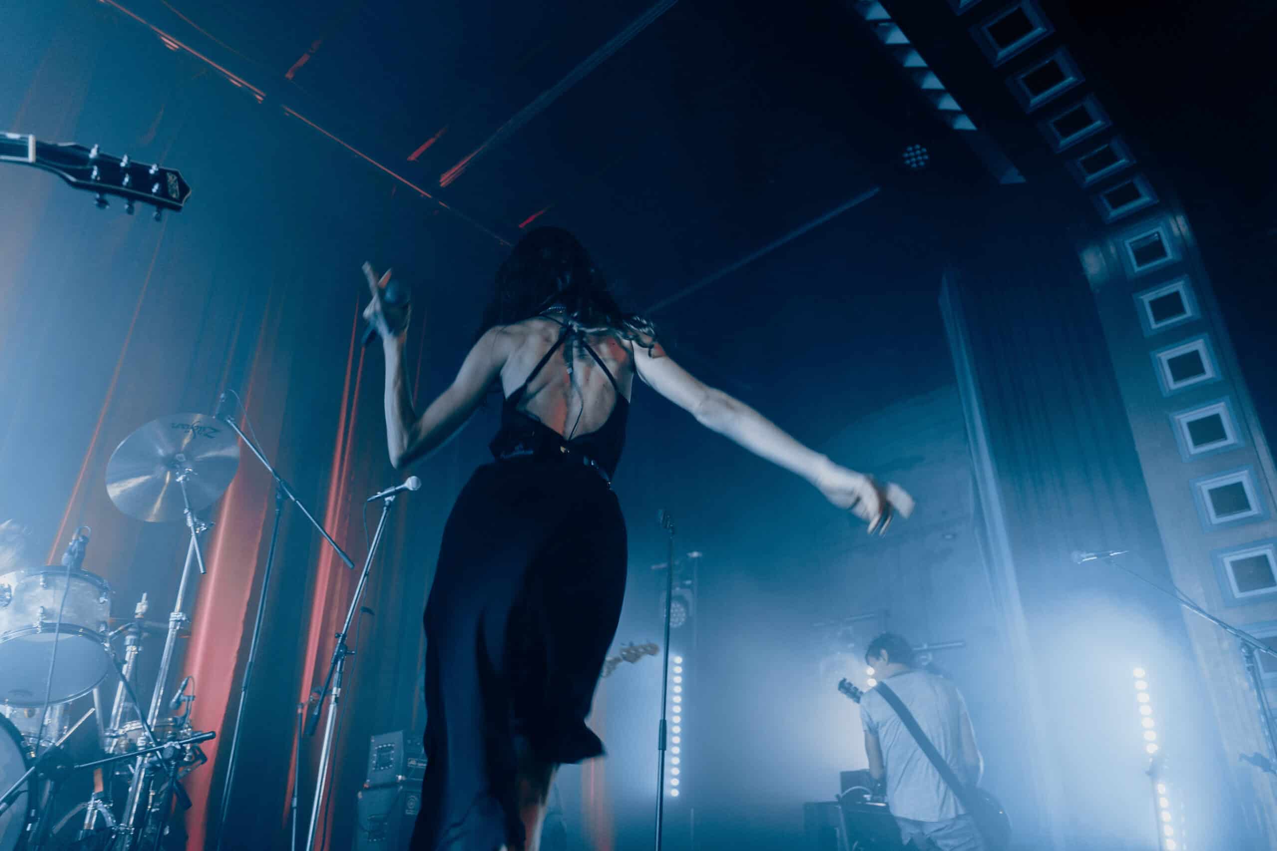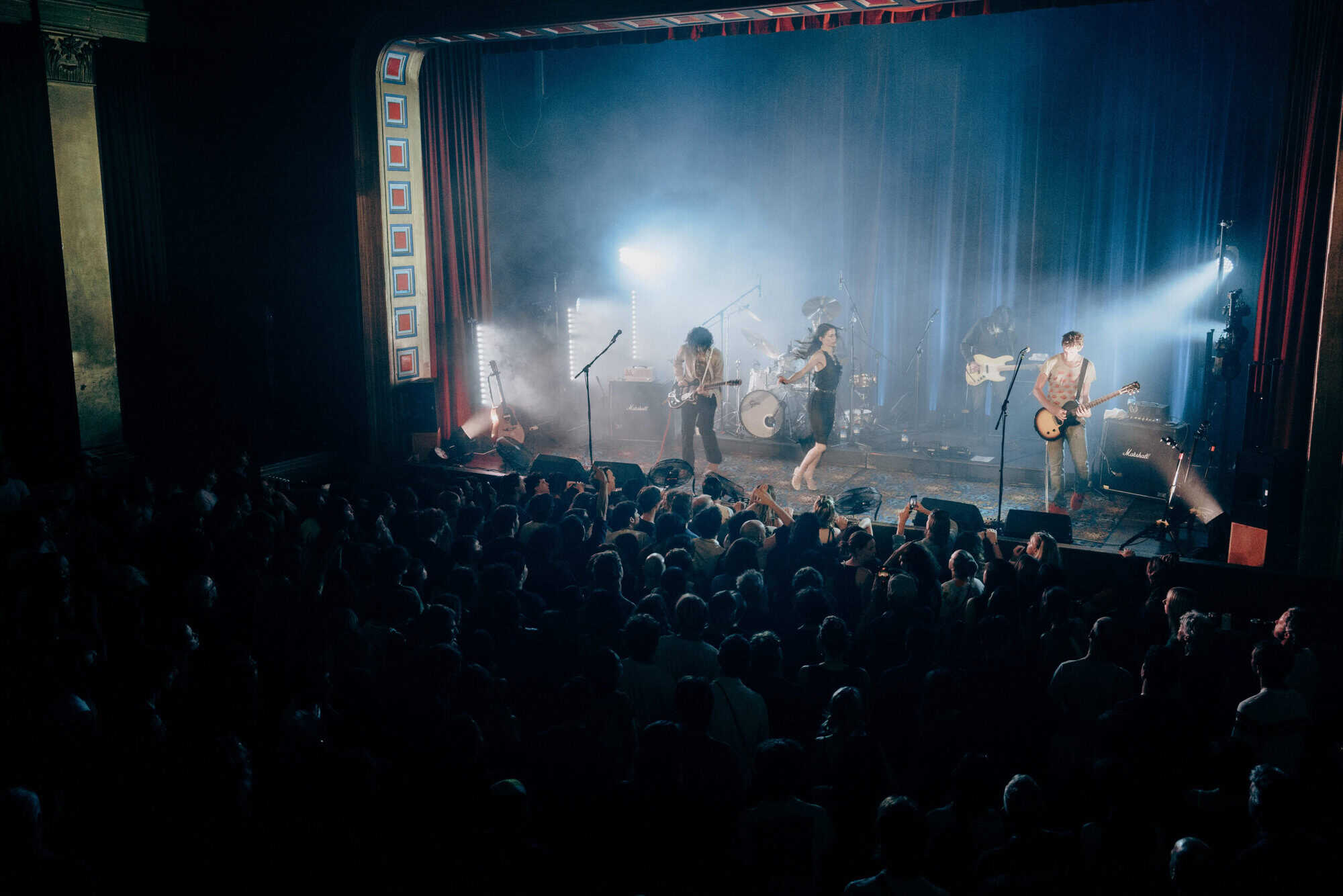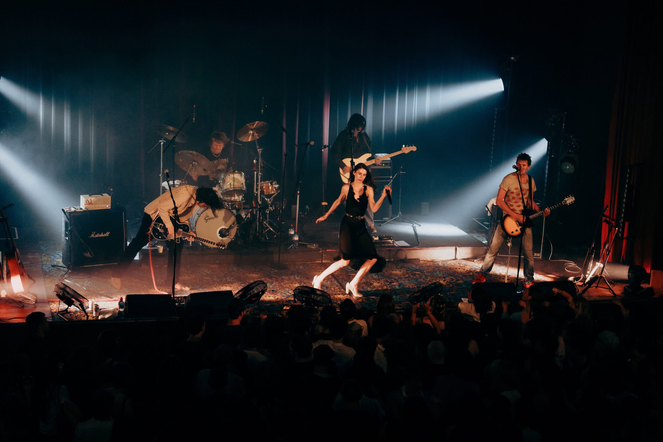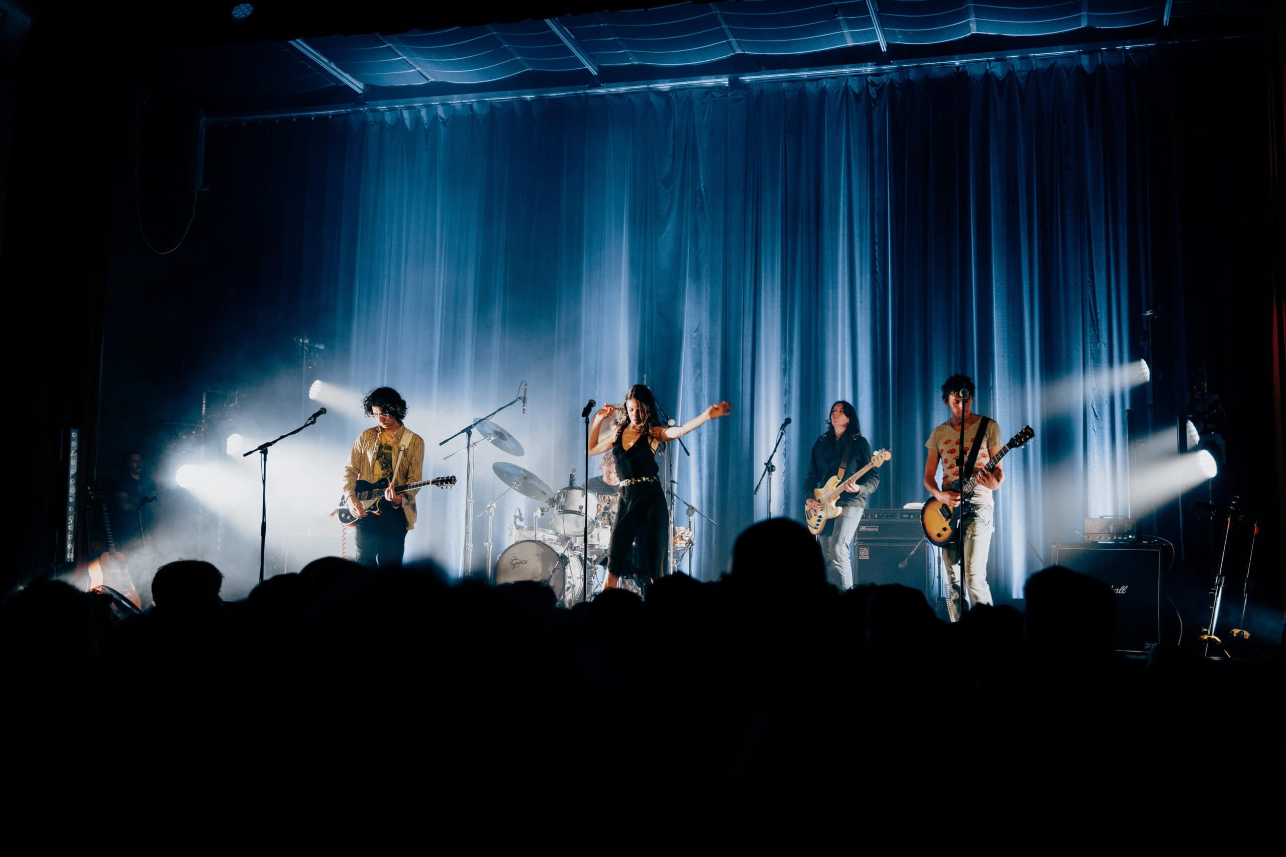 I was at their July 2024 show at Neck of the Woods, and I wasn’t sated. A five-piece again tonight (different bassist?), they’ve got a lot more room onstage this time, The Hollywood is a definite step up. Nina Cristante is wearing vintage Karangahape Road, shall I say a black 70’s style cocktail party dress, that flows and shimmers, it’s a contrast to their down-played image in 2024, tonight’s show is already feeling like a concert experience, rather than a club date.
