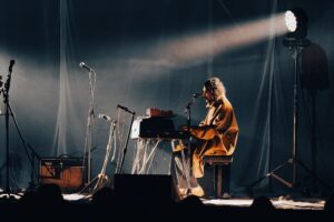 The opening act found Bic seated behind a drum kit as she tapped away…and sang a bit…while hubby Kody Nielson played keys and sang lead. The third musician on stage was bassist/keyboard player Cass Basil (also of Tiny Ruins).