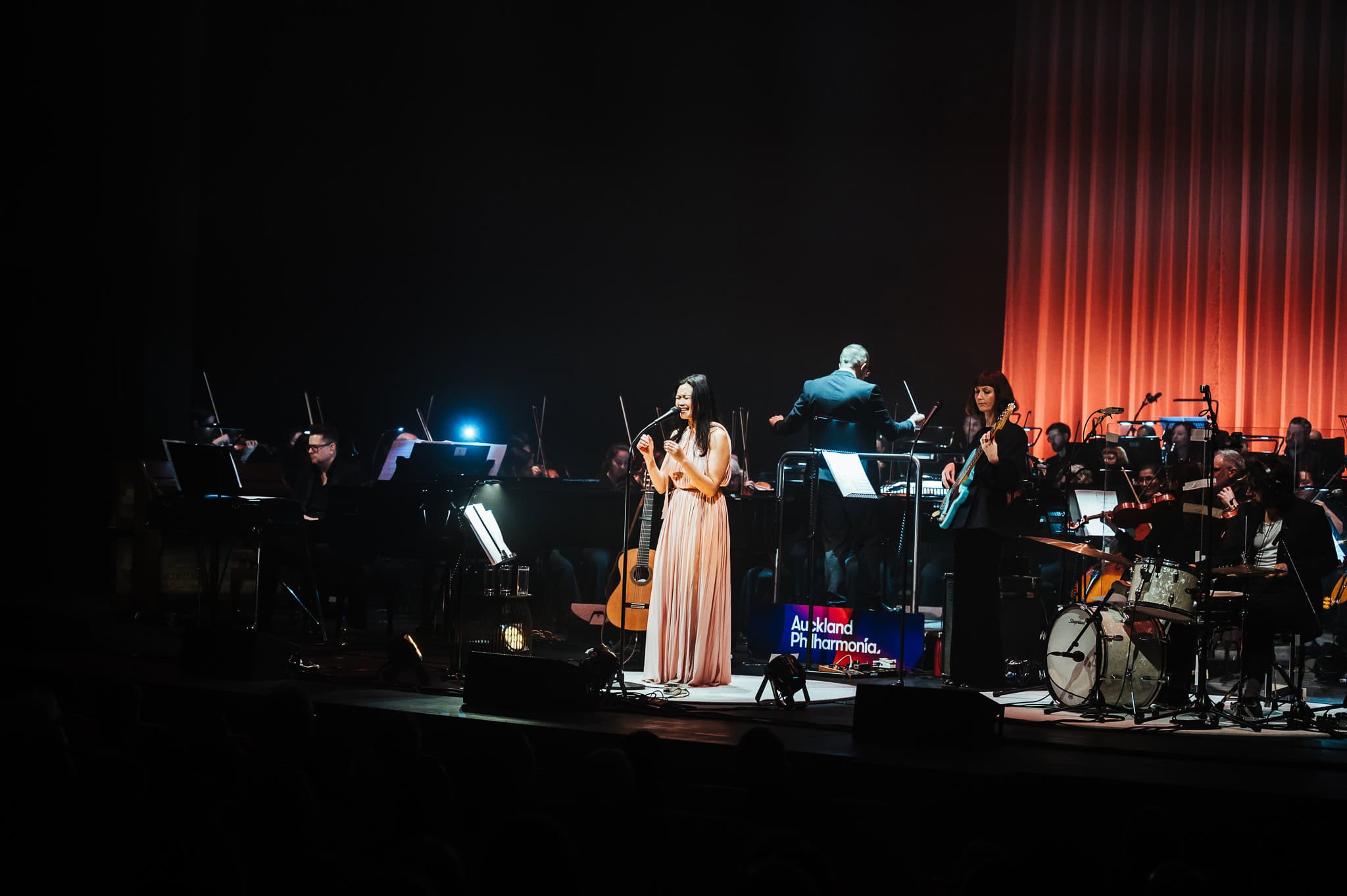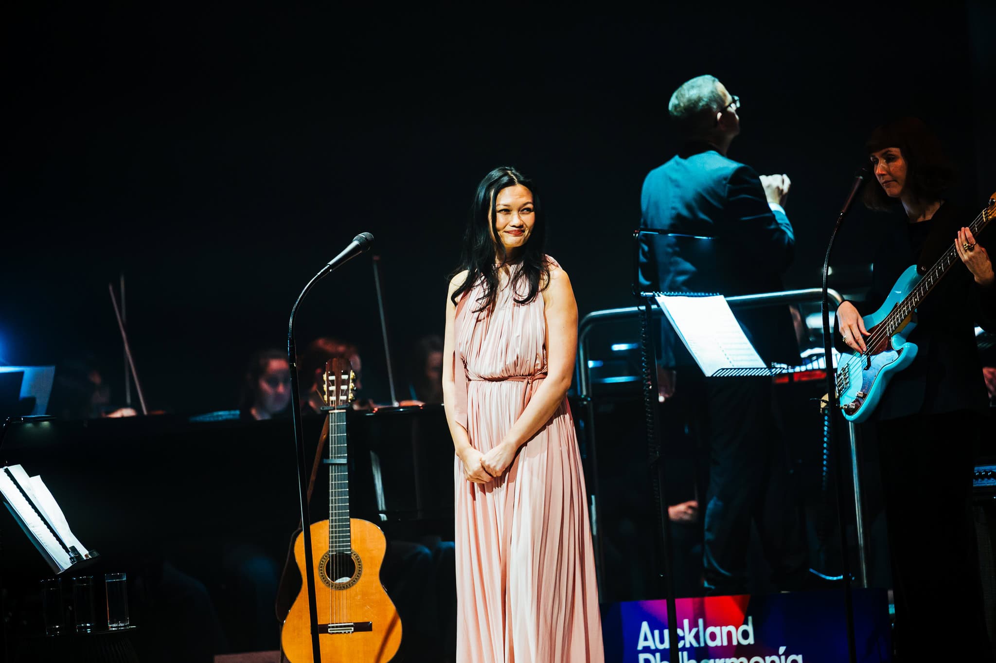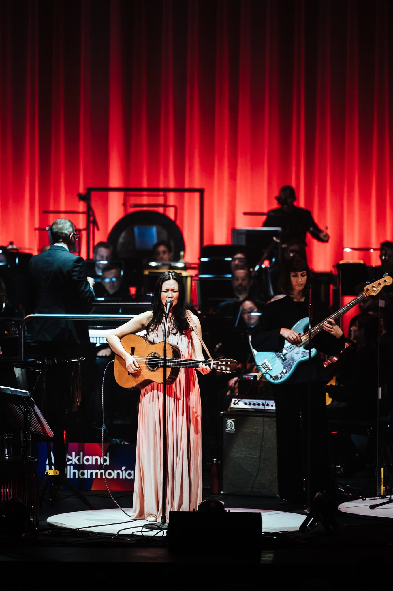 Following these openers, Bic Runga came on stage in a blush pink, full length gown, starting off with Precious Things from 2002’s Beautiful Collision album. It hasn’t dated, still sounding fresh whilst remaining poignant. It was great to have impeccably well balanced sound, ensuring that the Phil didn’t overpower Bic’s vocals and the familiar lyrics were still easy to lose yourself in. Her plaintive delivery and deceptively simple words belie the depth of emotion in Runga’s songs; the list of observations in She Left on a Monday, for example, illustrating that this is poetry and deep feeling set to music.