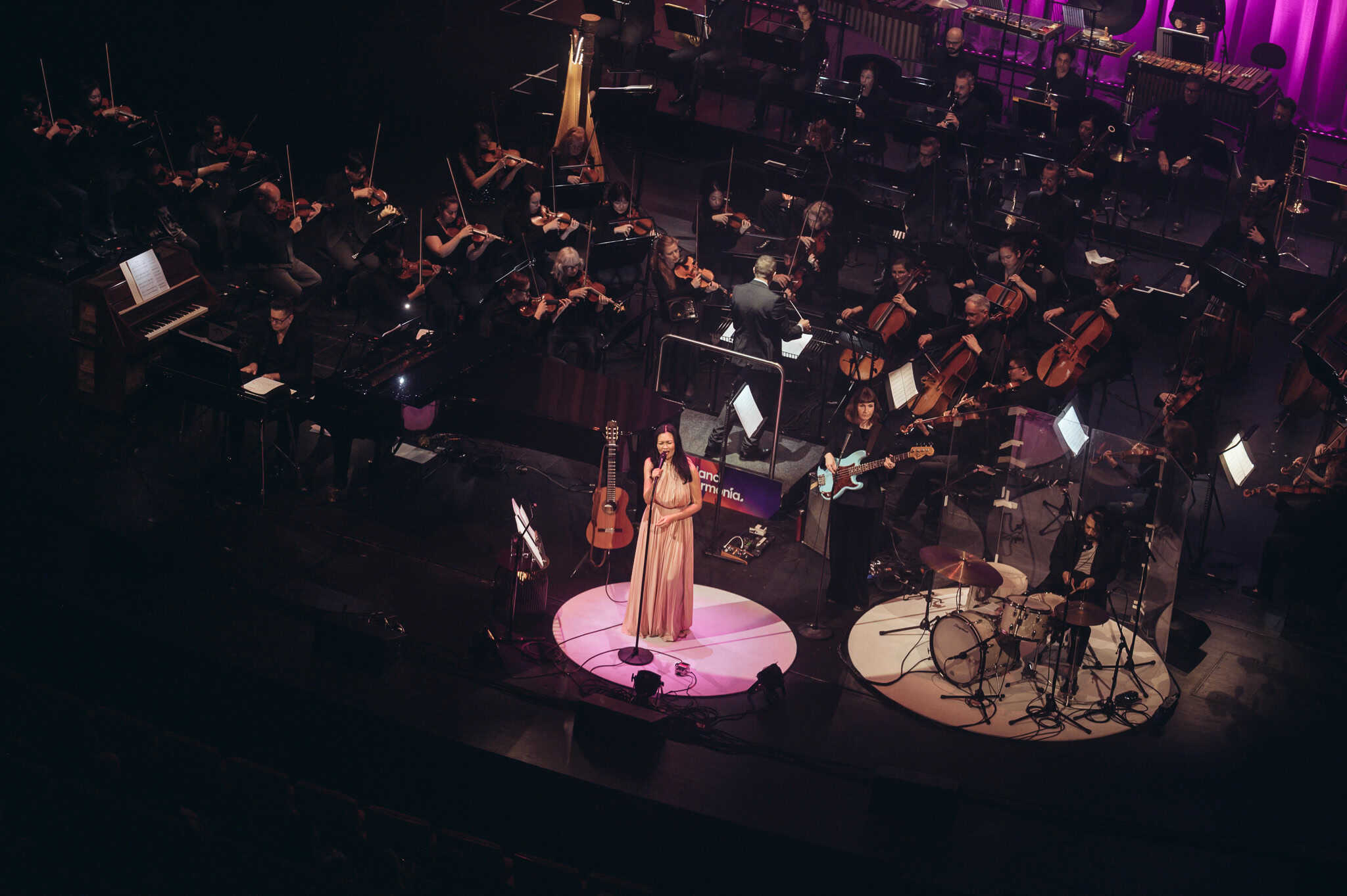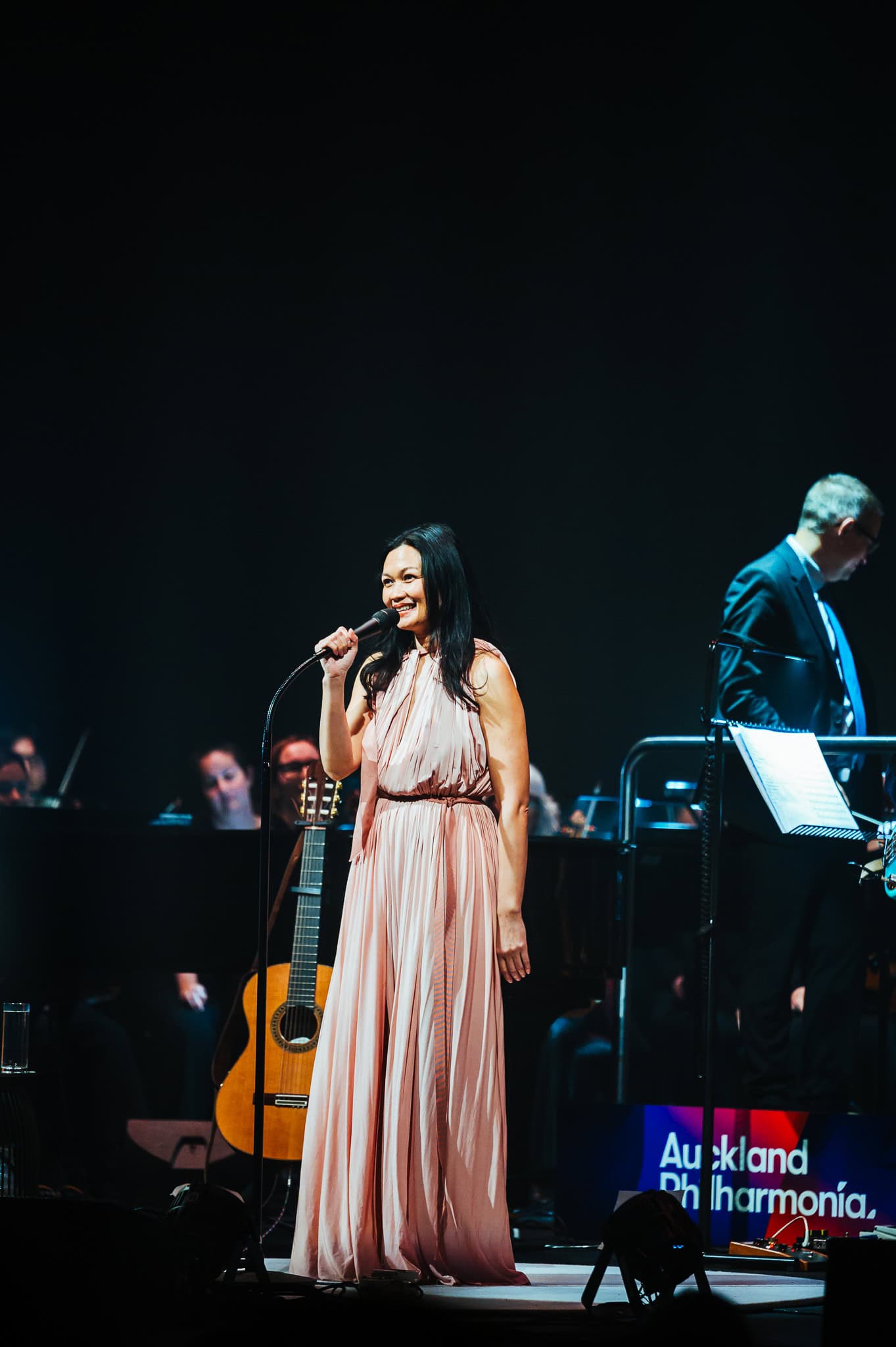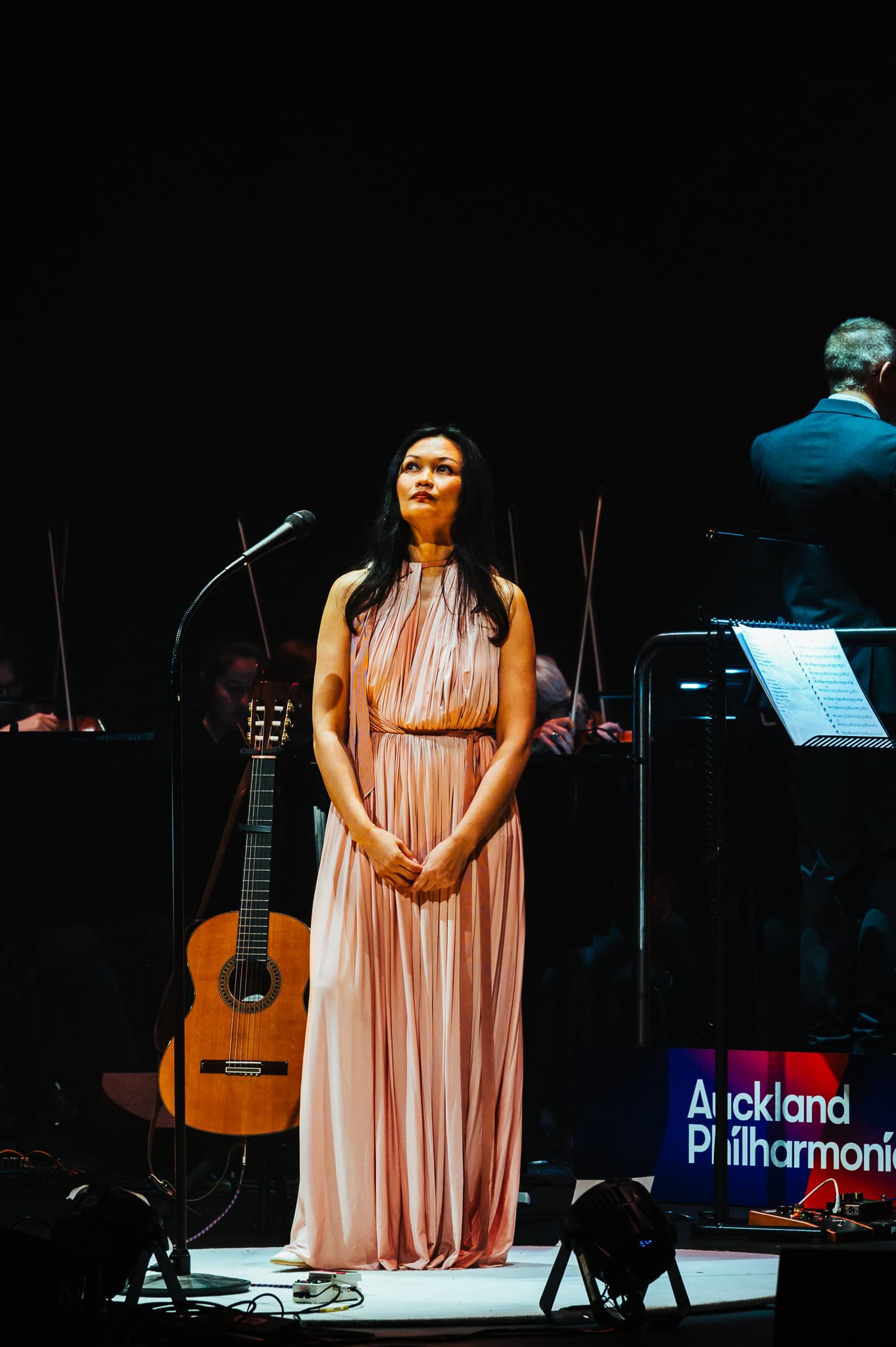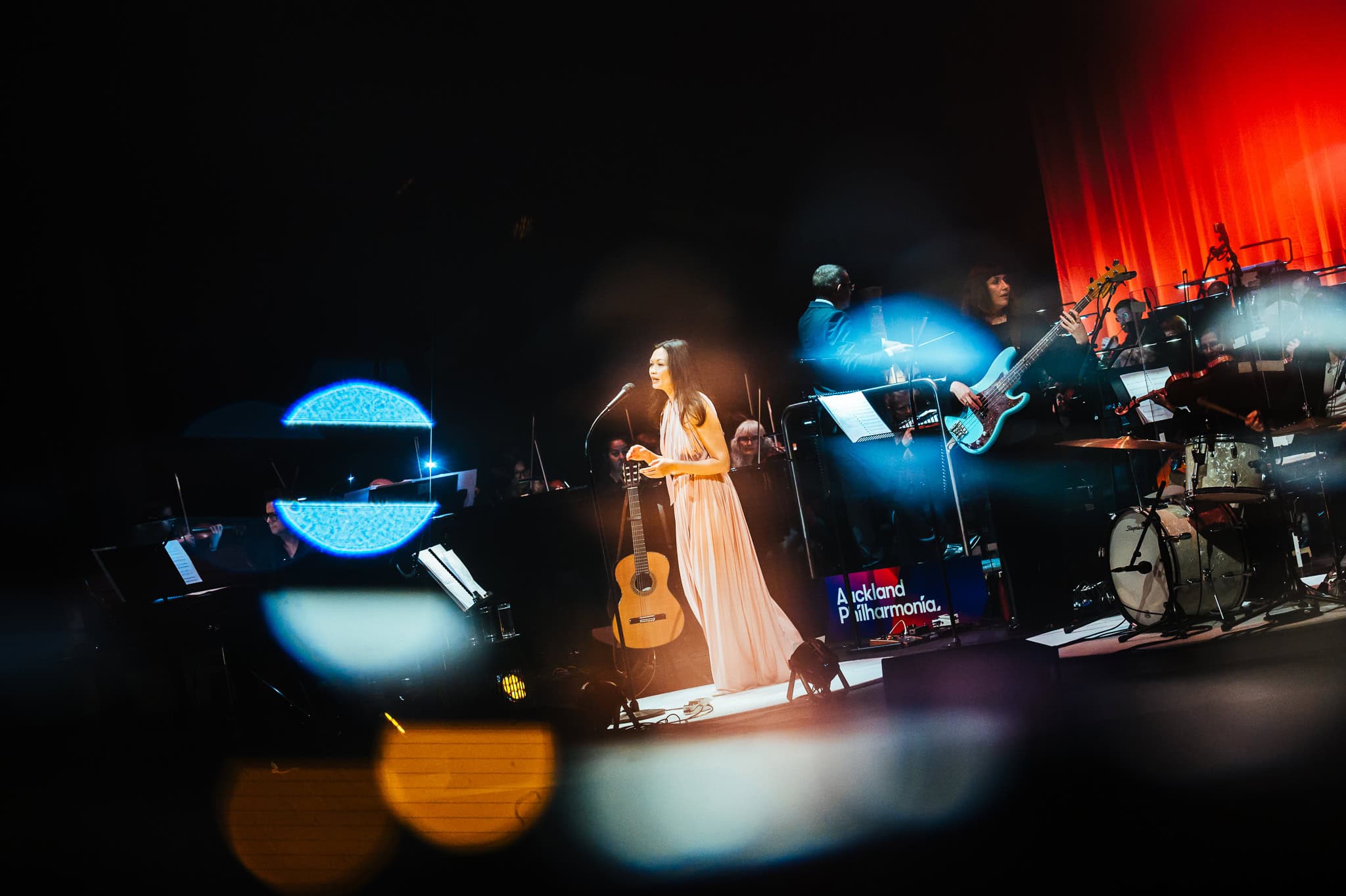 Following these openers, Bic Runga came on stage in a blush pink, full length gown, starting off with Precious Things from 2002’s Beautiful Collision album. It hasn’t dated, still sounding fresh whilst remaining poignant. It was great to have impeccably well balanced sound, ensuring that the Phil didn’t overpower Bic’s vocals and the familiar lyrics were still easy to lose yourself in. Her plaintive delivery and deceptively simple words belie the depth of emotion in Runga’s songs; the list of observations in She Left on a Monday, for example, illustrating that this is poetry and deep feeling set to music.