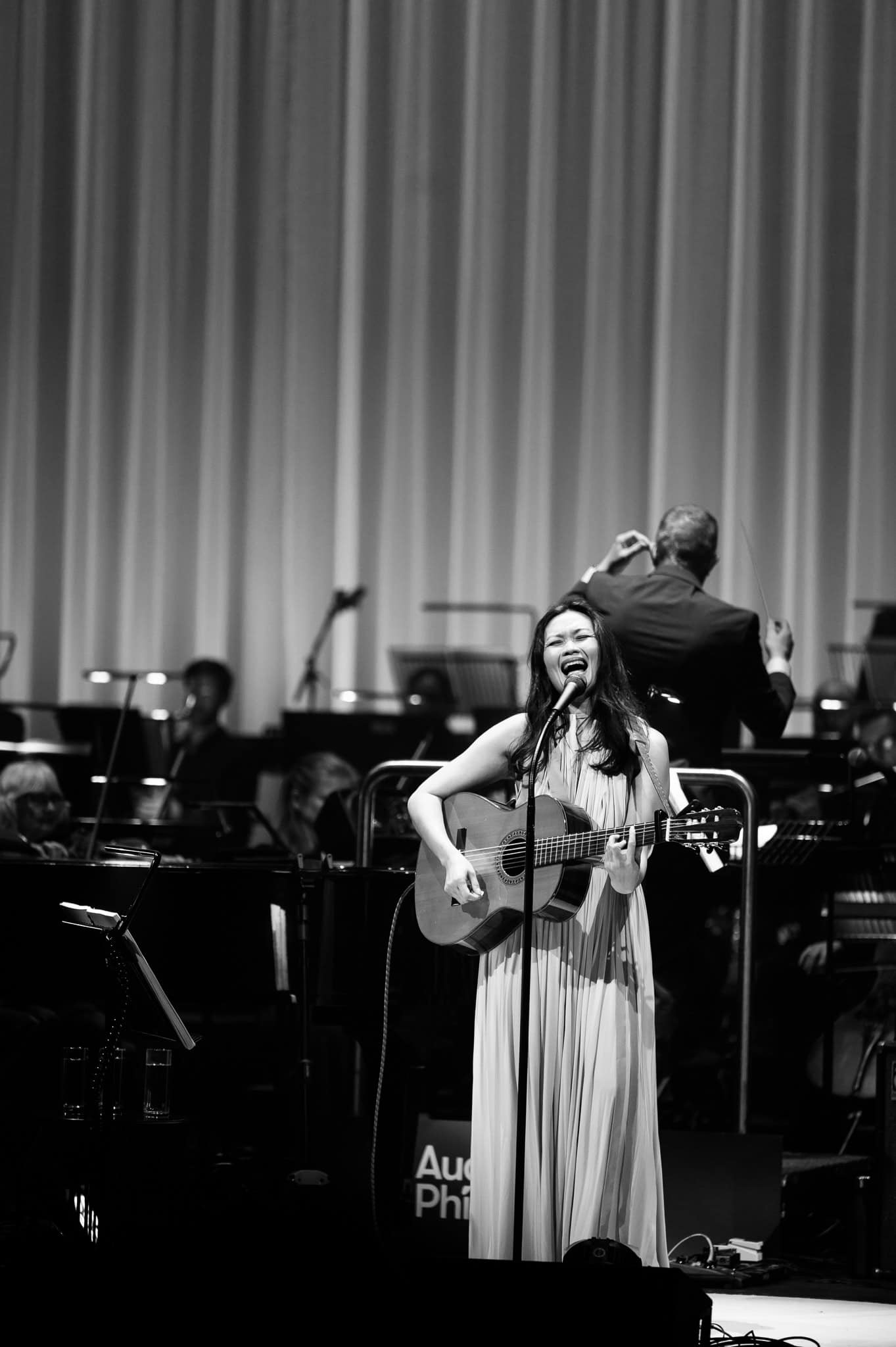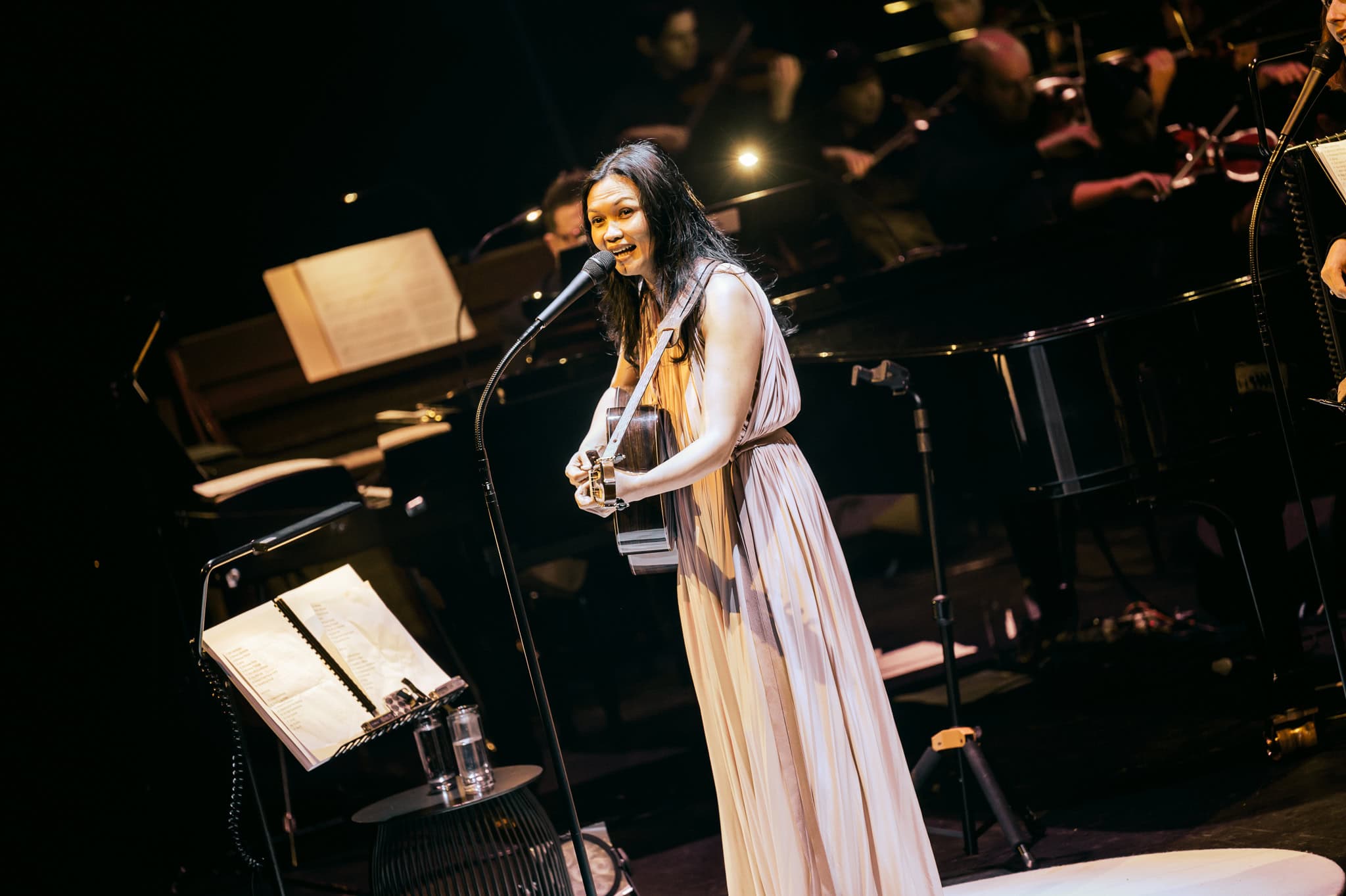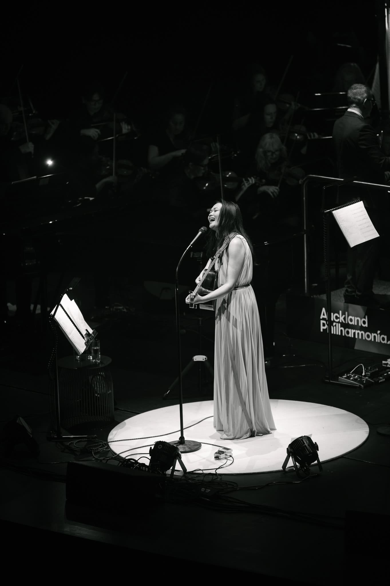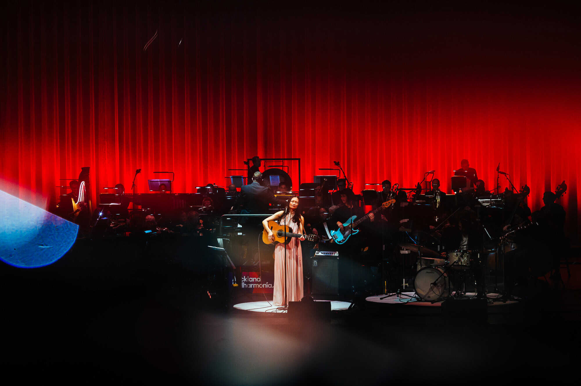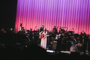 If it wasn’t for the sophistication of the evening and being backed by a full orchestra, she could just have easily delivered these tunes in a folk style, boho-chic and barefoot. Runga stayed true to her origins as a singer-songwriter, taking up her guitar for several songs (including Drive) and opening Listening for the Weather on harmonica, beautifully augmented by the woodwind and brass sections.