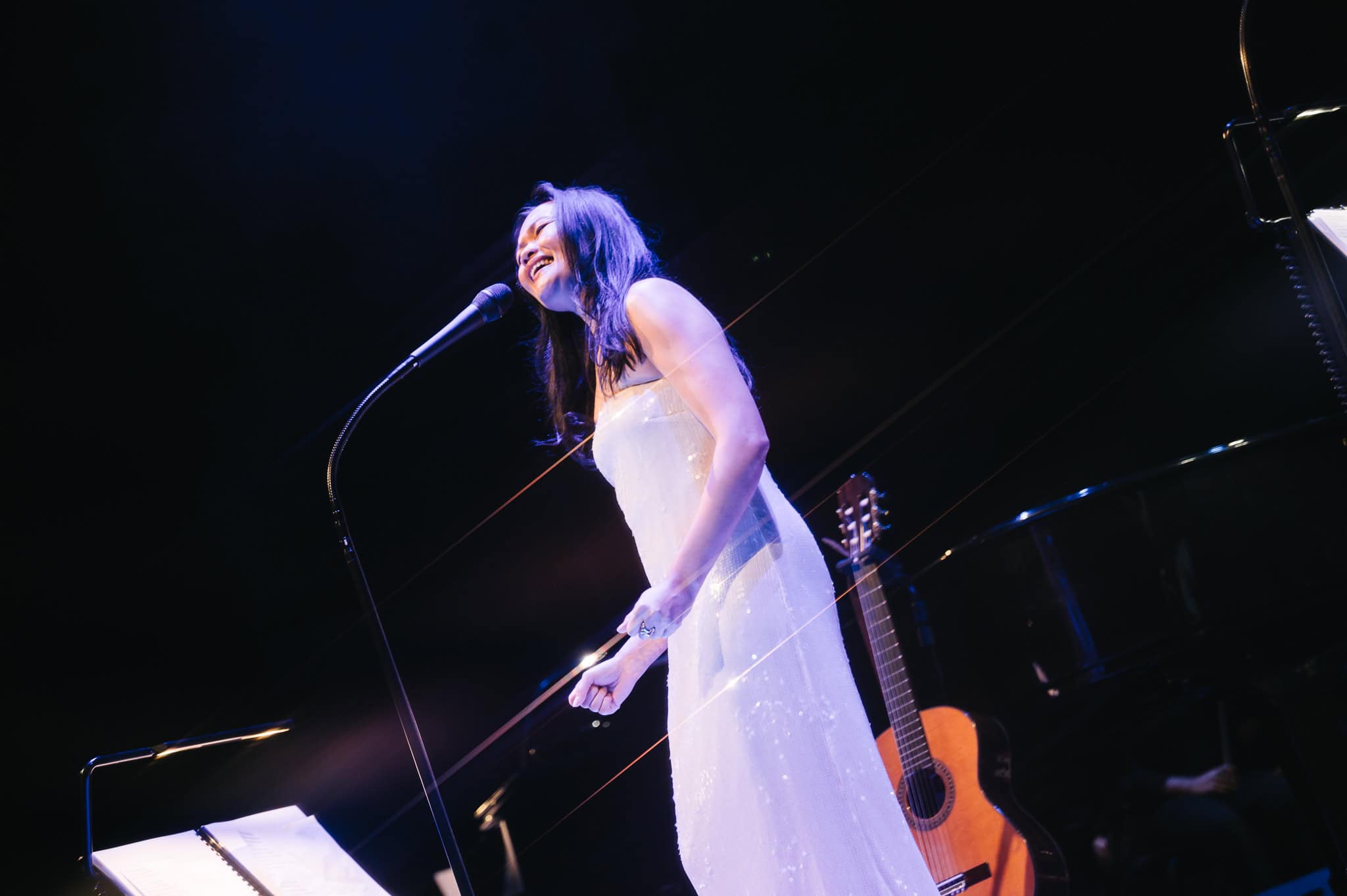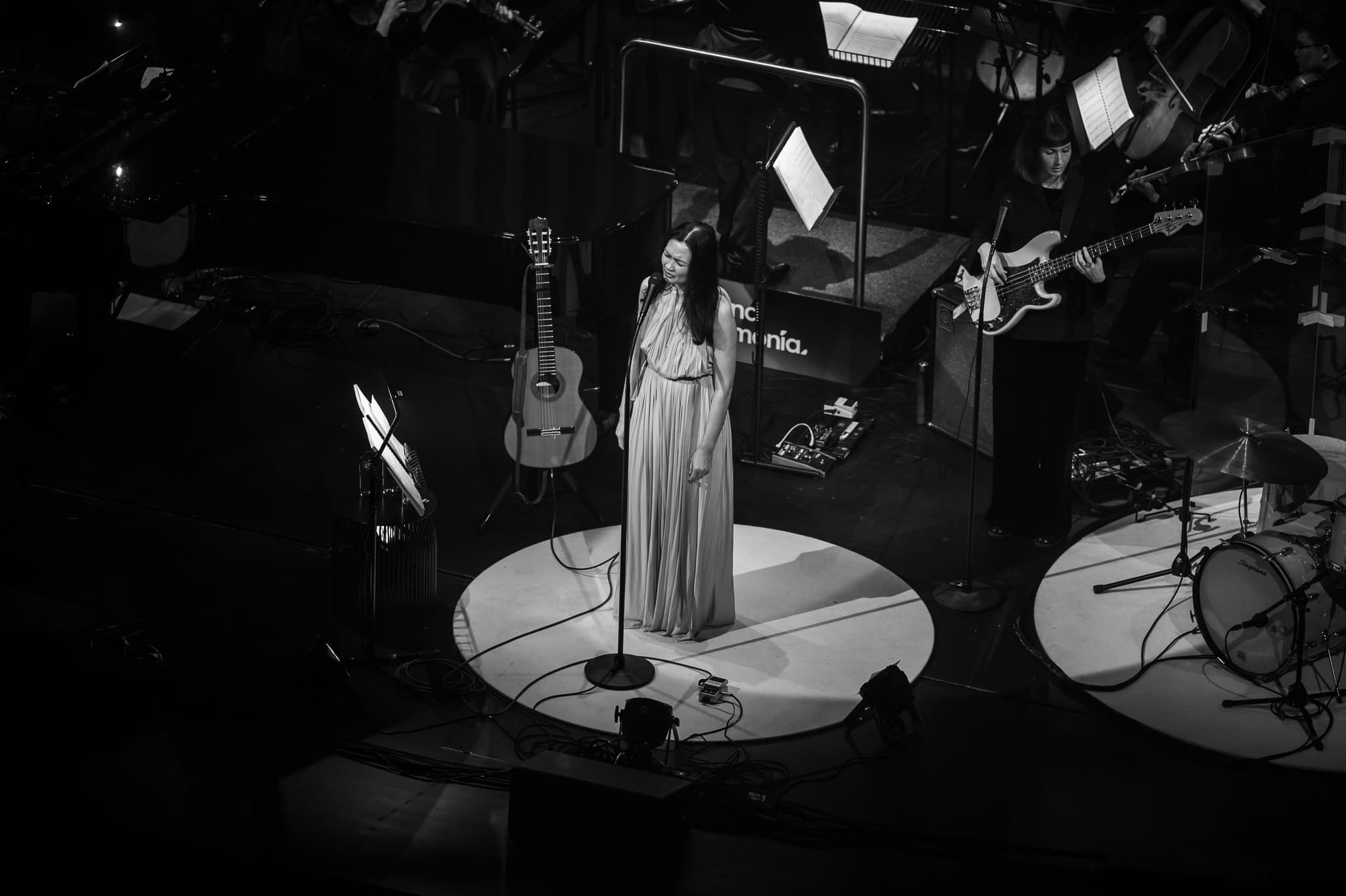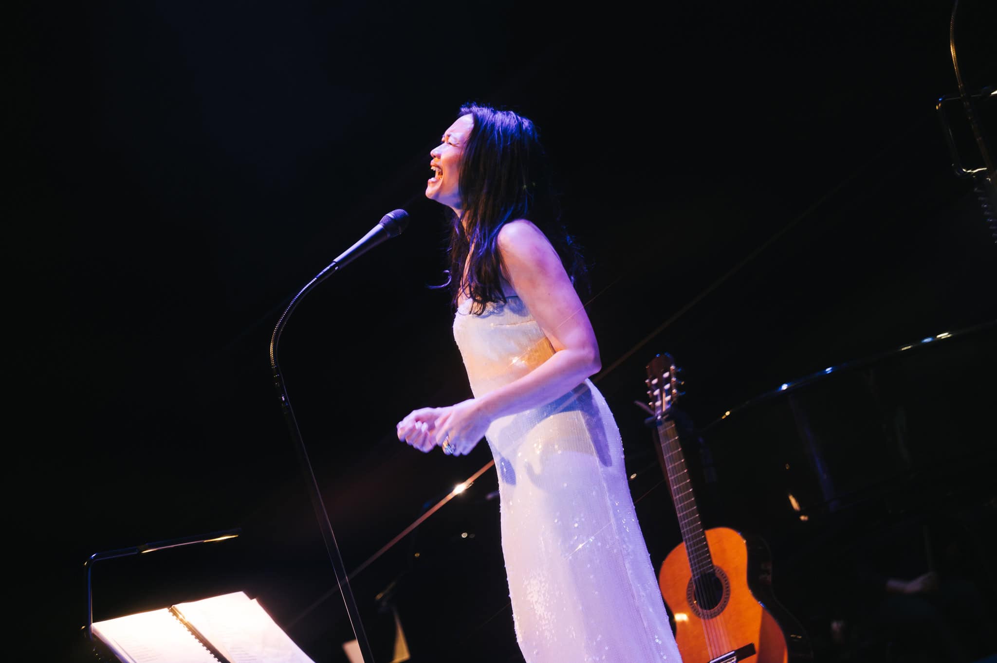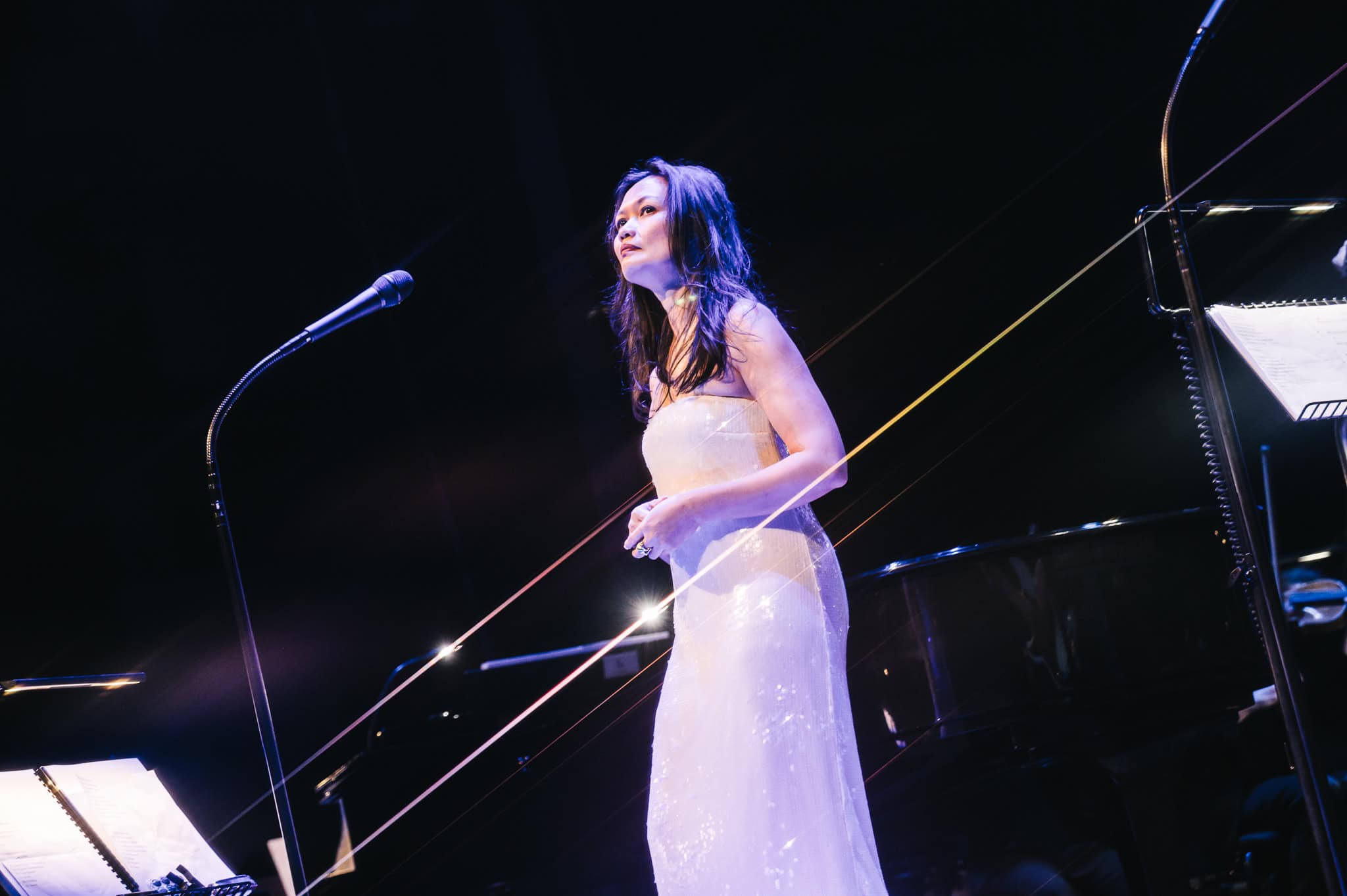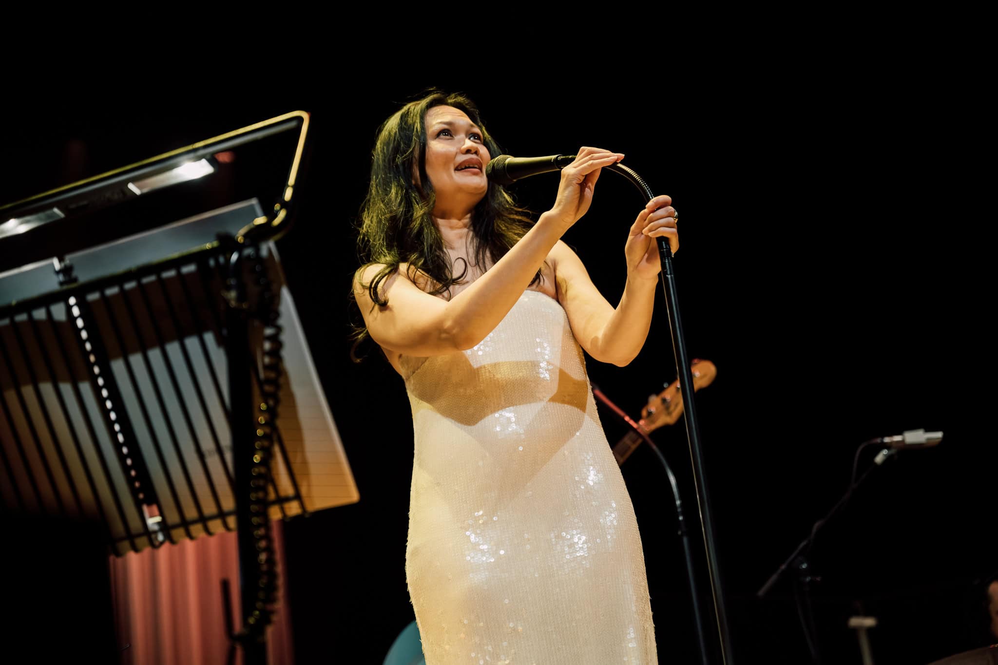 If it wasn’t for the sophistication of the evening and being backed by a full orchestra, she could just have easily delivered these tunes in a folk style, boho-chic and barefoot. Runga stayed true to her origins as a singer-songwriter, taking up her guitar for several songs (including Drive) and opening Listening for the Weather on harmonica, beautifully augmented by the woodwind and brass sections.