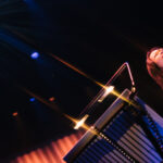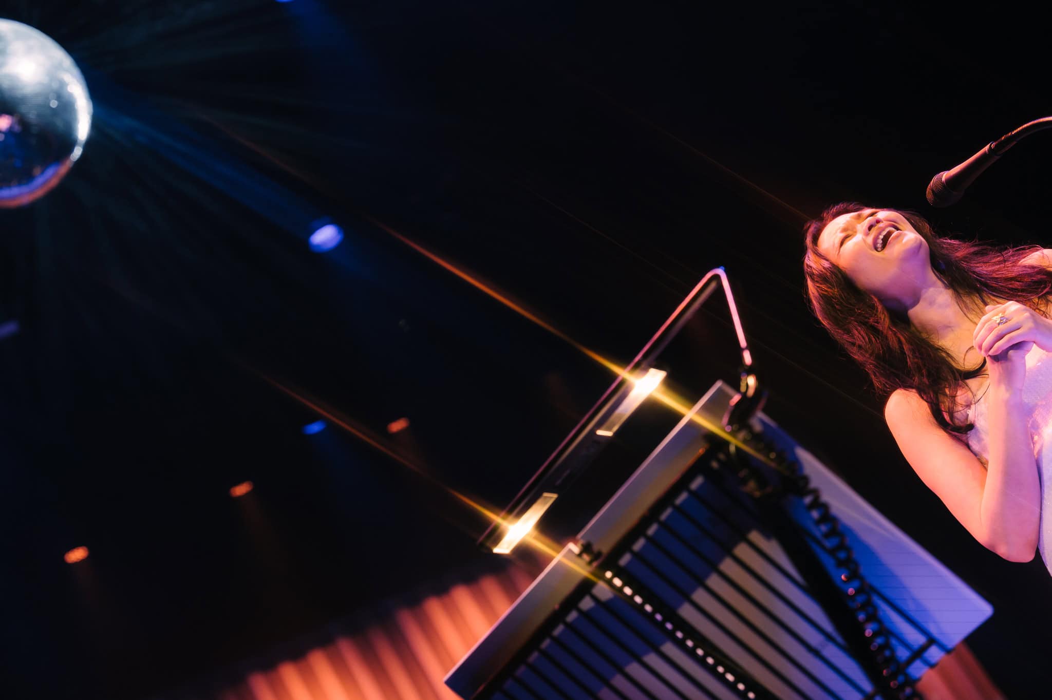 Bursting Through, from Bic’s debut album, Drive, commenced with a heavy drum intro. At times, Nielson seemed to be channelling Dave Grohl – all dark hair and frenzied stickwork. This was particularly apparent in another of Nielson’s “birthday” tributes which followed the interval, with quirky orchestration to launch the second half. He invited the audience to “feel free to get up for this one!” but didn’t seem to be taken up on the offer, despite the funky high hat beats. It wasn’t really a dancing kind of night… more a melodic meander through meaningful melodies. Runga changed into a shimmering, sequinned sheath dress for the second half, adding to the spinning glitterball for a Sixties lounge singer vibe.