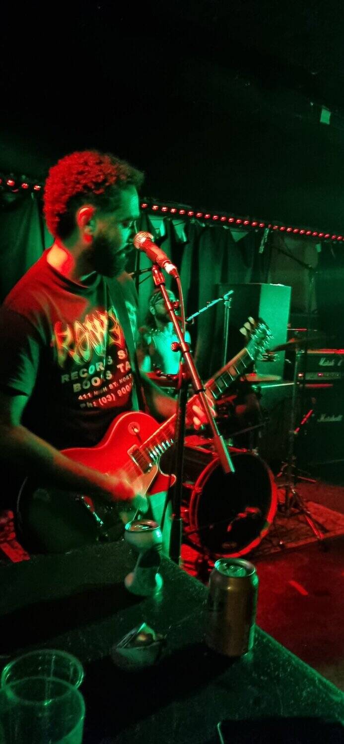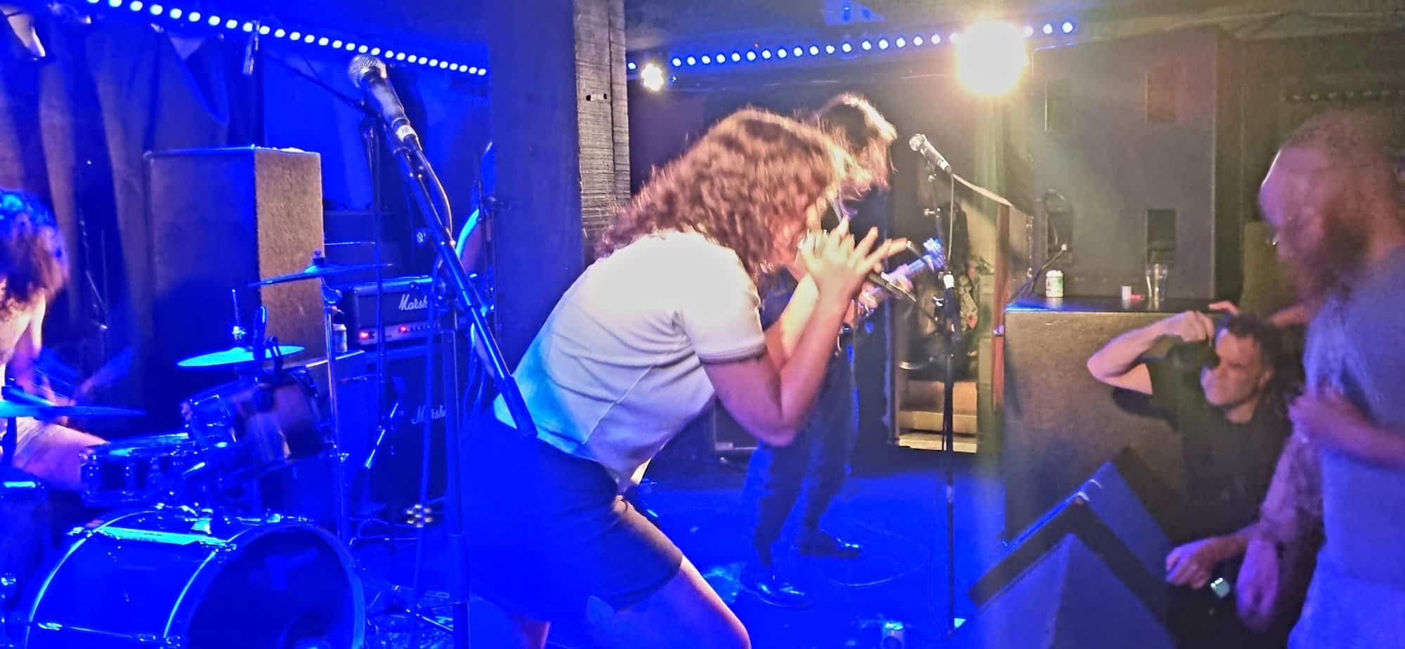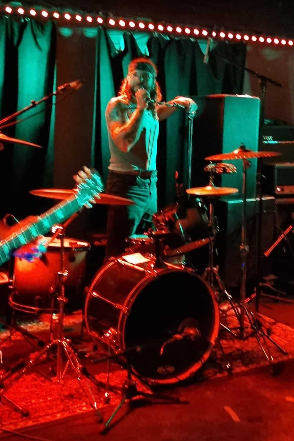 C.O.F.F.I.N. are careering between the classic Australian punk of Radio Birdman and Celebite Rifles, bordering on early AC/DC, fringe-benefiting from Cosmic Psychos, all in a neoteric pastiche delivery of metal, hardcore, and rock. Whilst Ben Portnoy dominates the korero, he is ably supported by rua of the other band’s members, thus Portnoy is freed in moments to exude passion on the drums, and outstandingly whip the crowd up, on a ratu night gig.