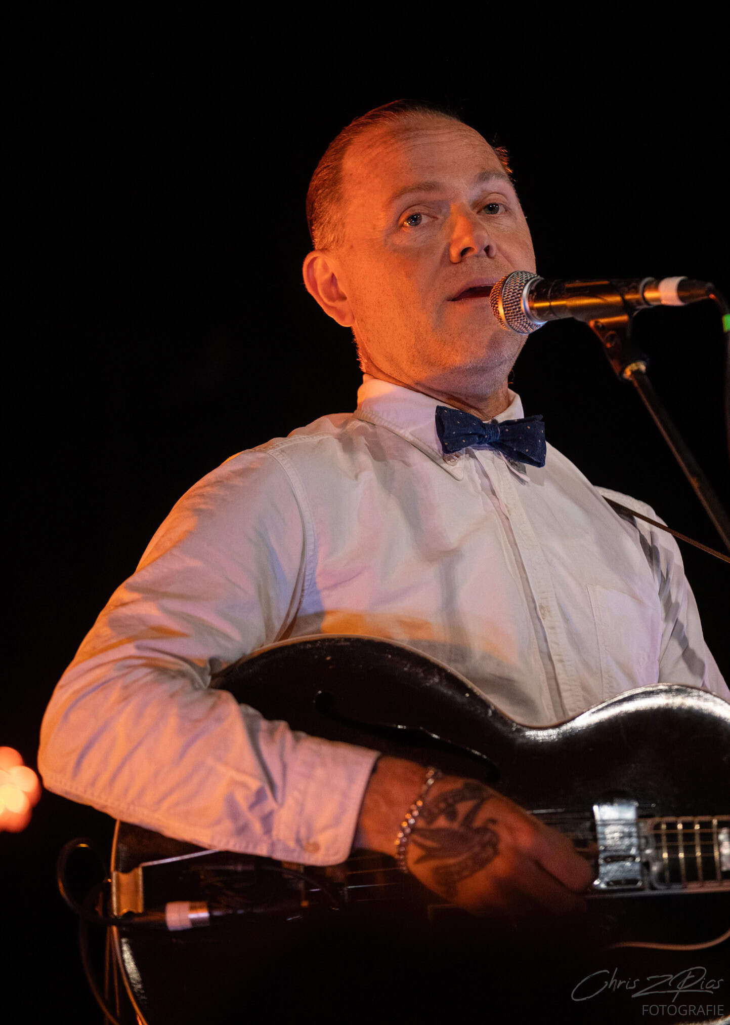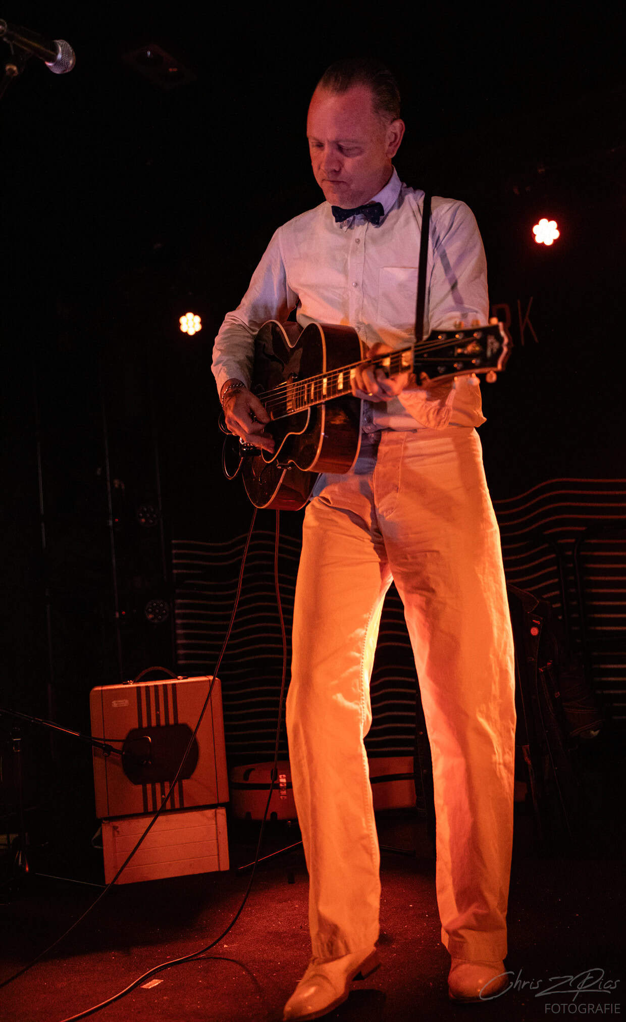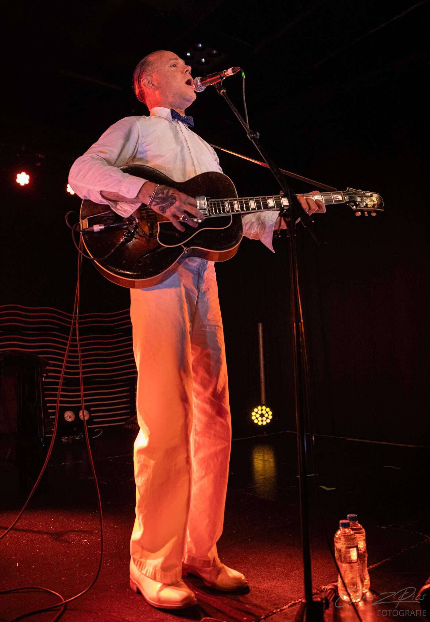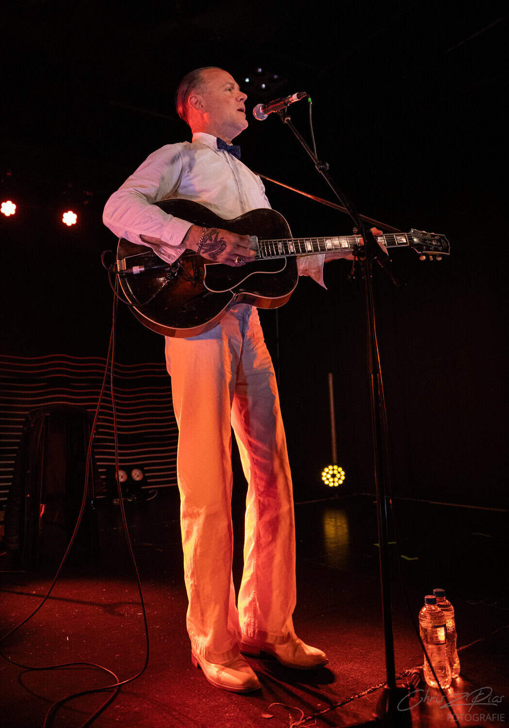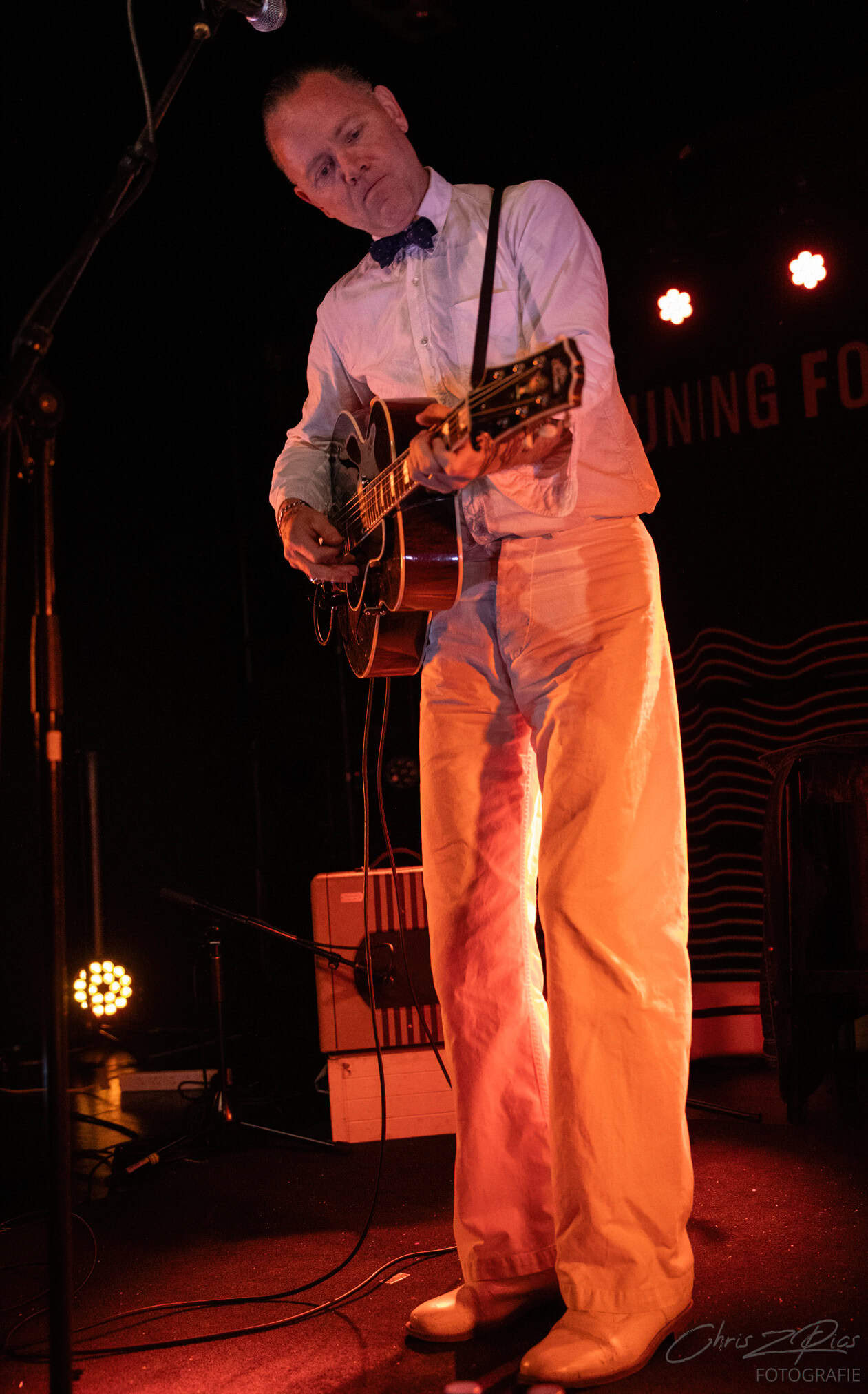 Intrigue follows C.W. Stoneking onto the stage at a welcome midweek early start time. To background Mississippi blues on the PA system, he fixes a string on his Gretsch, removes a blue jacket and saunters to the mic, now in white and a bow tie.
