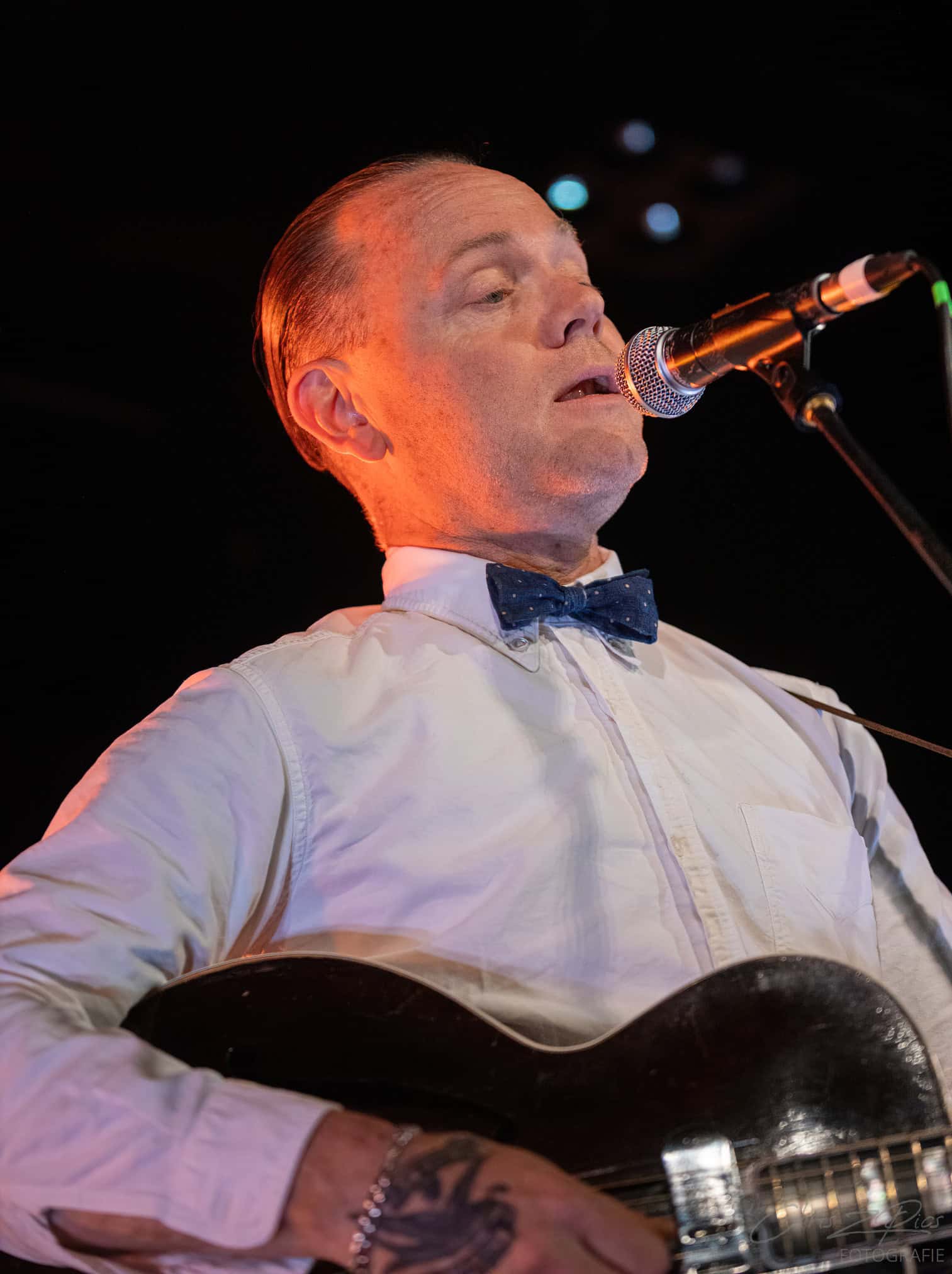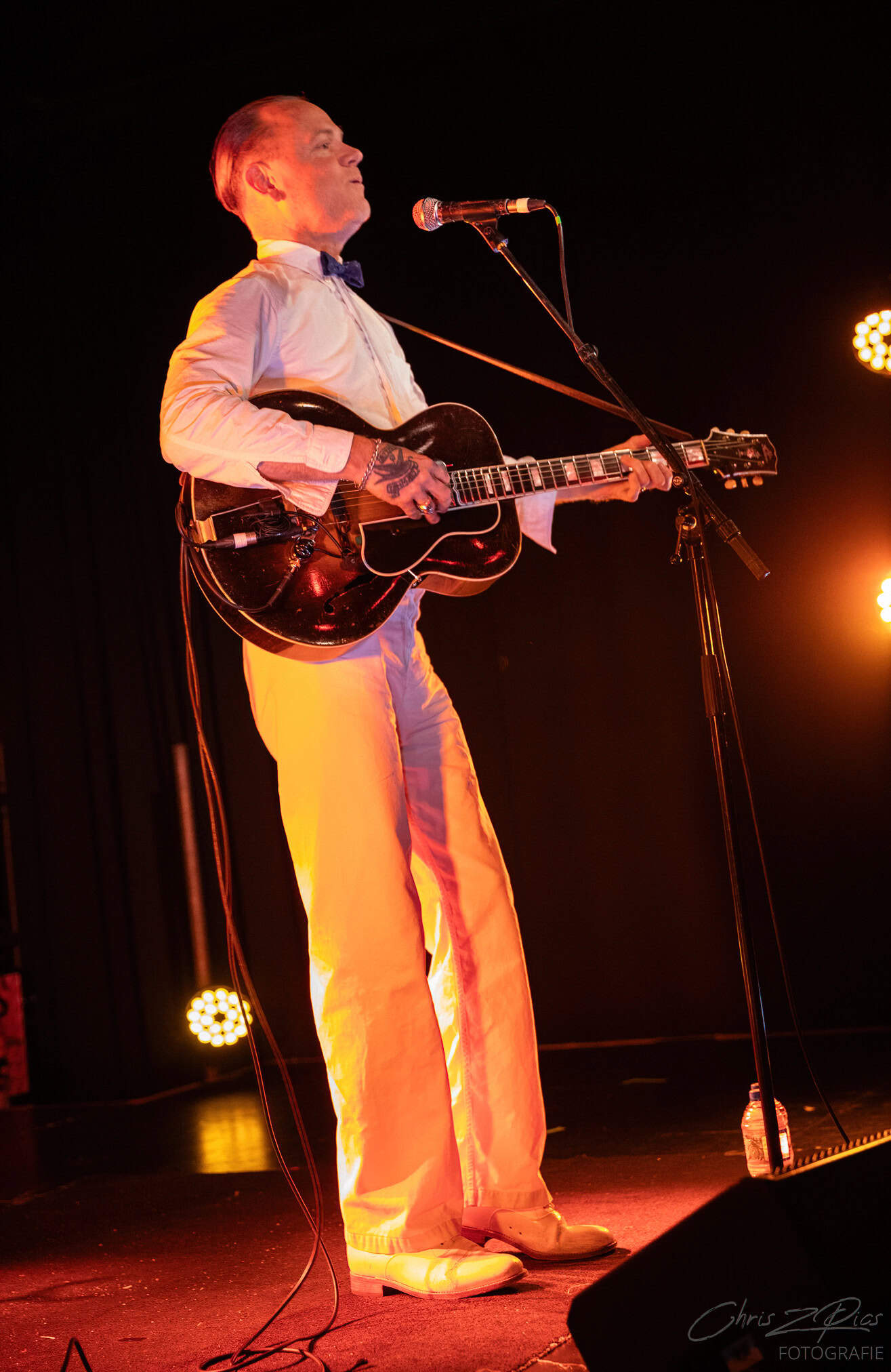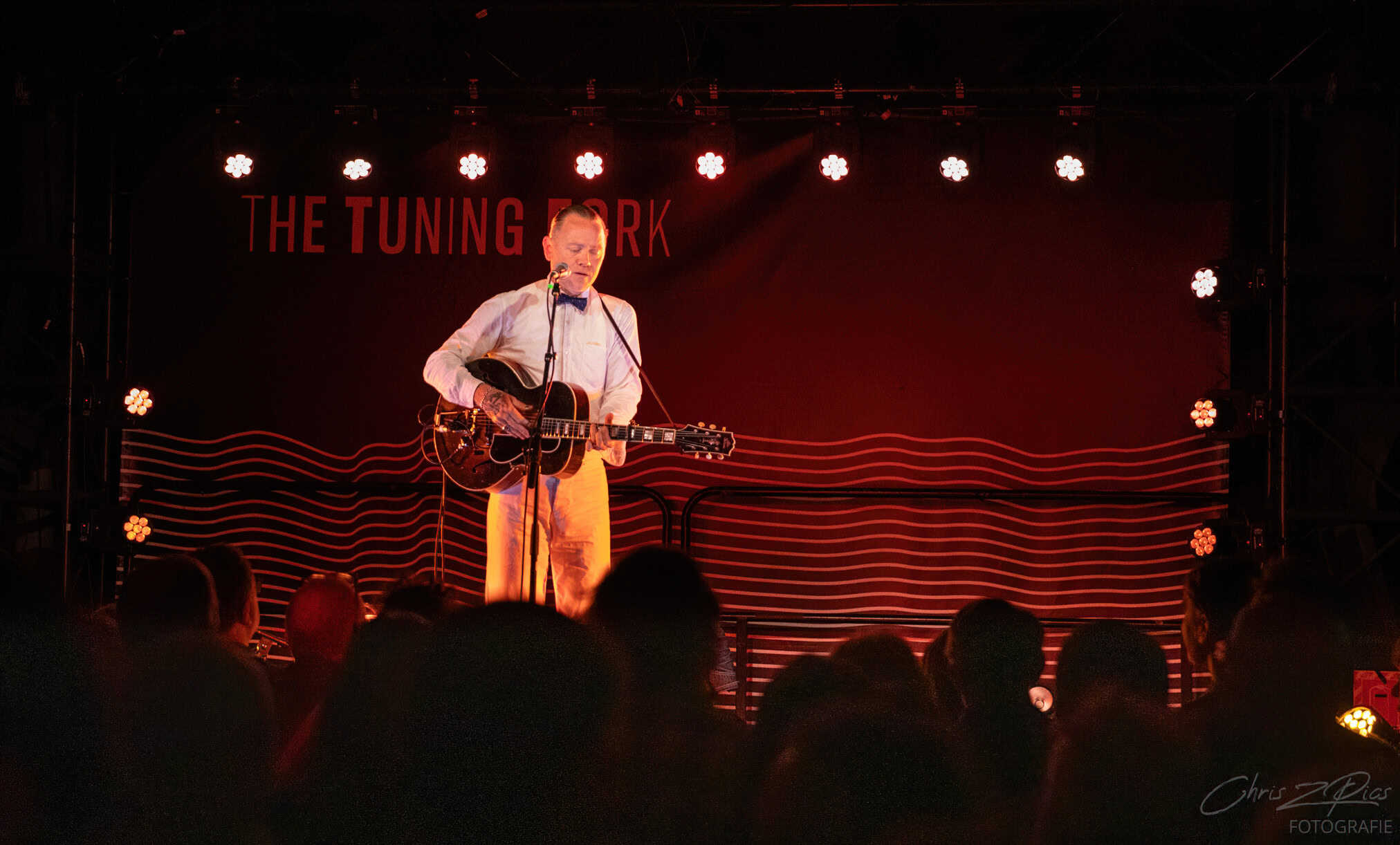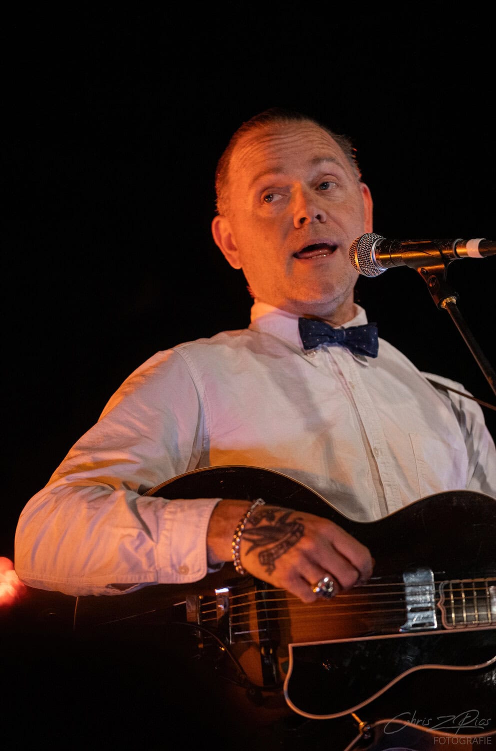 Intrigue follows C.W. Stoneking onto the stage at a welcome midweek early start time. To background Mississippi blues on the PA system, he fixes a string on his Gretsch, removes a blue jacket and saunters to the mic, now in white and a bow tie.