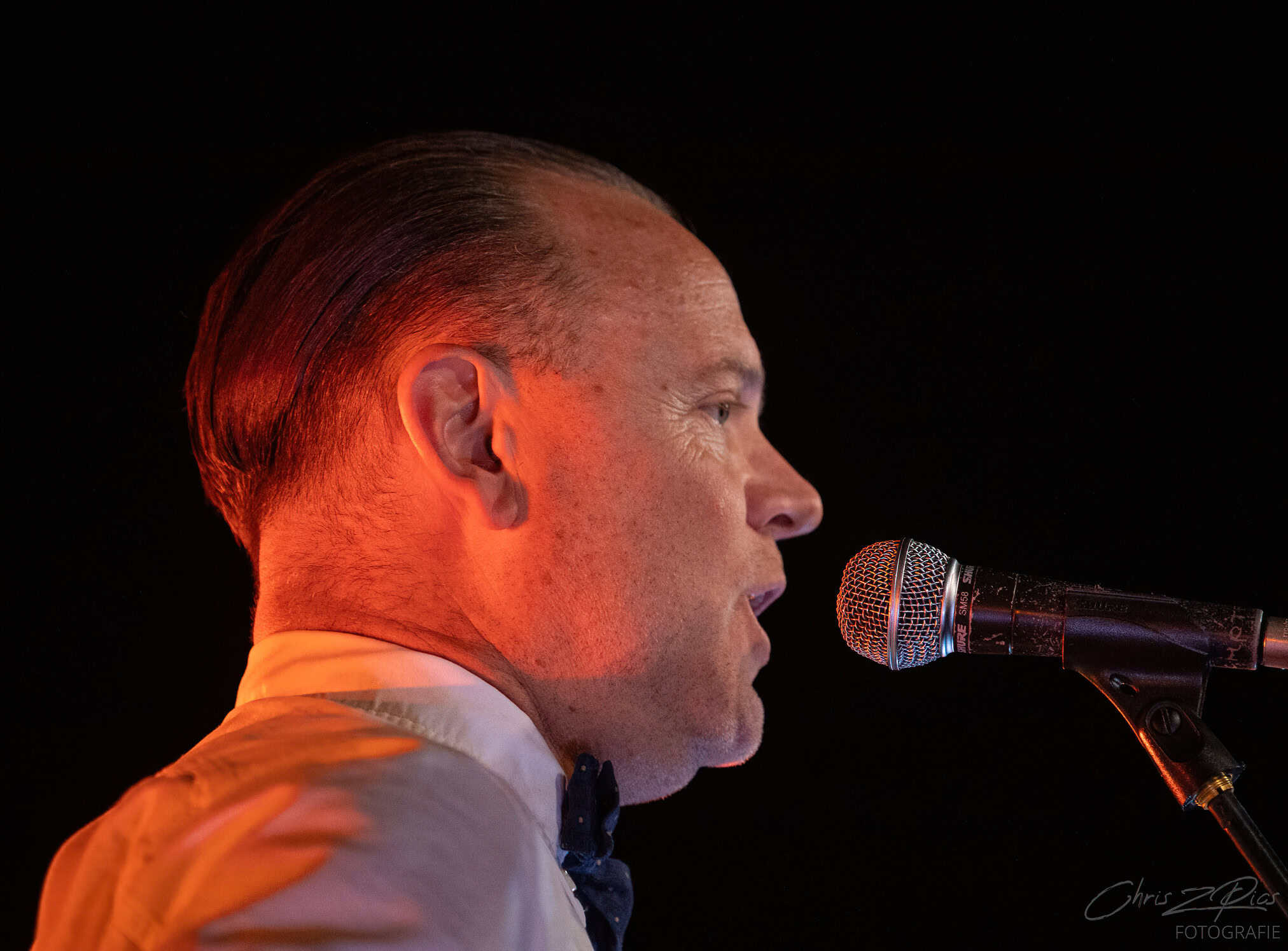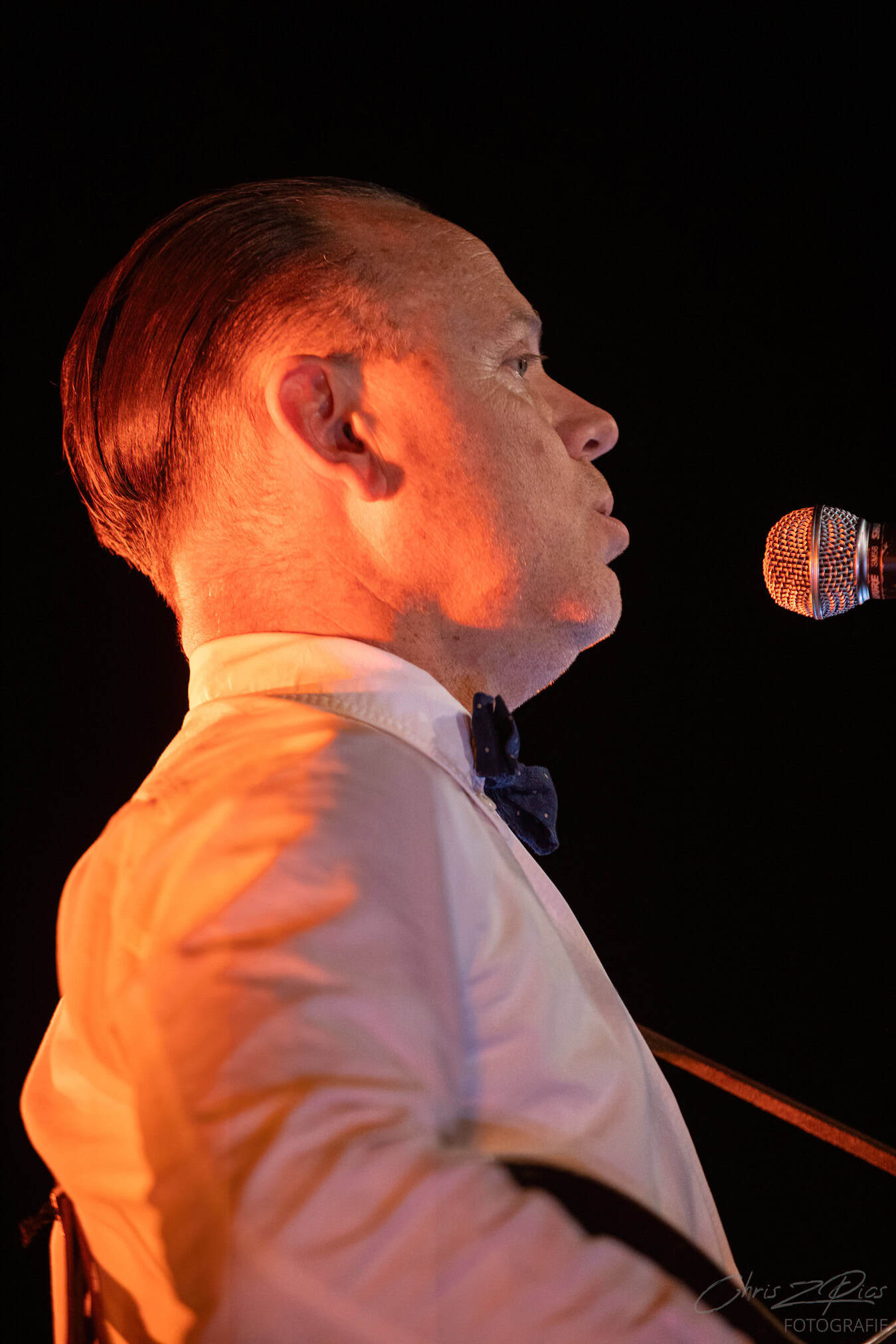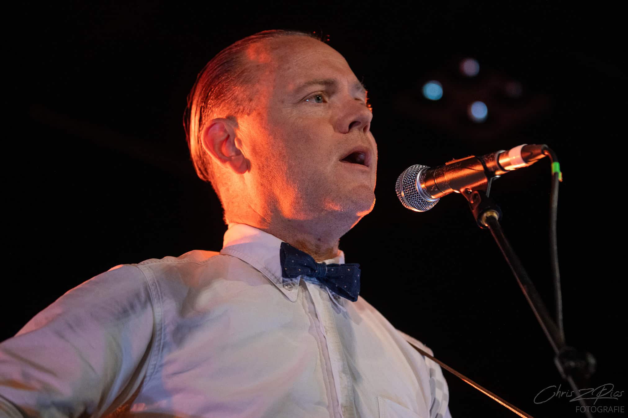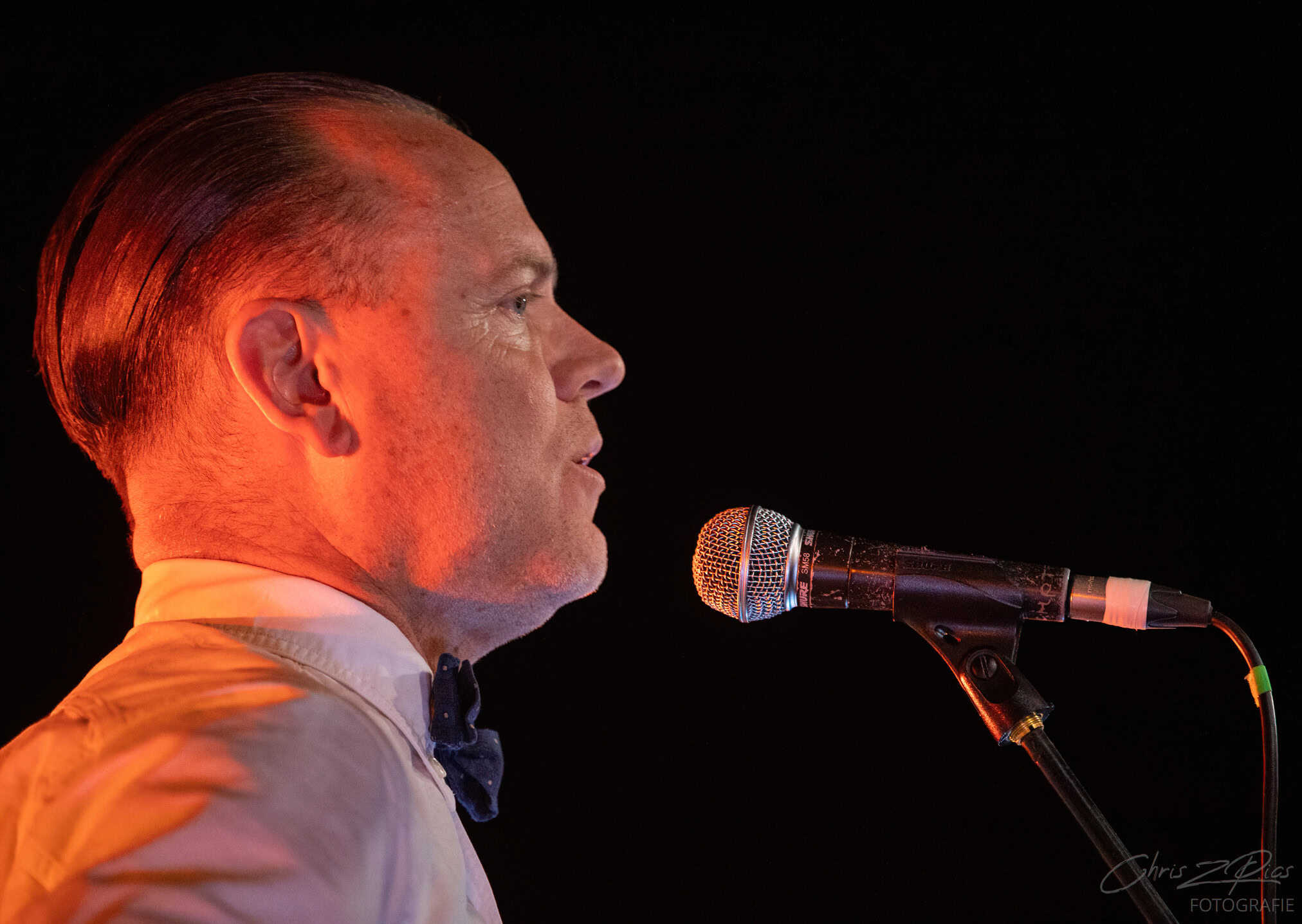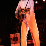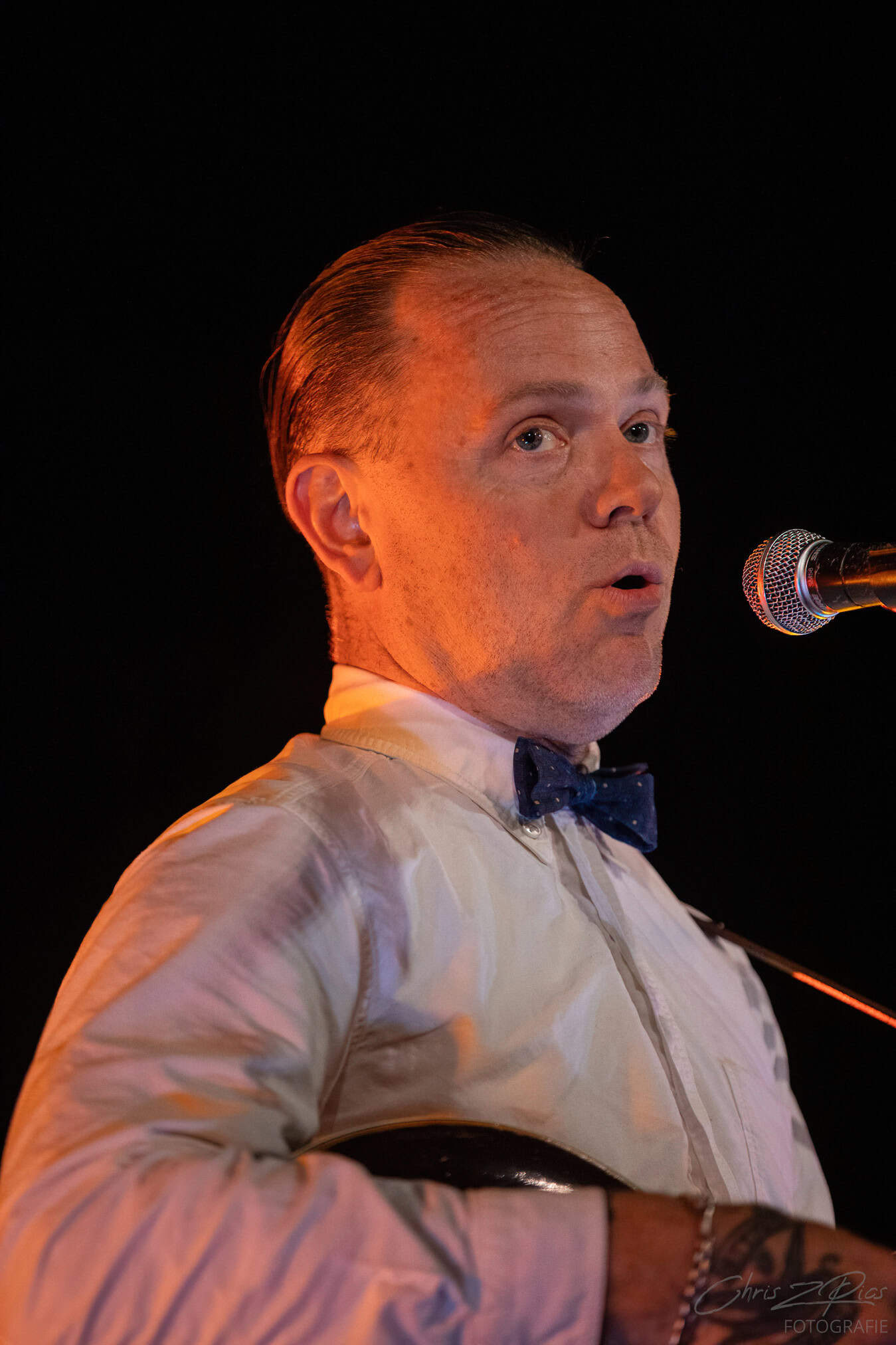 Intrigue follows C.W. Stoneking onto the stage at a welcome midweek early start time. To background Mississippi blues on the PA system, he fixes a string on his Gretsch, removes a blue jacket and saunters to the mic, now in white and a bow tie.