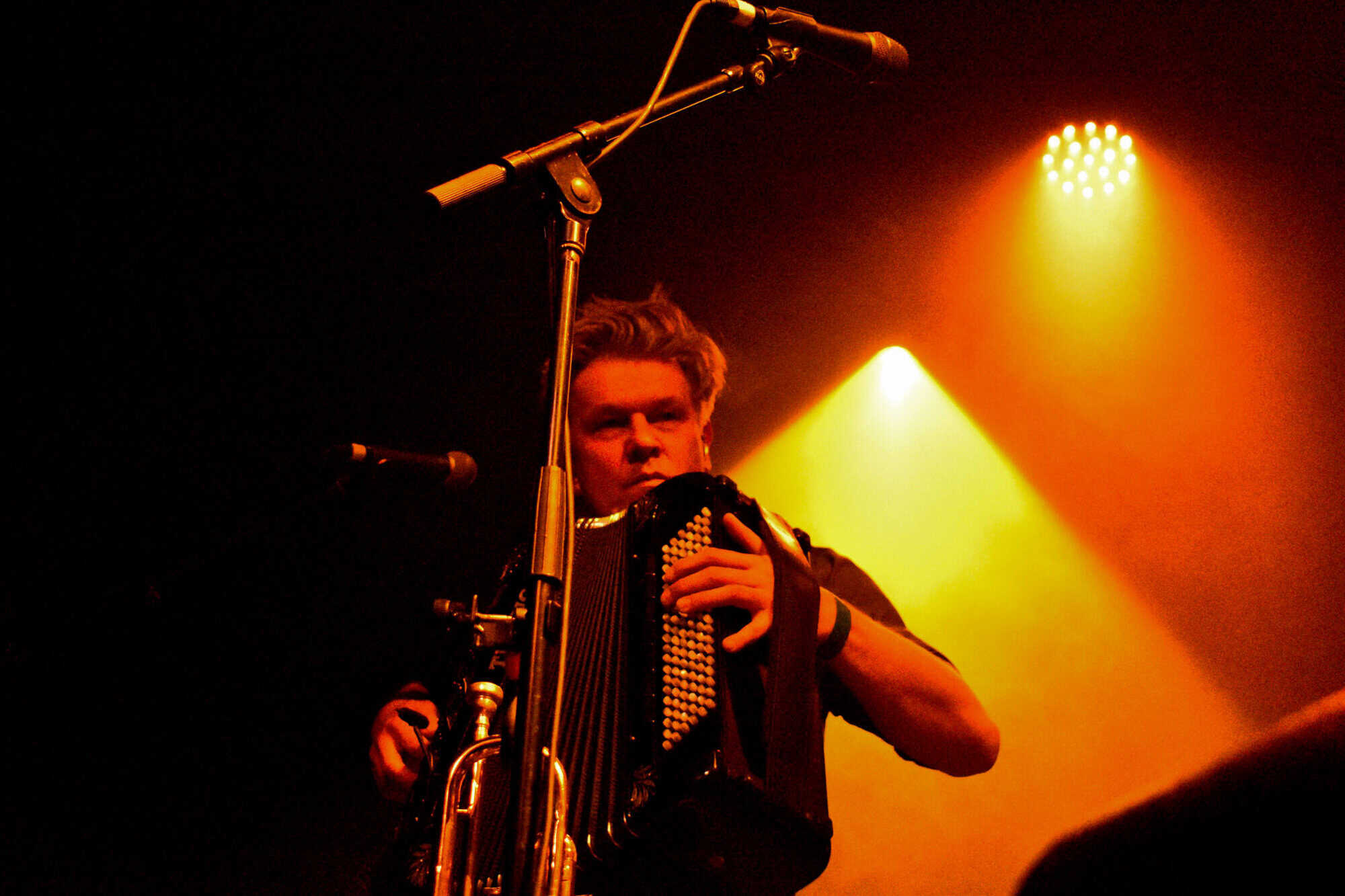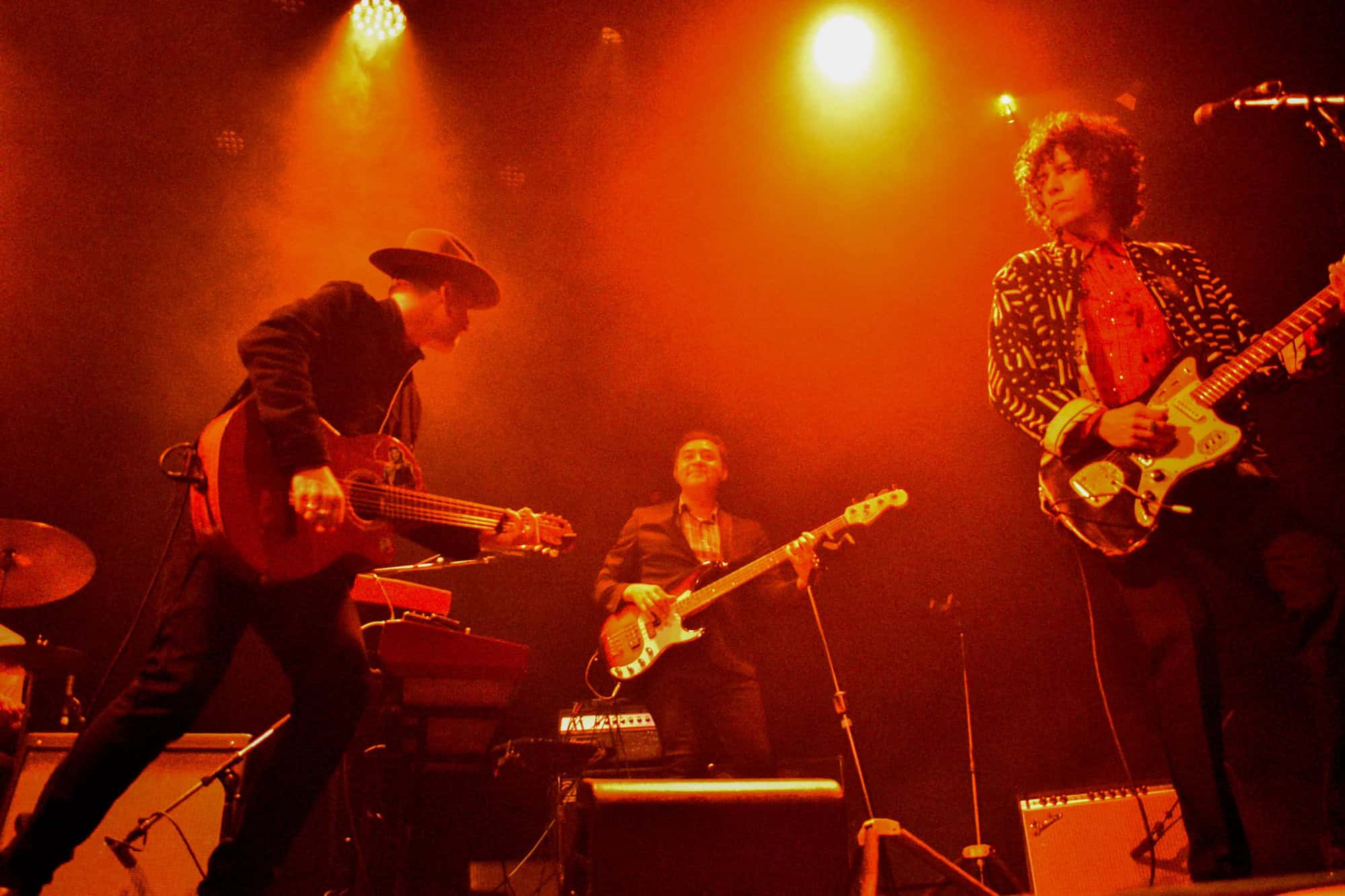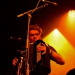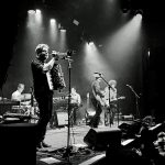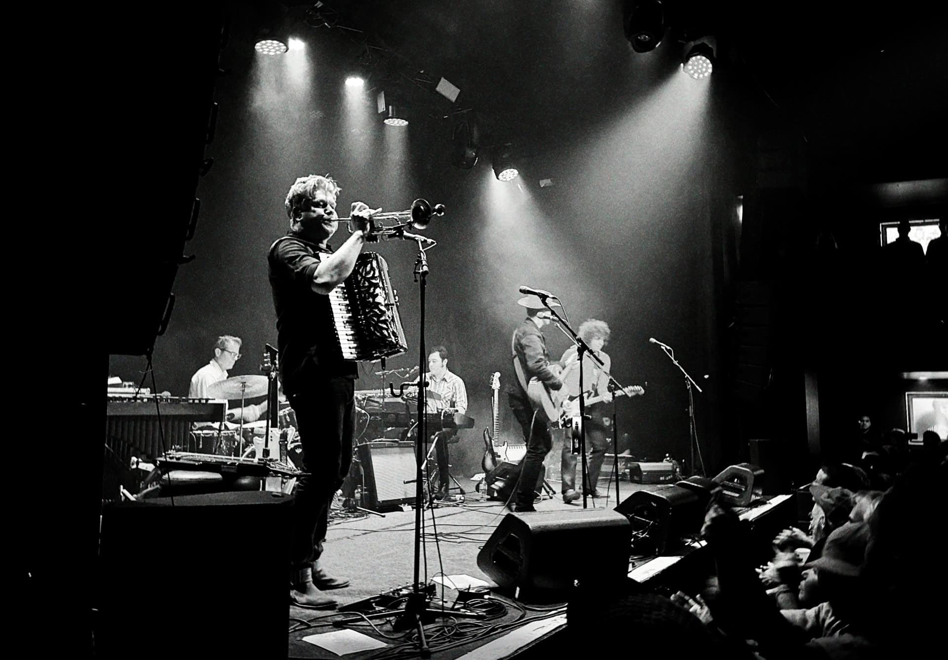 As Black Heart draws to an end, three photographers scuttle through the crowd past me, their time up in the sanctuary between band and crowd abandoned. I am already in awe of the musician in front of me, I think it is Sergio Mendoza, who already has rotated through accordion, slide-guitar and trumpet, behind him though other members are displaying their multiple talents swapping between guitars keys, vibraphone and another trumpet.