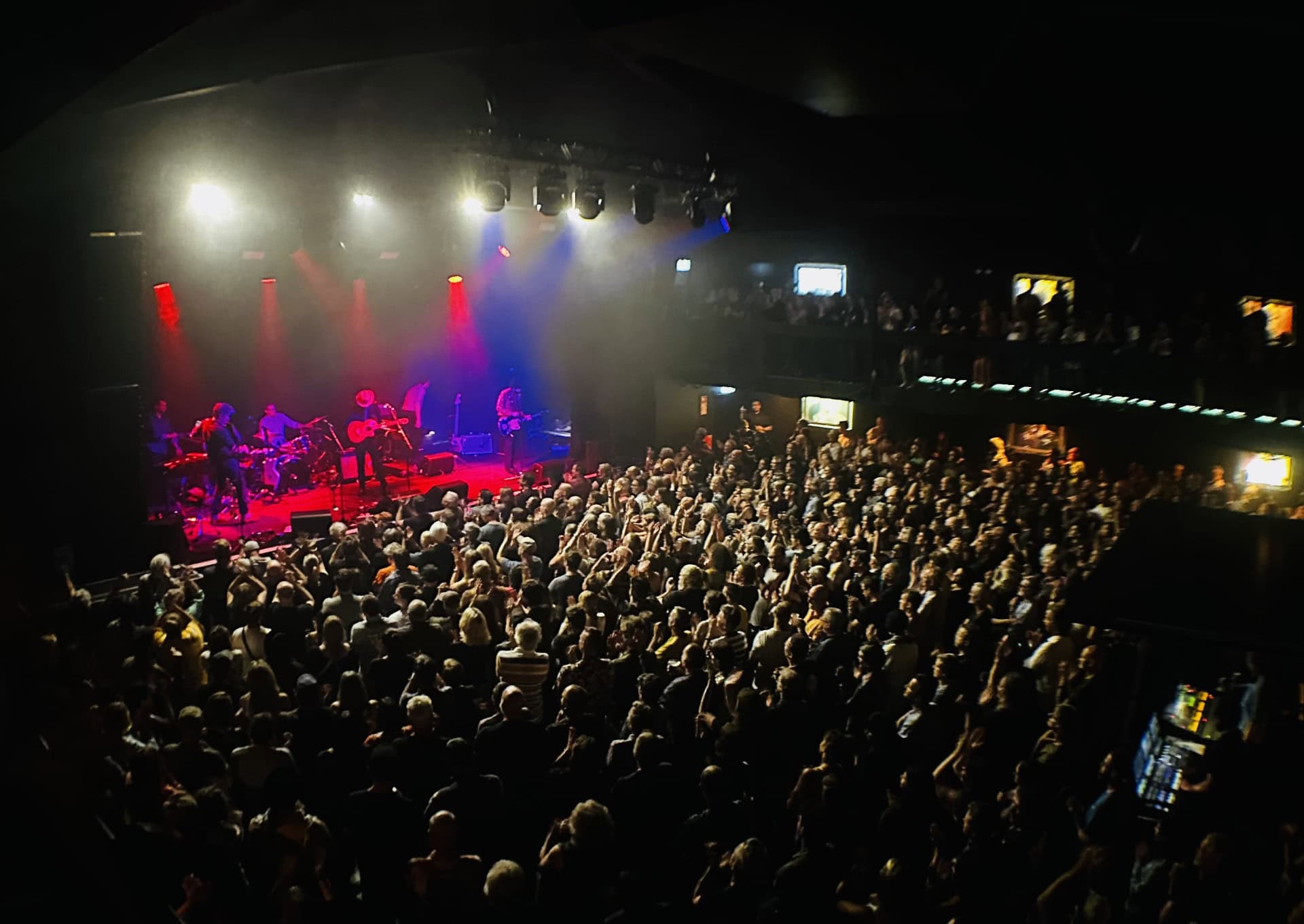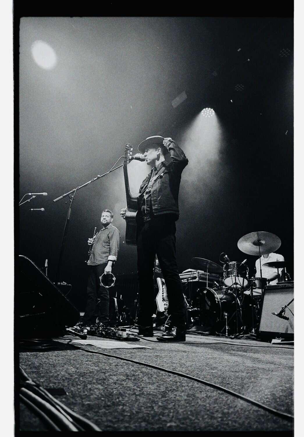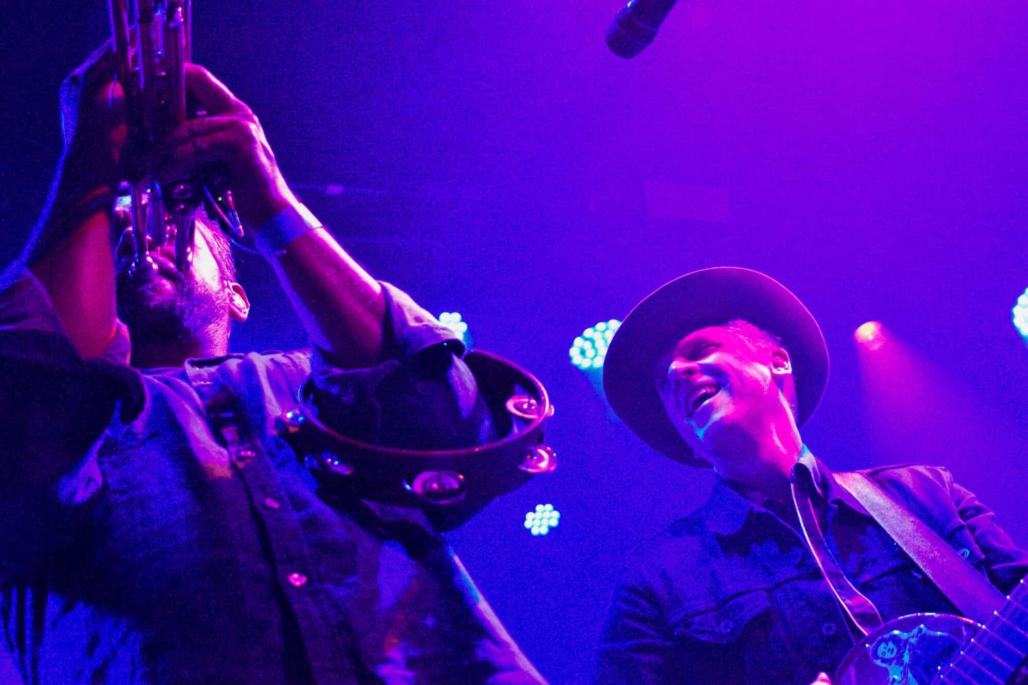 As Black Heart draws to an end, three photographers scuttle through the crowd past me, their time up in the sanctuary between band and crowd abandoned. I am already in awe of the musician in front of me, I think it is Sergio Mendoza, who already has rotated through accordion, slide-guitar and trumpet, behind him though other members are displaying their multiple talents swapping between guitars keys, vibraphone and another trumpet.