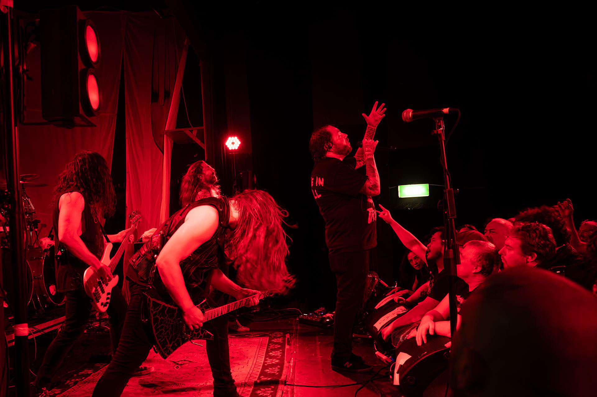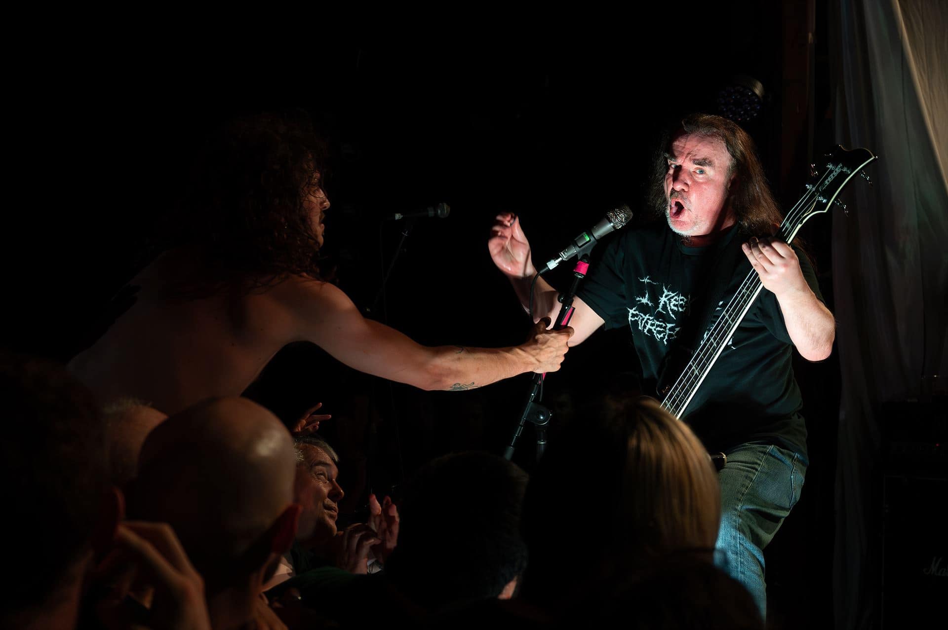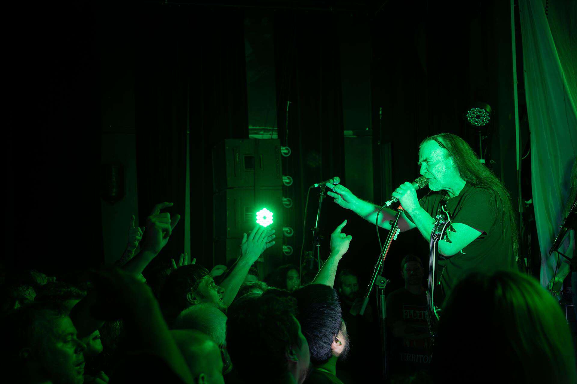 Bill Steer’s shredding is not overpowering; its trajectory complements bass, drum vocals and Nip’ Blackford rhythm guitar, but his control, pedigree and mana are undeniable, meanwhile Jeff Walker brandishes his bass like a warrior, an axe ready to do battle. And finally as the medley of Tomorrow Belongs to Nobody / Death Certificate begins, a brief recognition of Auckland comes, to be followed later by a Walker authorised stage invasion and invitation to sing along, until all are told to ‘Fuck Off’ causing mass stage diving into the ferocious mosh pit.