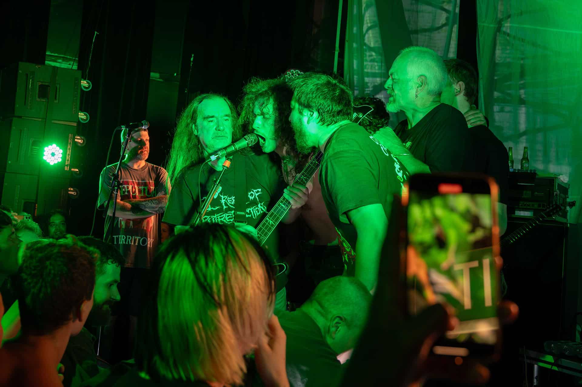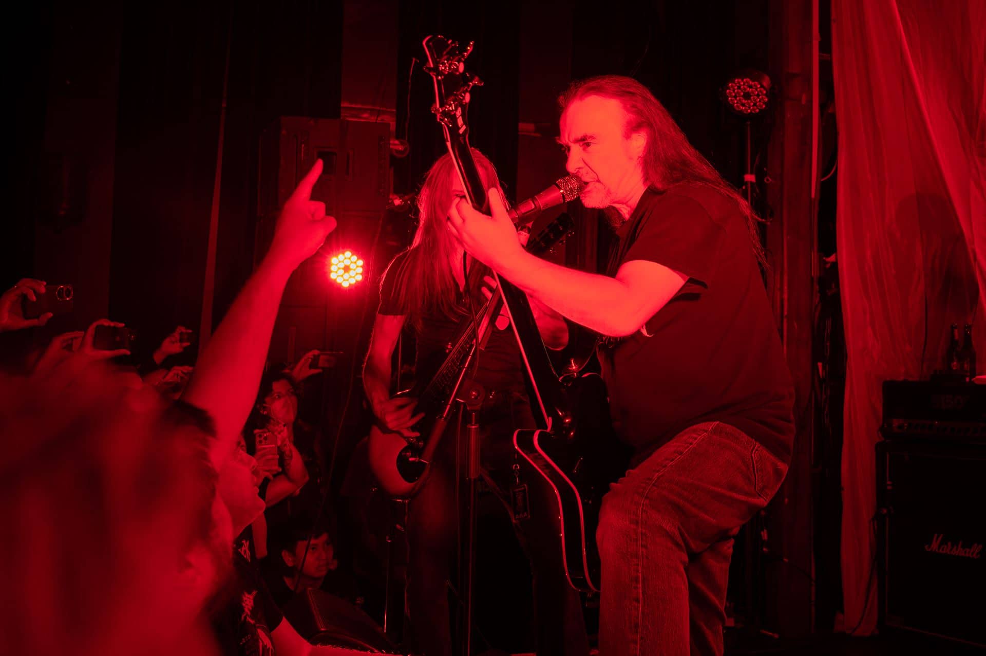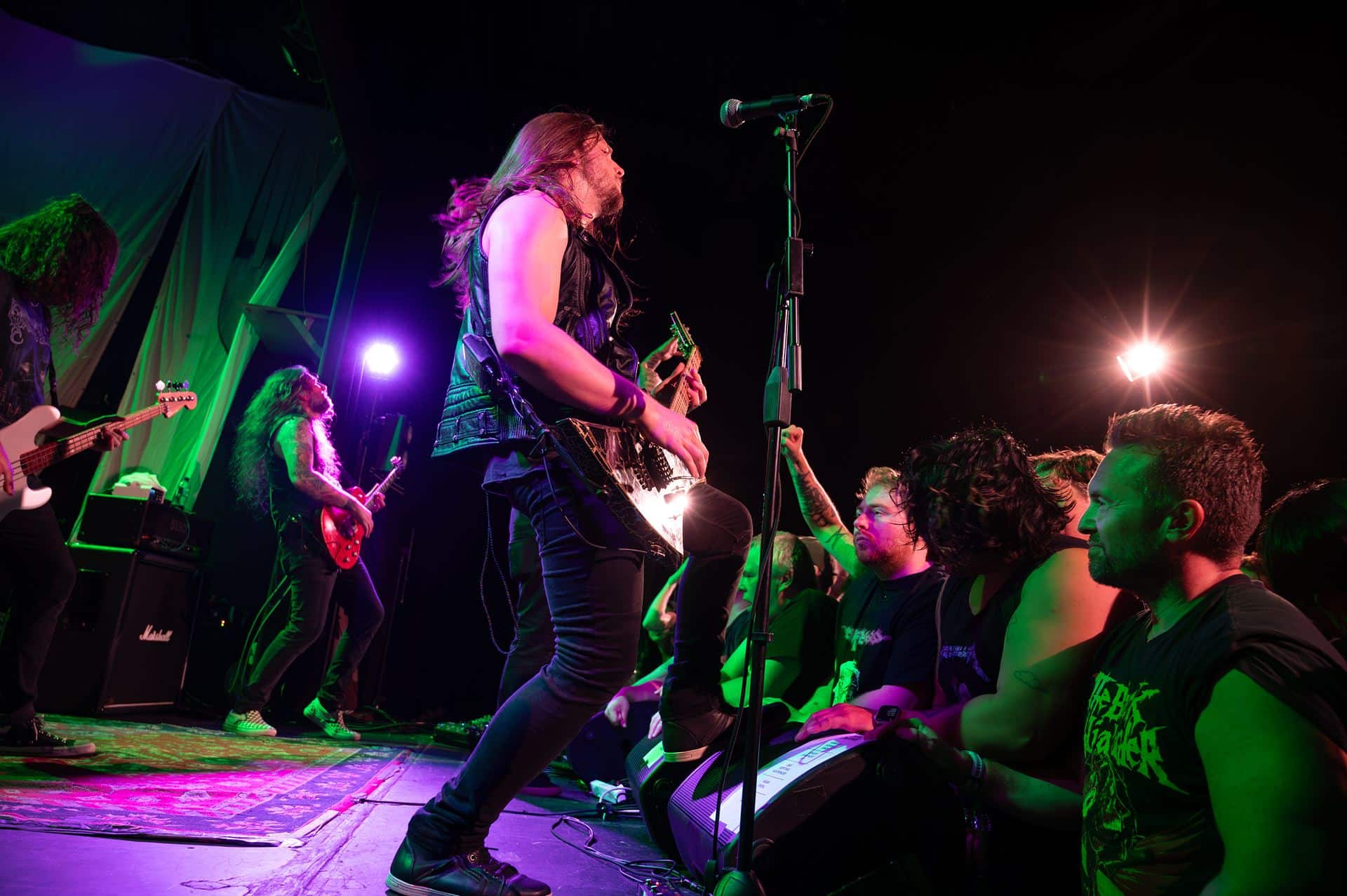 Bill Steer’s shredding is not overpowering; its trajectory complements bass, drum vocals and Nip’ Blackford rhythm guitar, but his control, pedigree and mana are undeniable, meanwhile Jeff Walker brandishes his bass like a warrior, an axe ready to do battle. And finally as the medley of Tomorrow Belongs to Nobody / Death Certificate begins, a brief recognition of Auckland comes, to be followed later by a Walker authorised stage invasion and invitation to sing along, until all are told to ‘Fuck Off’ causing mass stage diving into the ferocious mosh pit.