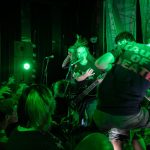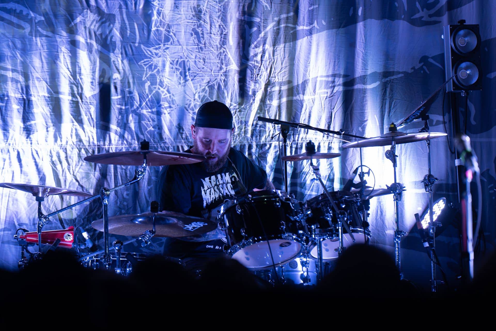 Already noticeable is the craftsmanship of Carcass’s sound and lighting crew. The visual show is at an explosive ranking, mixing the traditional cans with video manipulation, it has tonight’s feature band at a level above so many other shows seen at Galatos. Symbiotically, the sound mix is measured and restrained, perfectly mixed, minutely balanced, clear and punchy. The bassist from Head Like A Hole is next to me and we are in enraptured gaze by the perfection of it all.