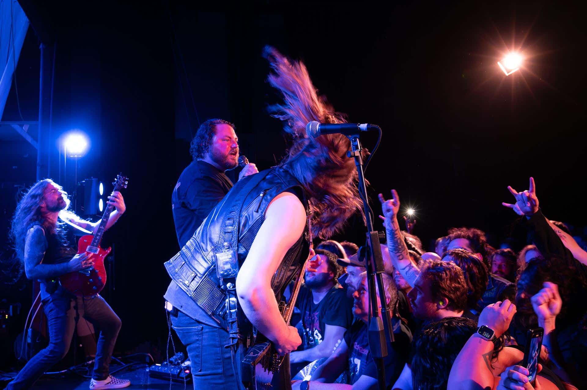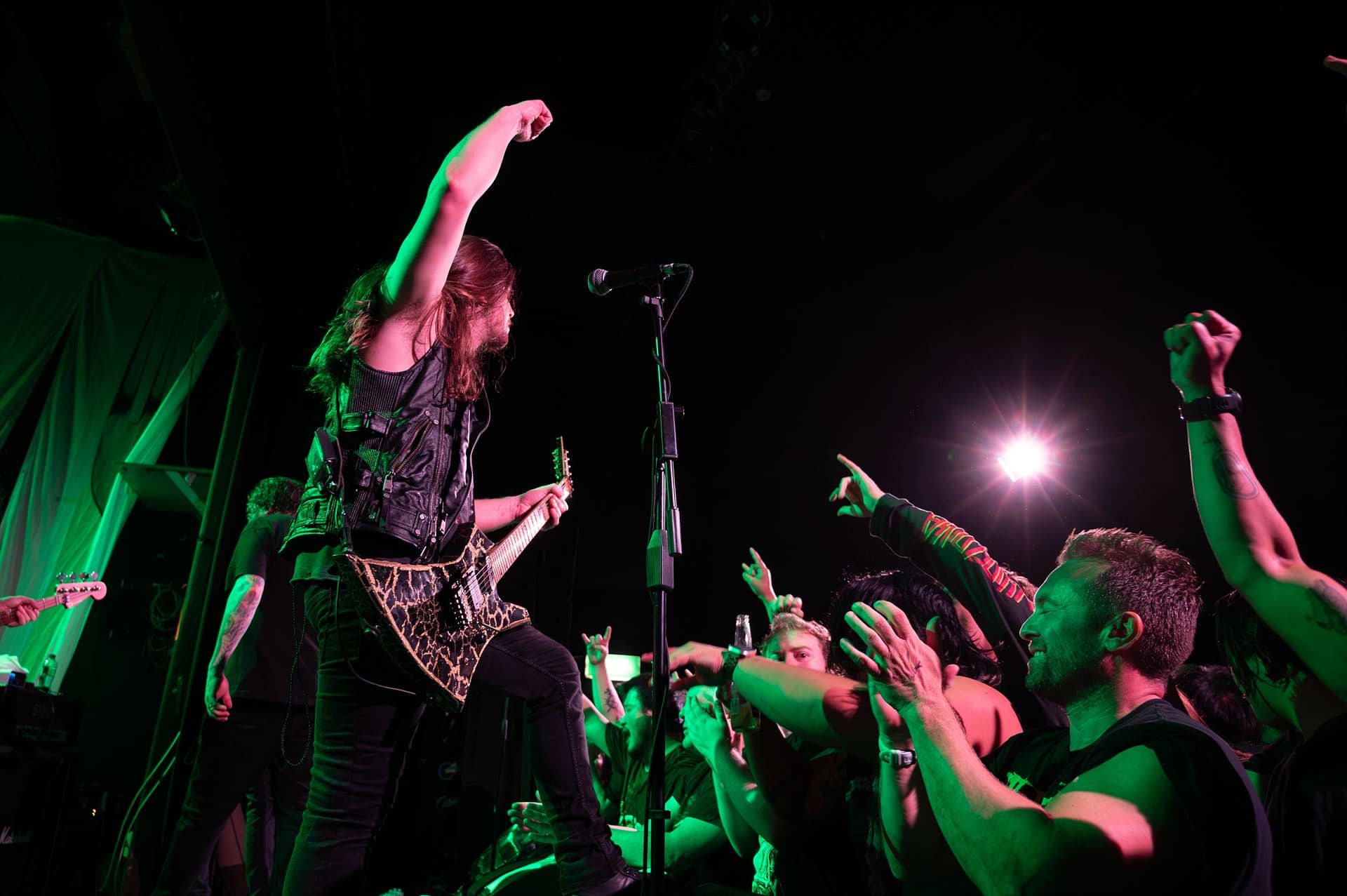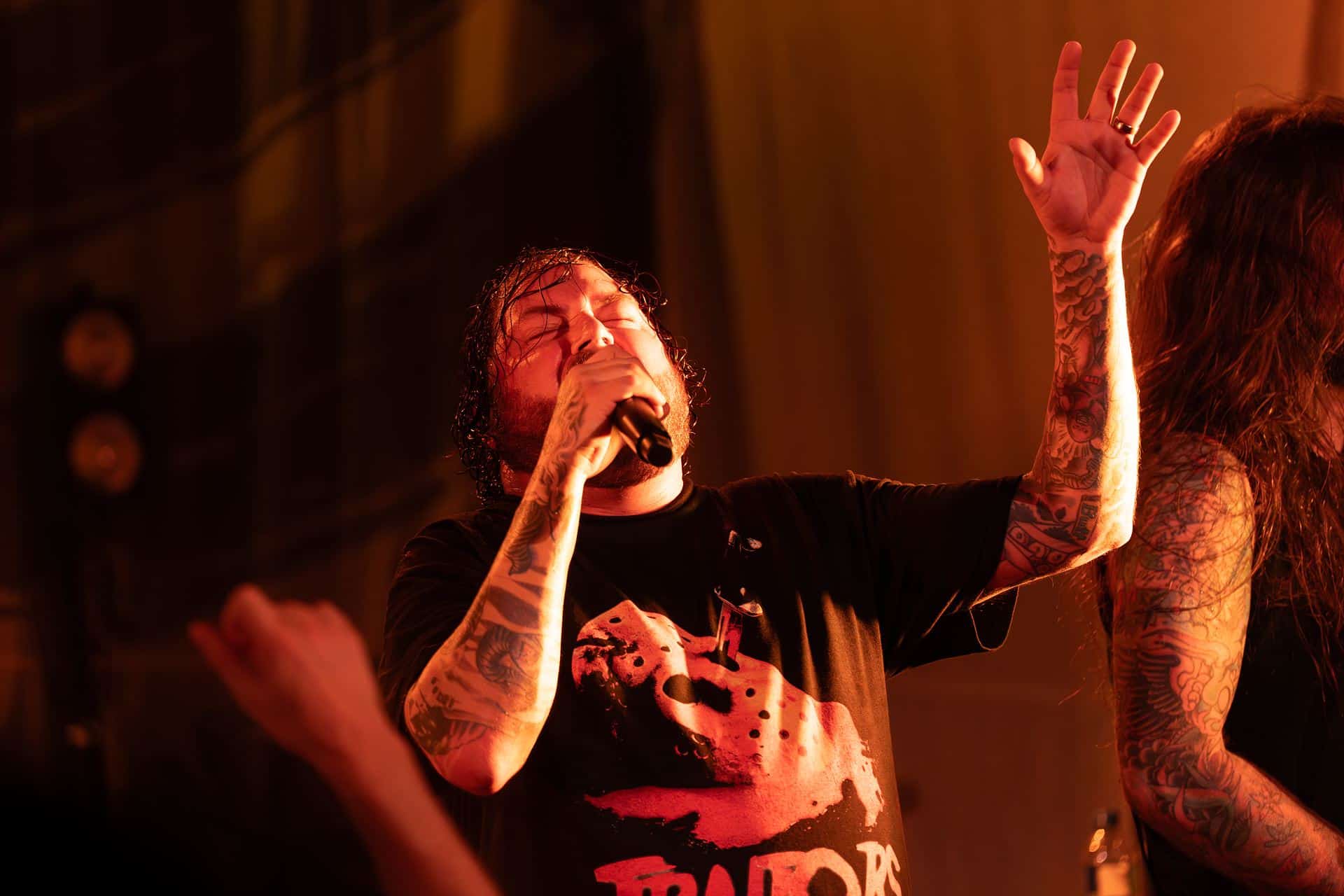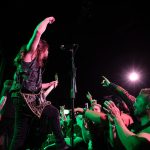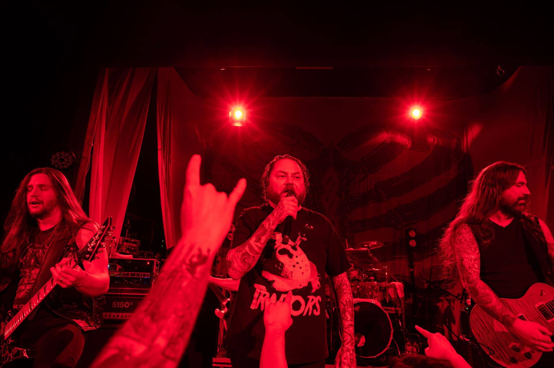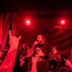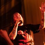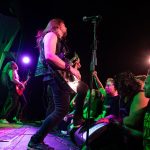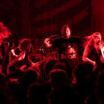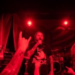 With Brian Eschbach on point, the deep growls of Trevor Strnad are noticeably missing, Eschbach vocals are low in the mix ,though The Black Dahlia Murder signature guitar solos and immeasurably fast double kicks still rattle the venue’s rafters. The mosh pit is frantic, fueled and songs from albums: Nocturnal, Verminous and Nightbringers are rapturously received and is followed by older song Miasma that ensures roars in the room.