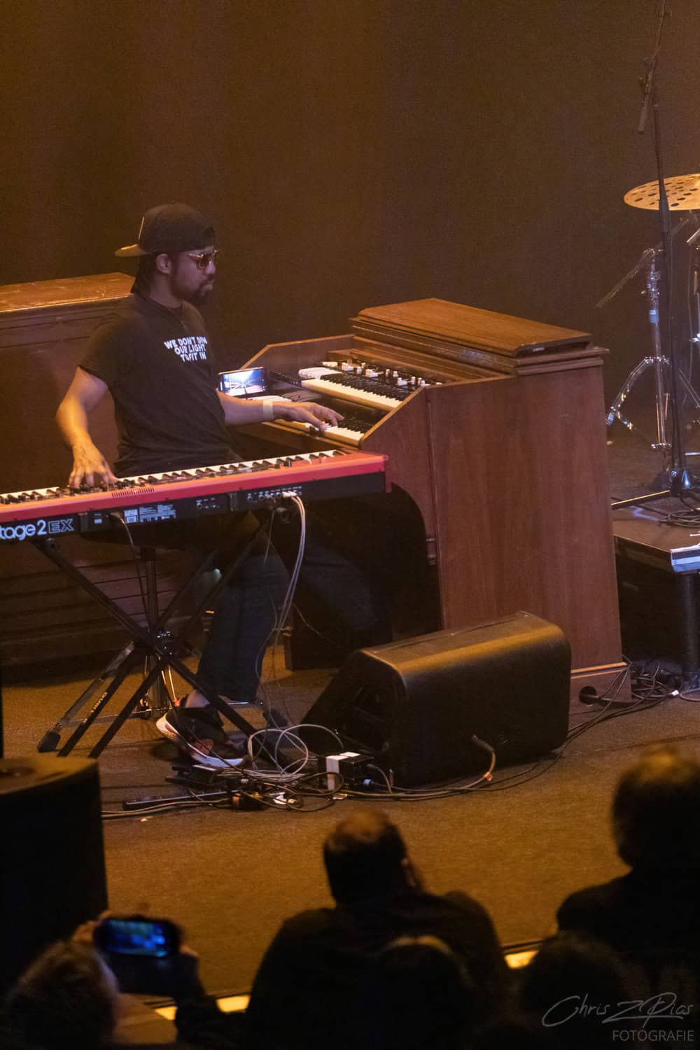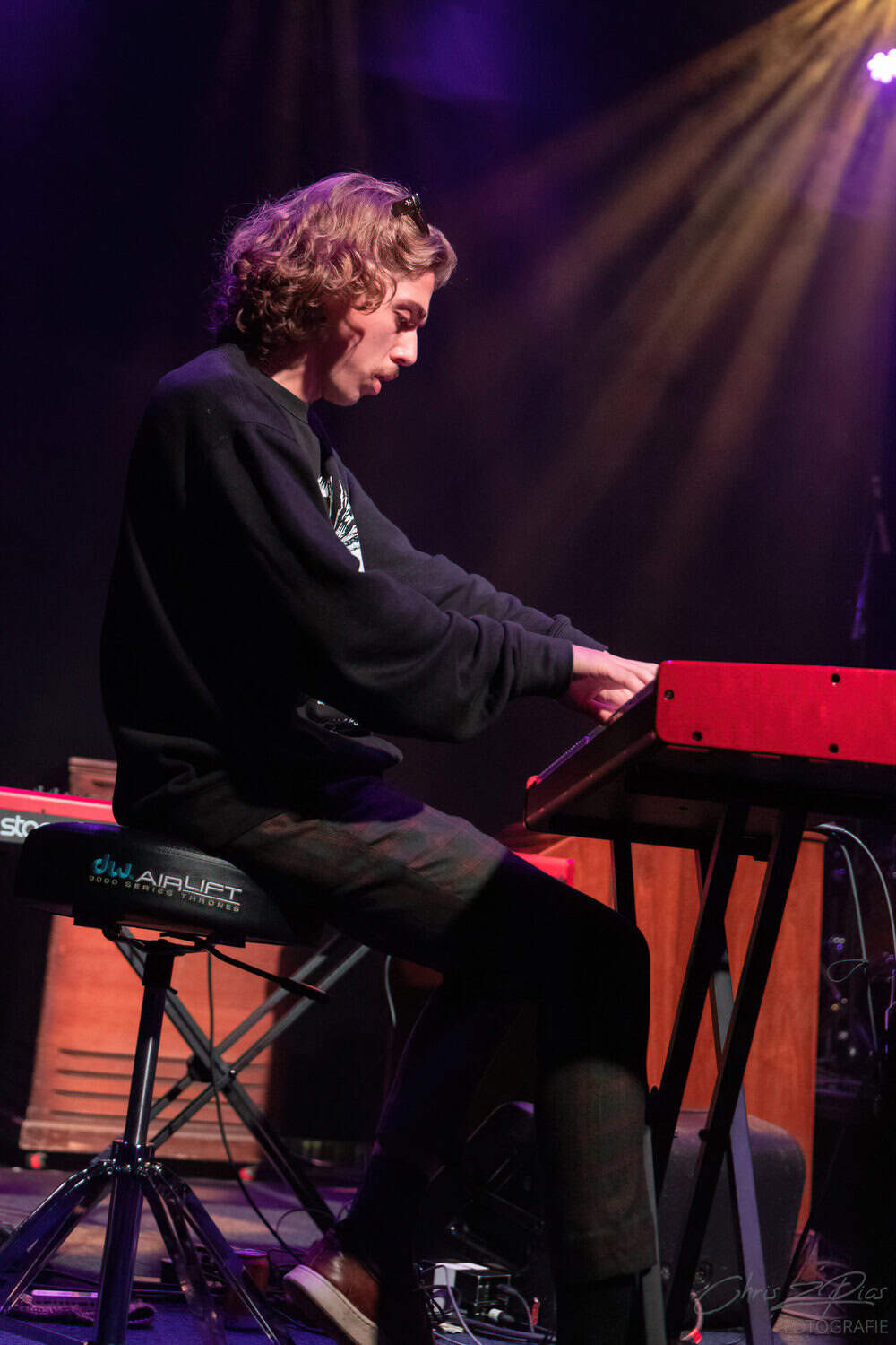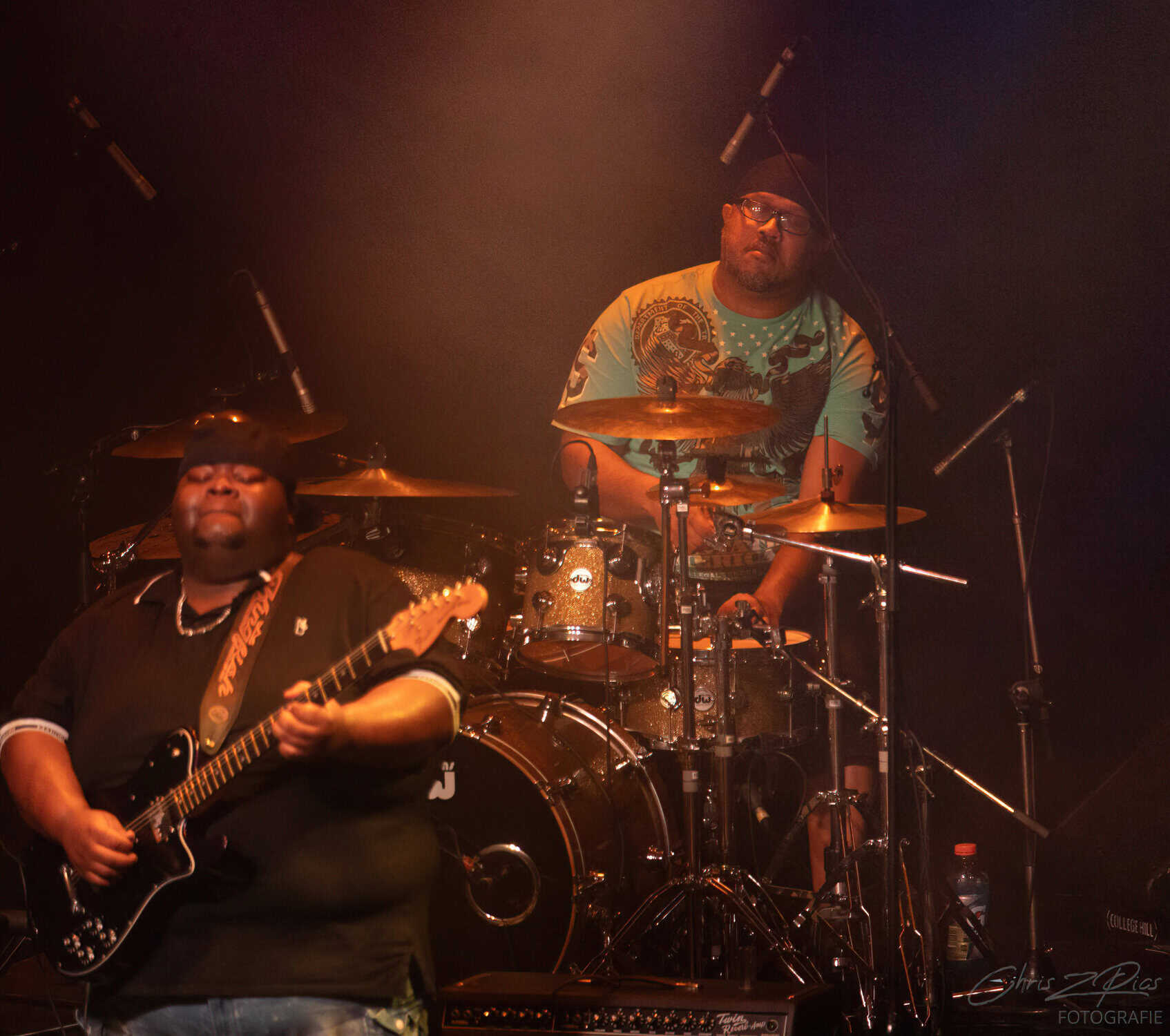 The names are too hard to catch from the stage, but he has a fast and furious drummer and a solid bottom bass guitarist. The keyboards play in the style that came from Al Kooper on Highway 61 Revisited and progressed to Ian McLagan playing with the Faces.