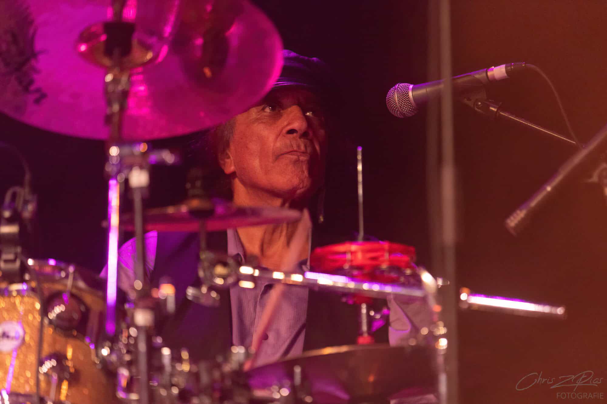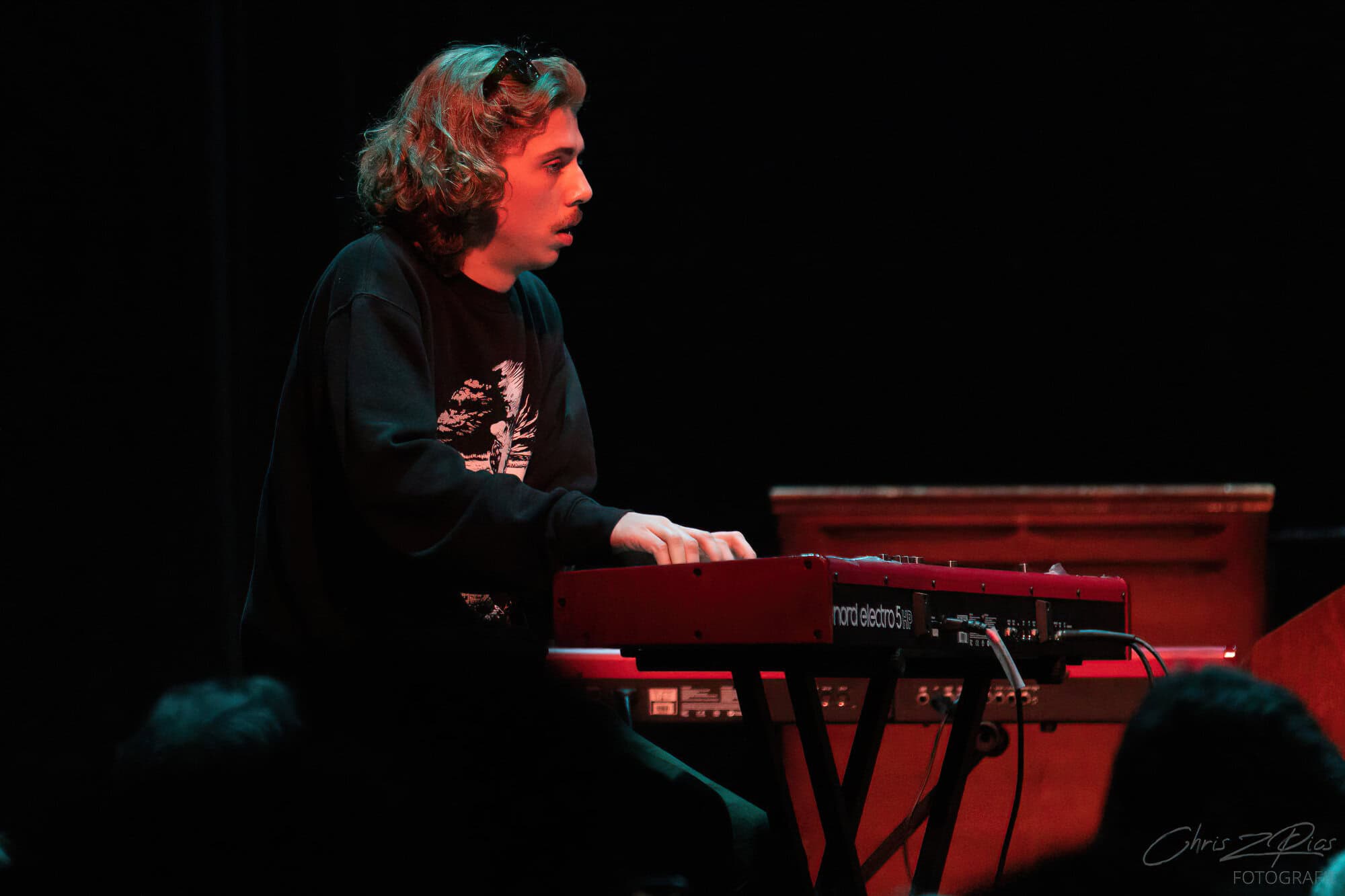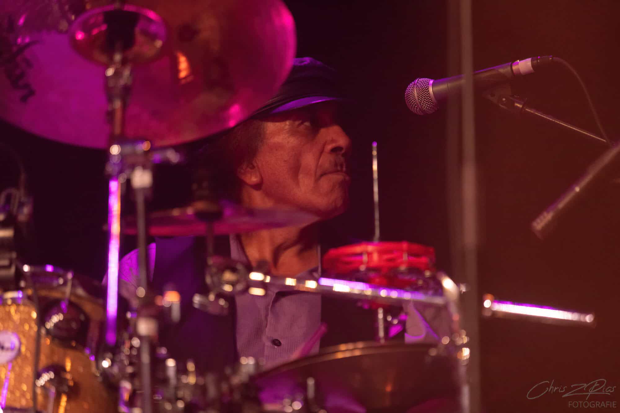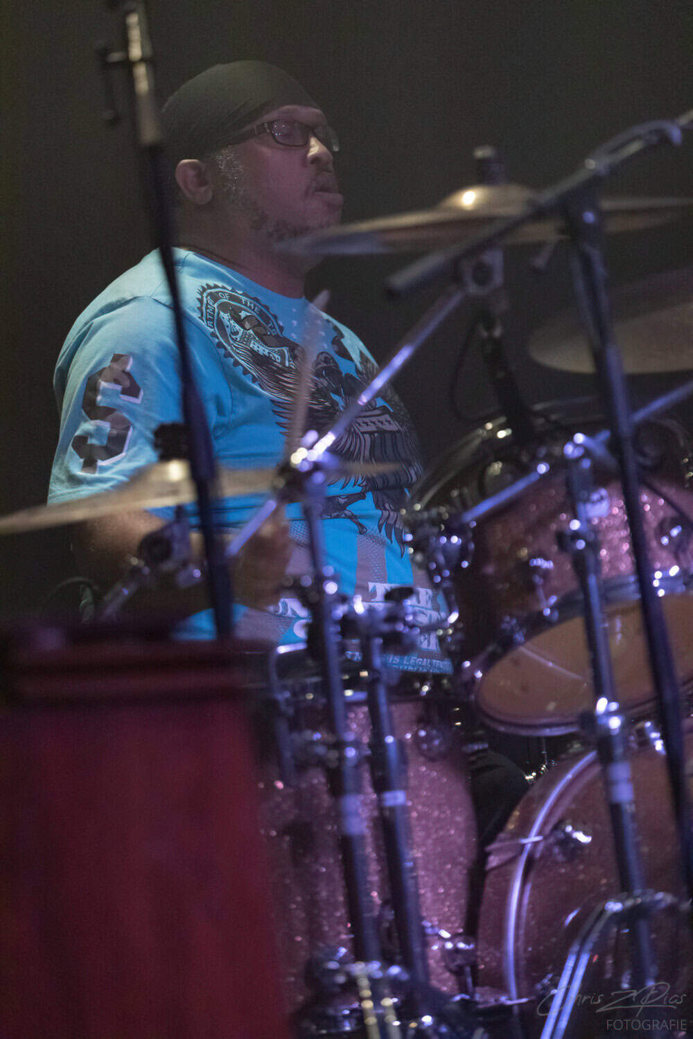 The names are too hard to catch from the stage, but he has a fast and furious drummer and a solid bottom bass guitarist. The keyboards play in the style that came from Al Kooper on Highway 61 Revisited and progressed to Ian McLagan playing with the Faces.