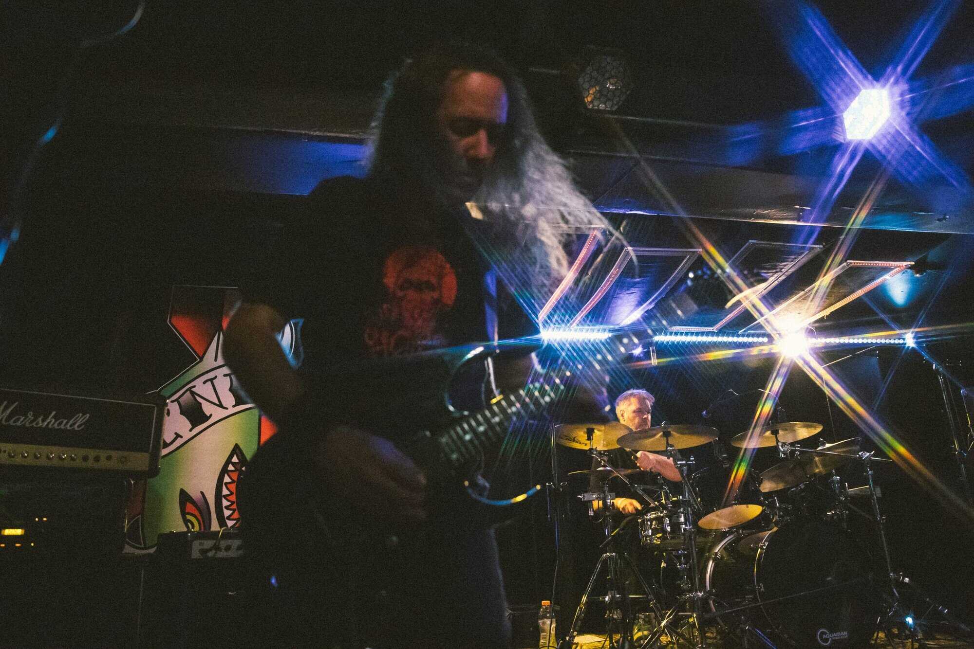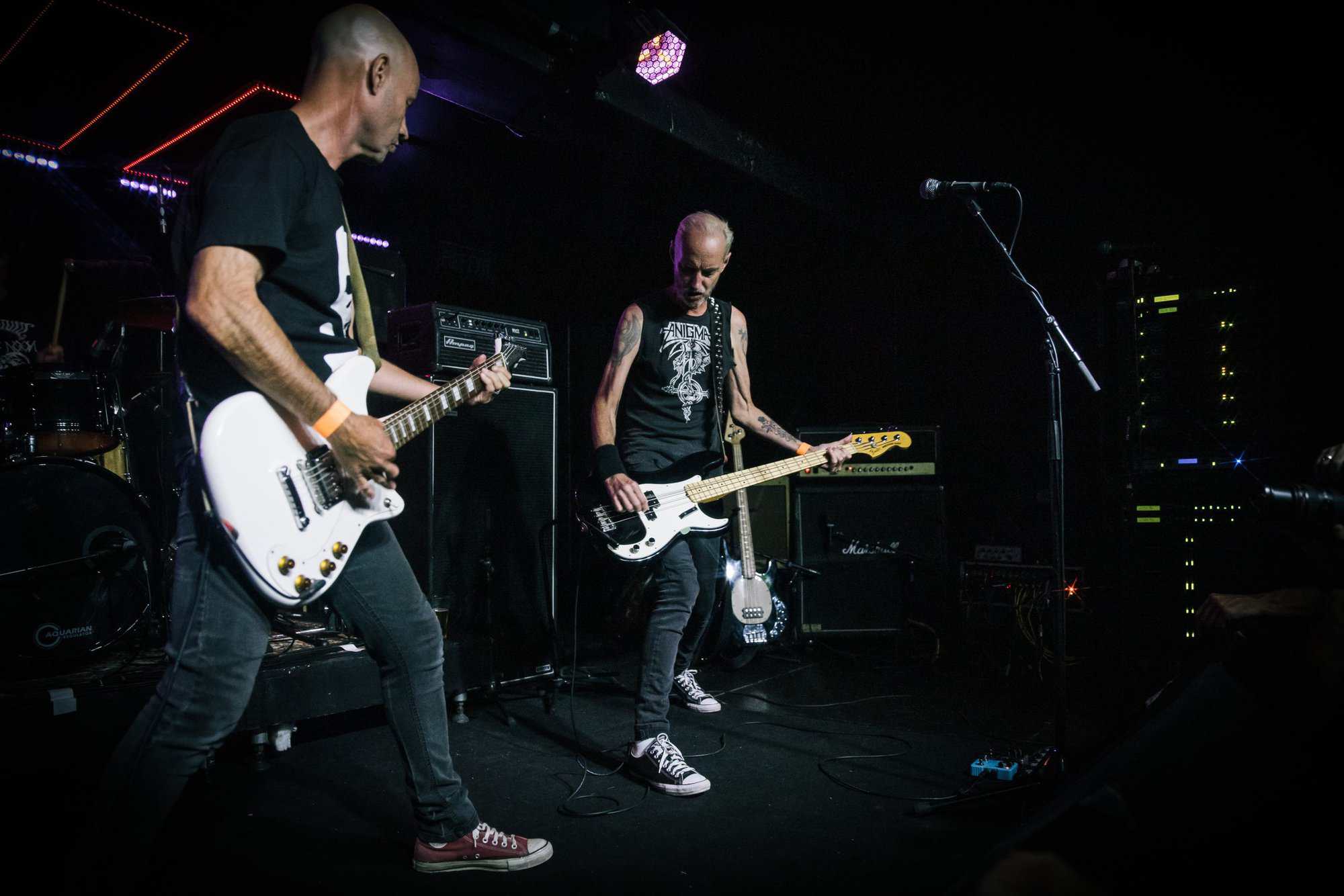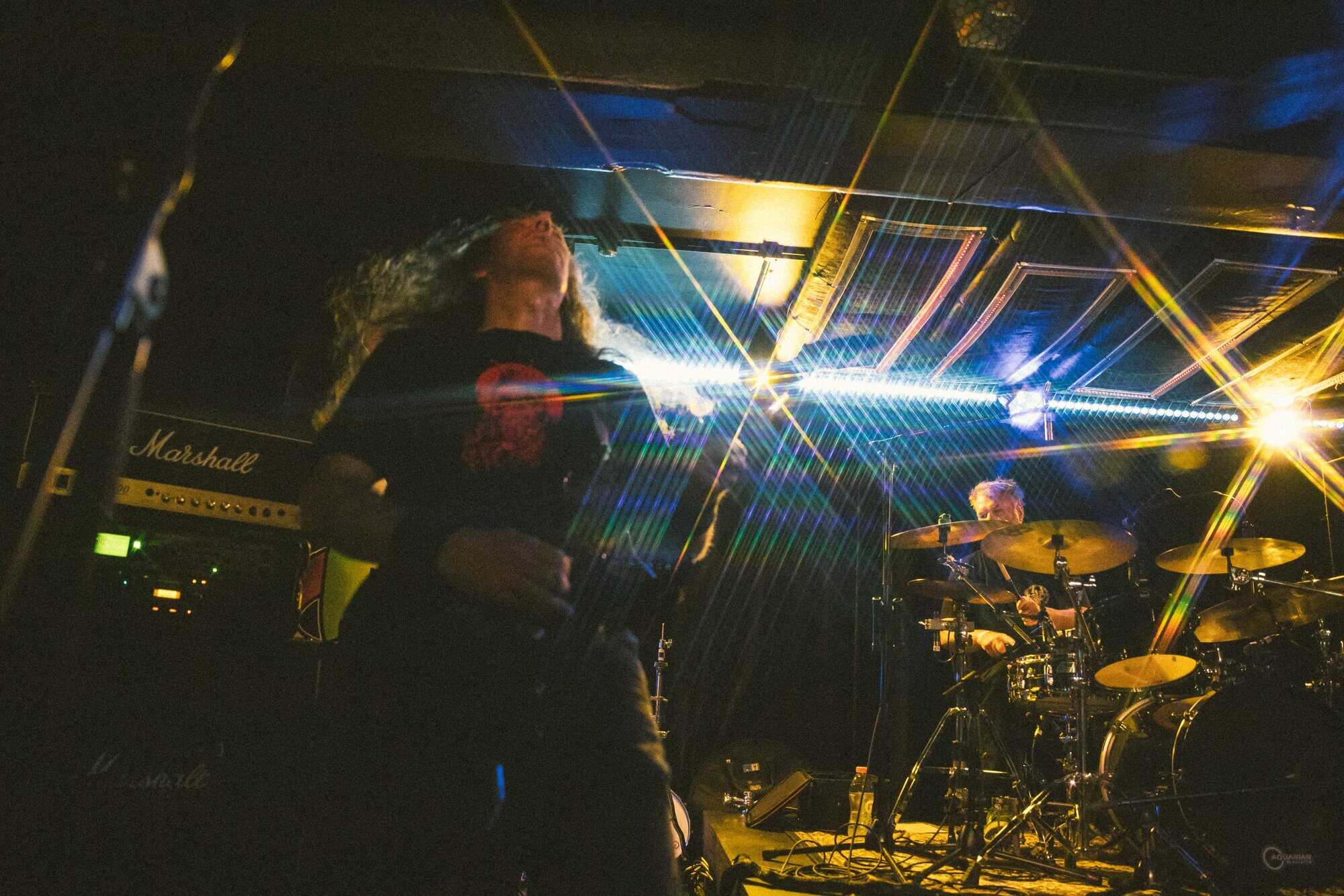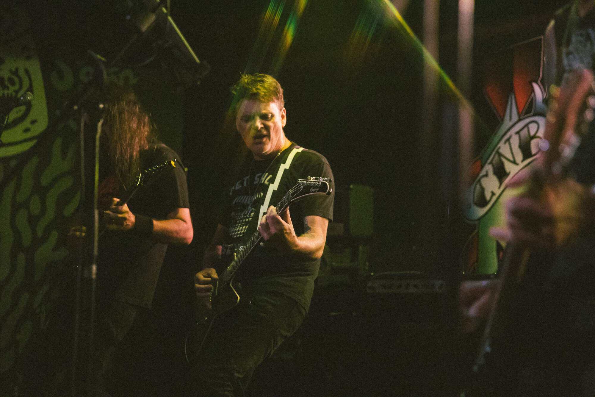 Again, in a set of about five or six songs, with a guest guitarist, Simon Nicholls alongside longtime compadre in crime Dave Goodson, they re lived their chaotic youth, as they delivered polished thrash and speed metal songs about Satan, Judge Death, Serial Killers and skating, much to Dave’s mirth as he sang lyrics from memory and ipad