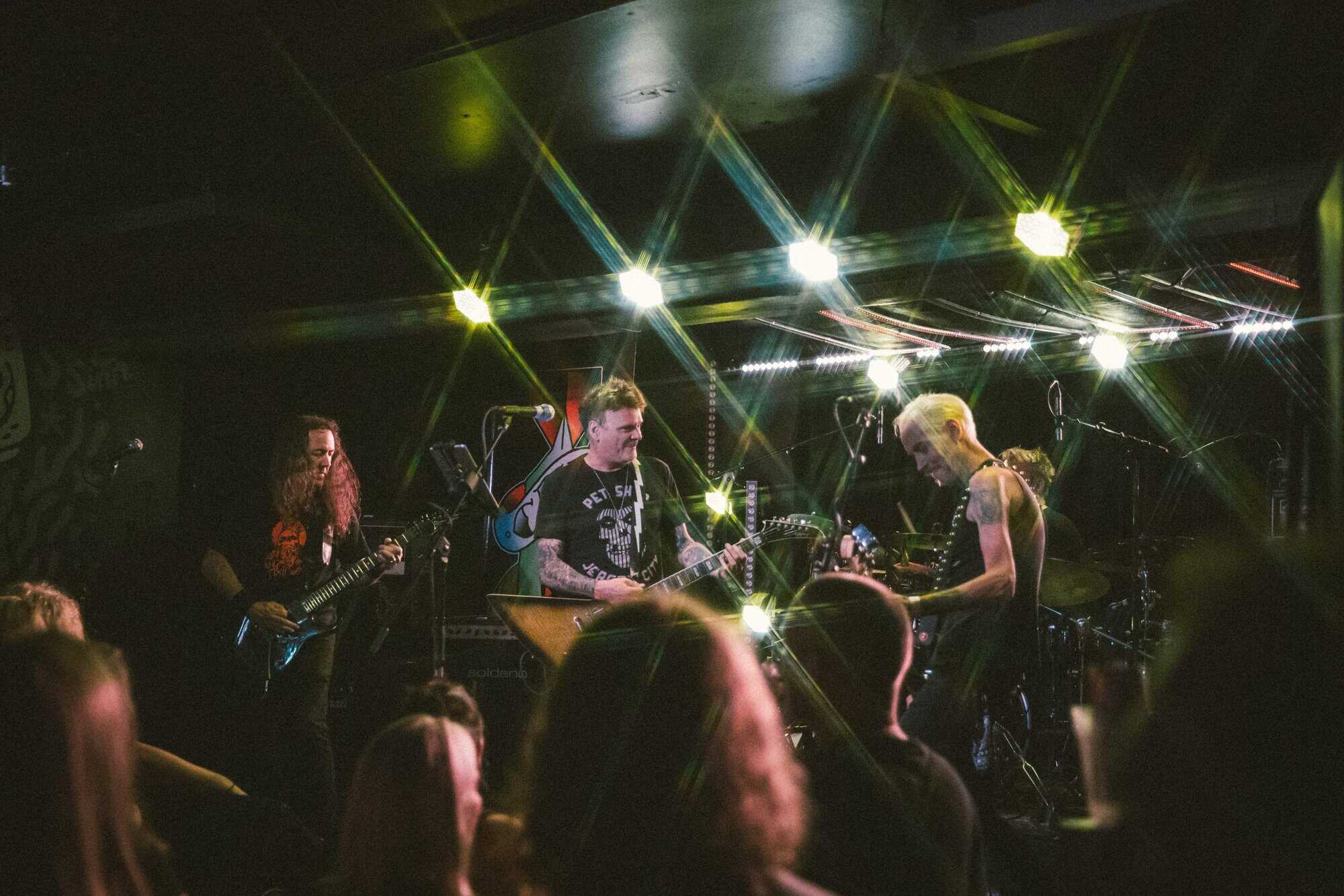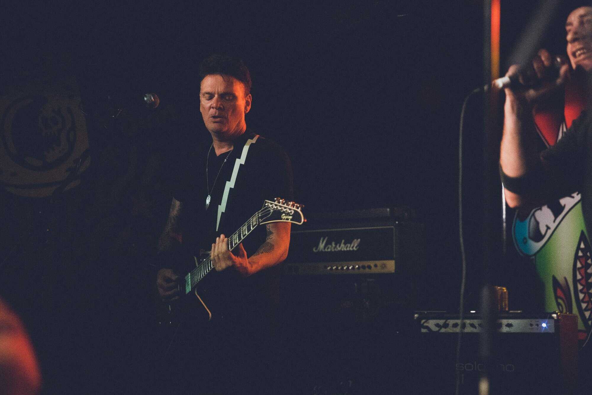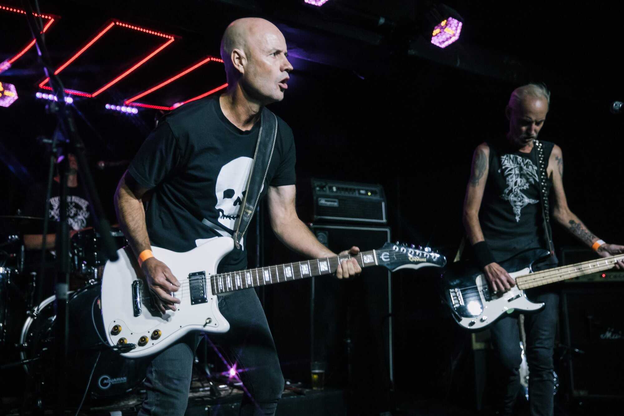 Again, in a set of about five or six songs, with a guest guitarist, Simon Nicholls alongside longtime compadre in crime Dave Goodson, they re lived their chaotic youth, as they delivered polished thrash and speed metal songs about Satan, Judge Death, Serial Killers and skating, much to Dave’s mirth as he sang lyrics from memory and ipad