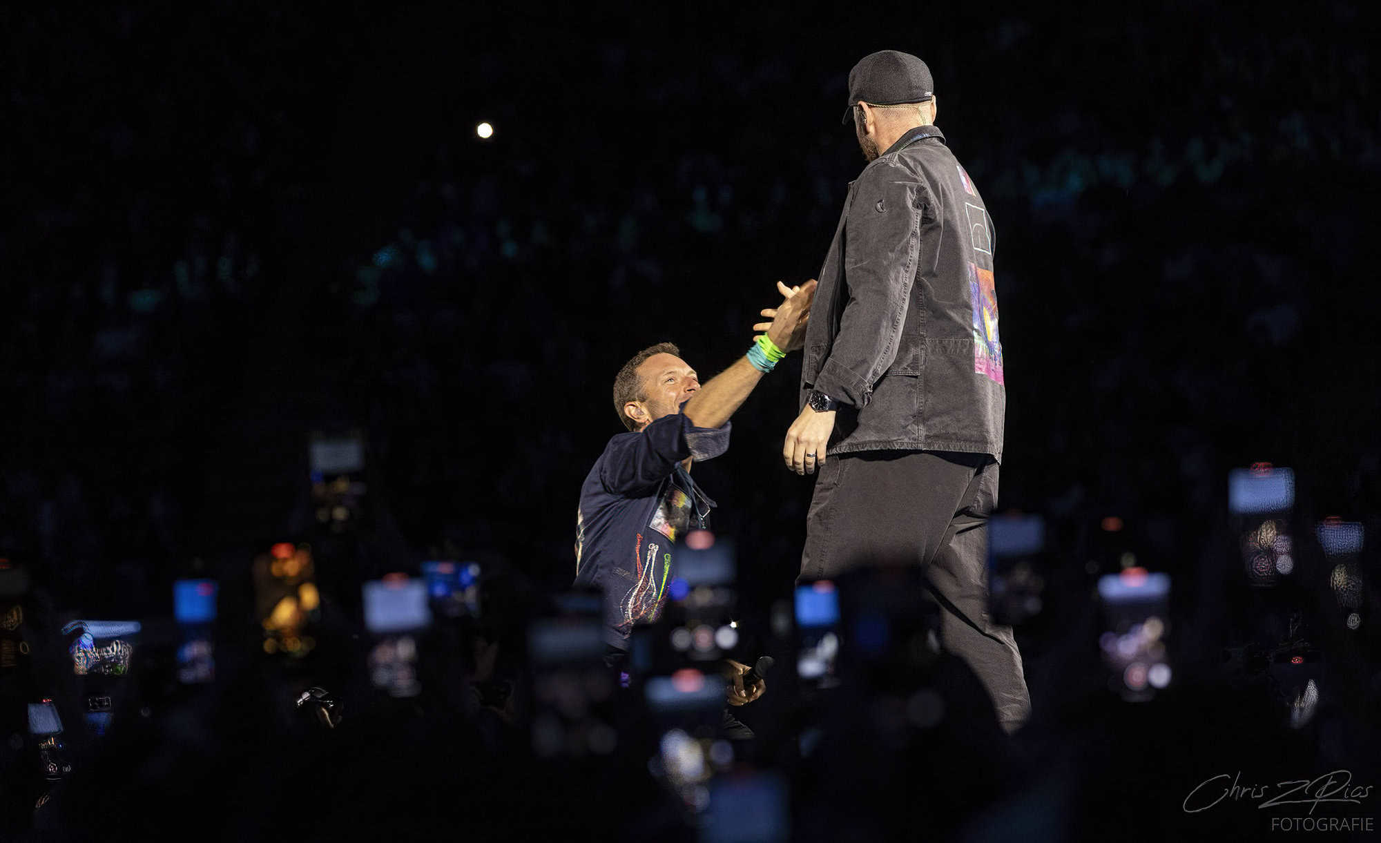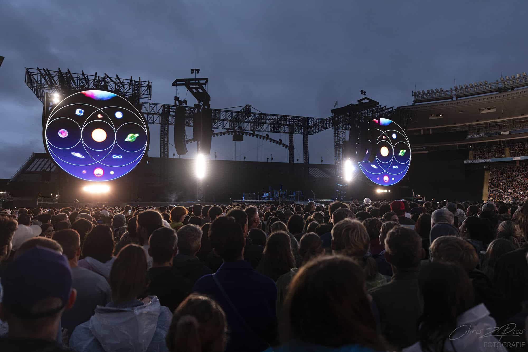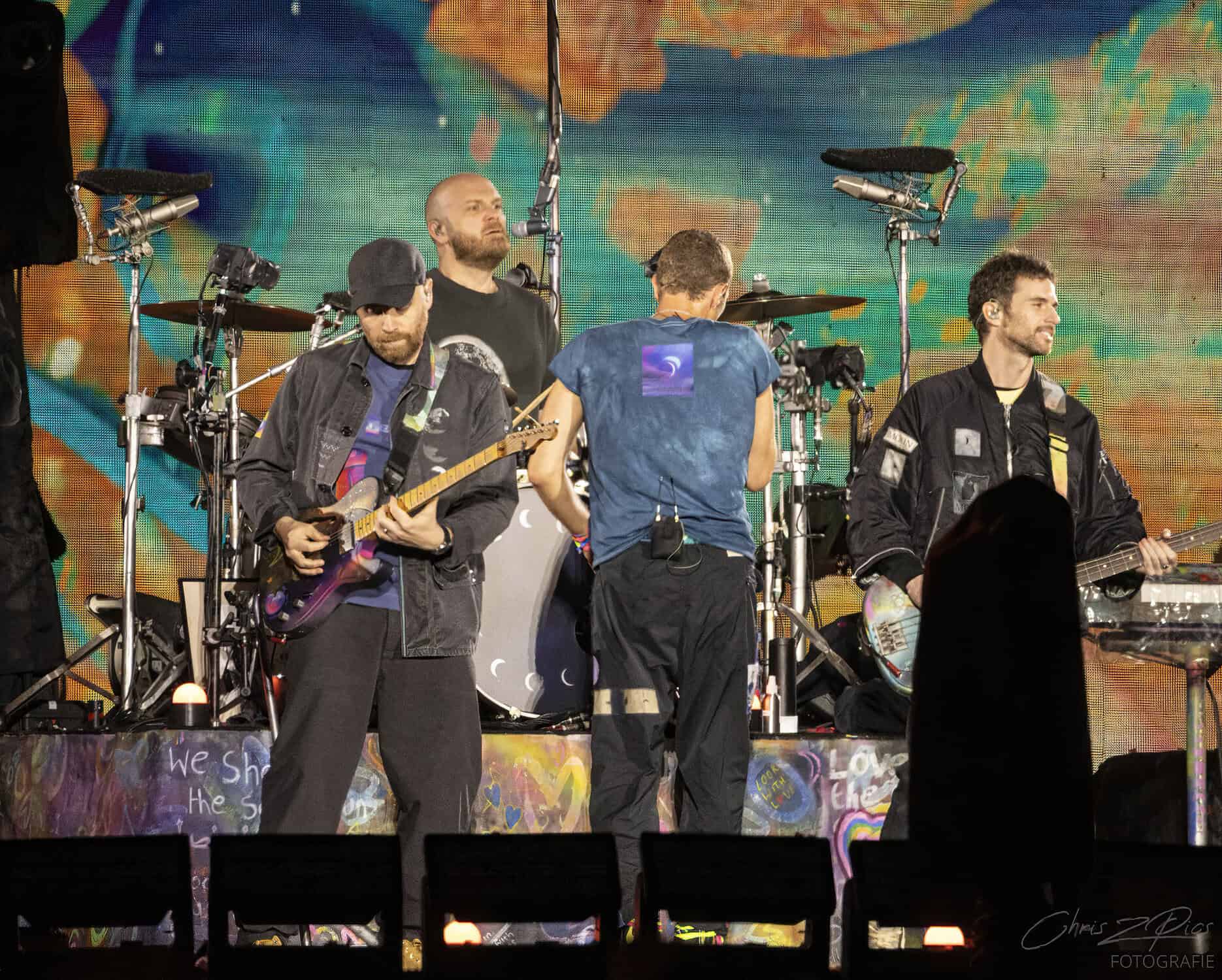 Finally the sounds of John Williams’ E.T. Theme signals that the concert is about to begin…as does a robotic voice says something about “Music Of The Spheres”…and then, there they are…Chris Martin, Jonny Buckland, Guy Berryman and Will ChampionColdplay in the middle of the stadium on “Stage B” singing and playing Higher Power while our wristbands throb with red light.