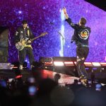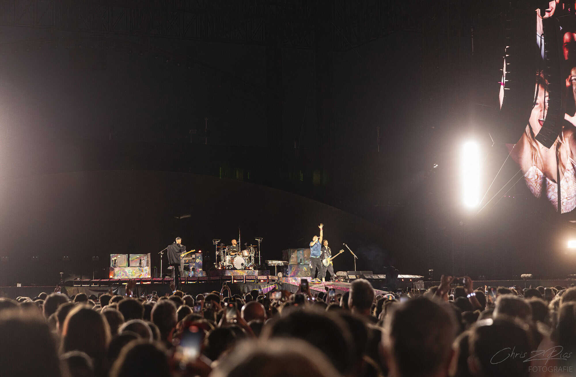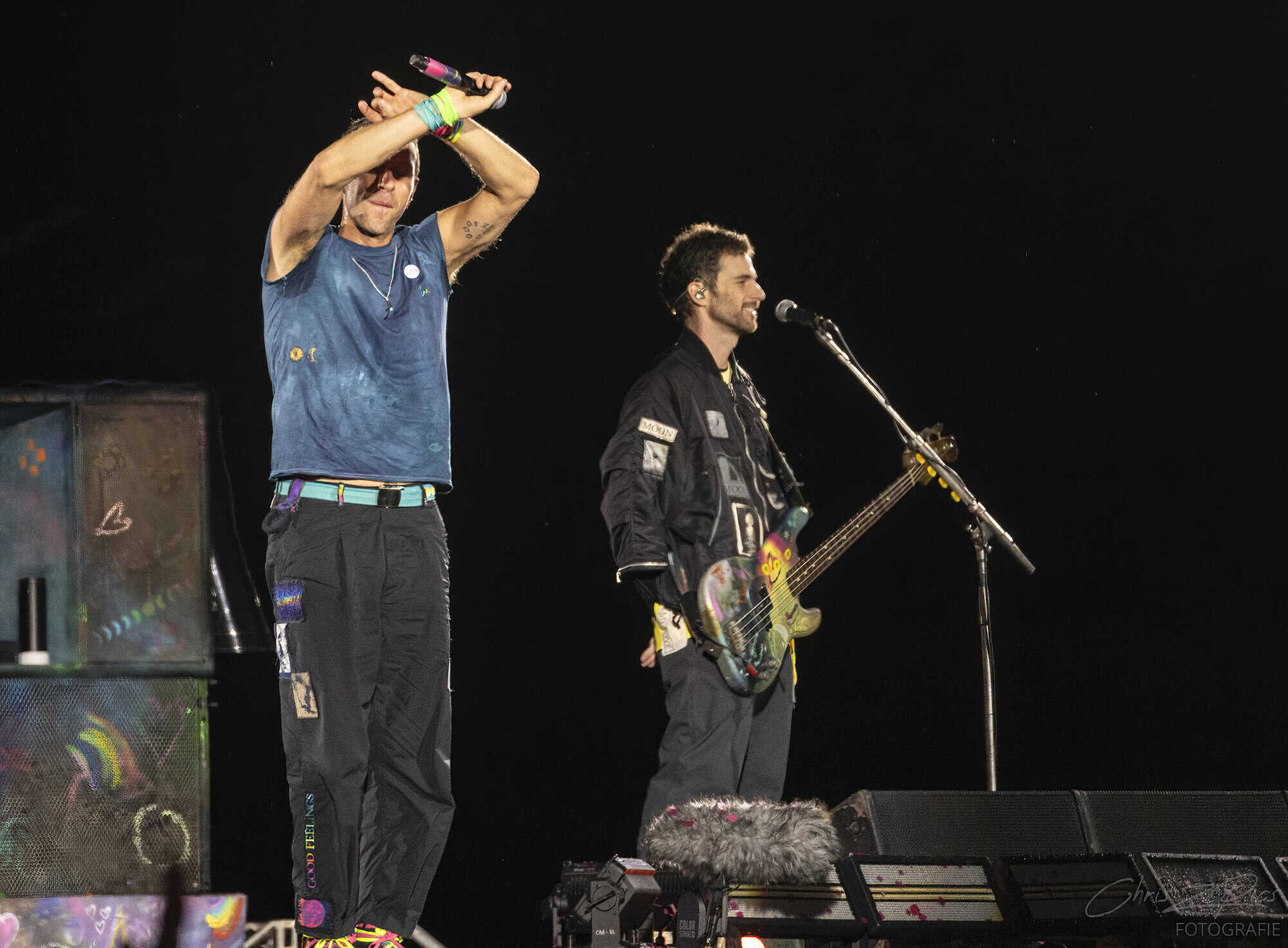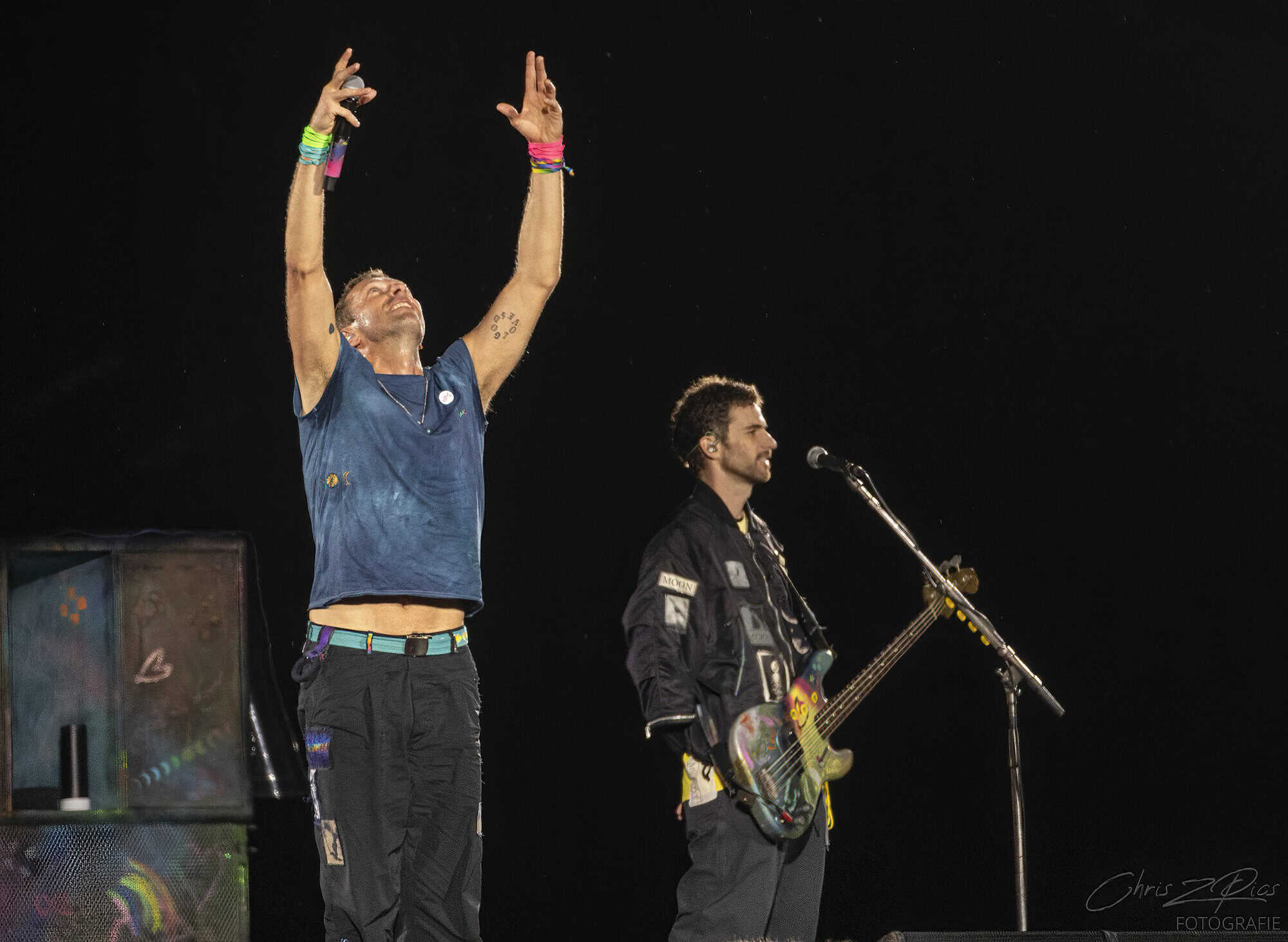 Finally the sounds of John Williams’ E.T. Theme signals that the concert is about to begin…as does a robotic voice says something about “Music Of The Spheres”…and then, there they are…Chris Martin, Jonny Buckland, Guy Berryman and Will ChampionColdplay in the middle of the stadium on “Stage B” singing and playing Higher Power while our wristbands throb with red light.