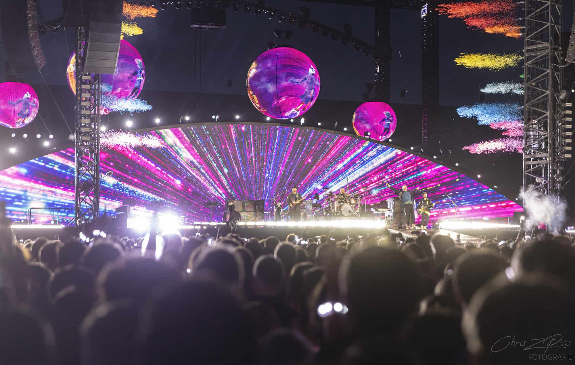 Chris Martin is running up and down the ramp that connects to the main stage and the balloons are released.