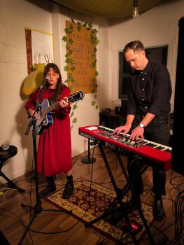 Fraser Ross gives us a travelling troubadours show of Olde Country Folke packed with wit and sly humour. Whilst Jazmine Mary taps into witchy and haunting spectral Folk songs. Both deliver a compelling show to a packed audience at a small boutique art shop on Auckland’s Dominion Road.
