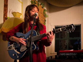 She doesn’t really invite you in. More she casts a spell to trap you like a Medusa. Unsettling music but fascinating. She is with Peter Ruddell, keyboard player with Wax Chattels. So, we could be going for extreme horror tonight. But Ruddell is in support and supplying textures and some harmony to her original songs. Most from her current album The Licking of a Tangerine.