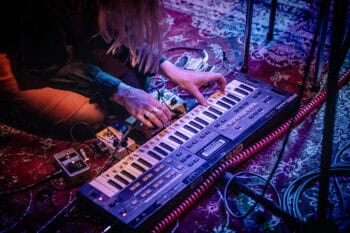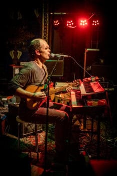 First up is Ben Holmes as Oksun Ox. Has a banana box full of gadgets, modified keyboards and a small six- string acoustic guitar laden with add-ons.