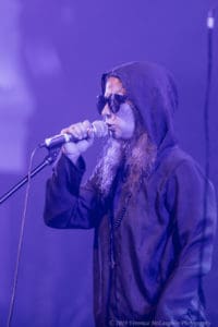 Then the five Pussy Riot members took the stage, with Maria Alyokhina in the center, flanked on either side by the other four performers, two female and two male. Much of the music was electronic although there was a drum kit used extensively along with live trumpet and sax. Indeed, the sax at the beginning sounded like a cross between X-Ray Spex and Morphine.