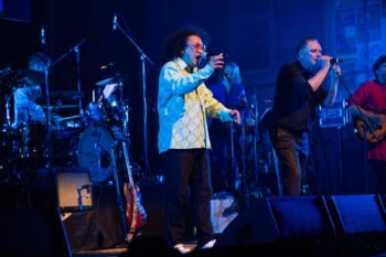 Back in the USSR. Jon Toogood sings. About 15 musicians on stage. Saxophone and horns. Two drummers. A nod to the Beach Boys. The Ukraine girls really knock me out/ They leave the West behind. They really do.