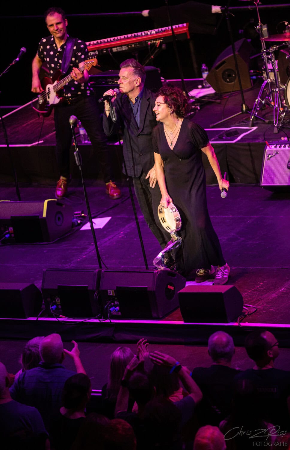 “Raintown” got our collective arms up in the air and Mid Century Modern’s unmistakable opening notes segued into a sweet rendition, followed by That’s What We Can Do, which kept them up there with a rousing, evangelical call to arms from Ross. In a world where it feels as though the “lunatics are in charge of the asylum”, he reminded us that we can bring back some “compassion, love, forgiveness, redemption and salvation… and sister Lorraine is going to lead the choir.”