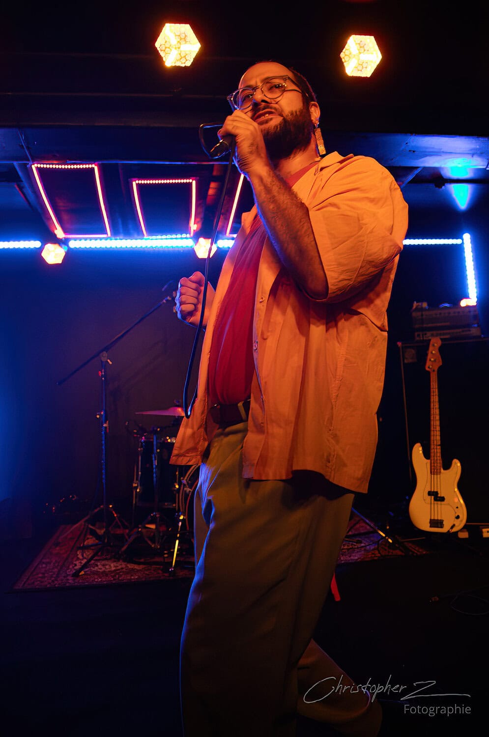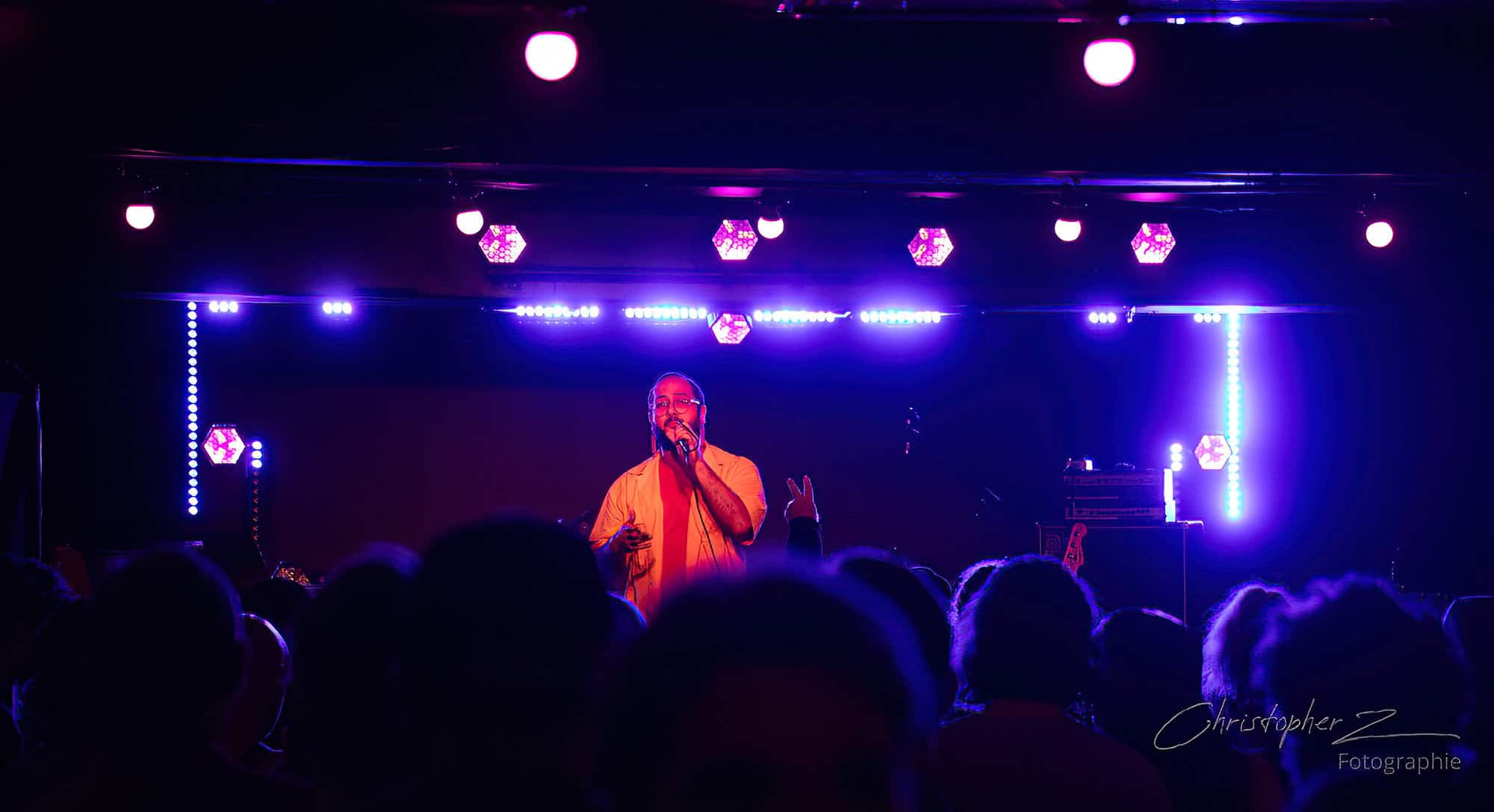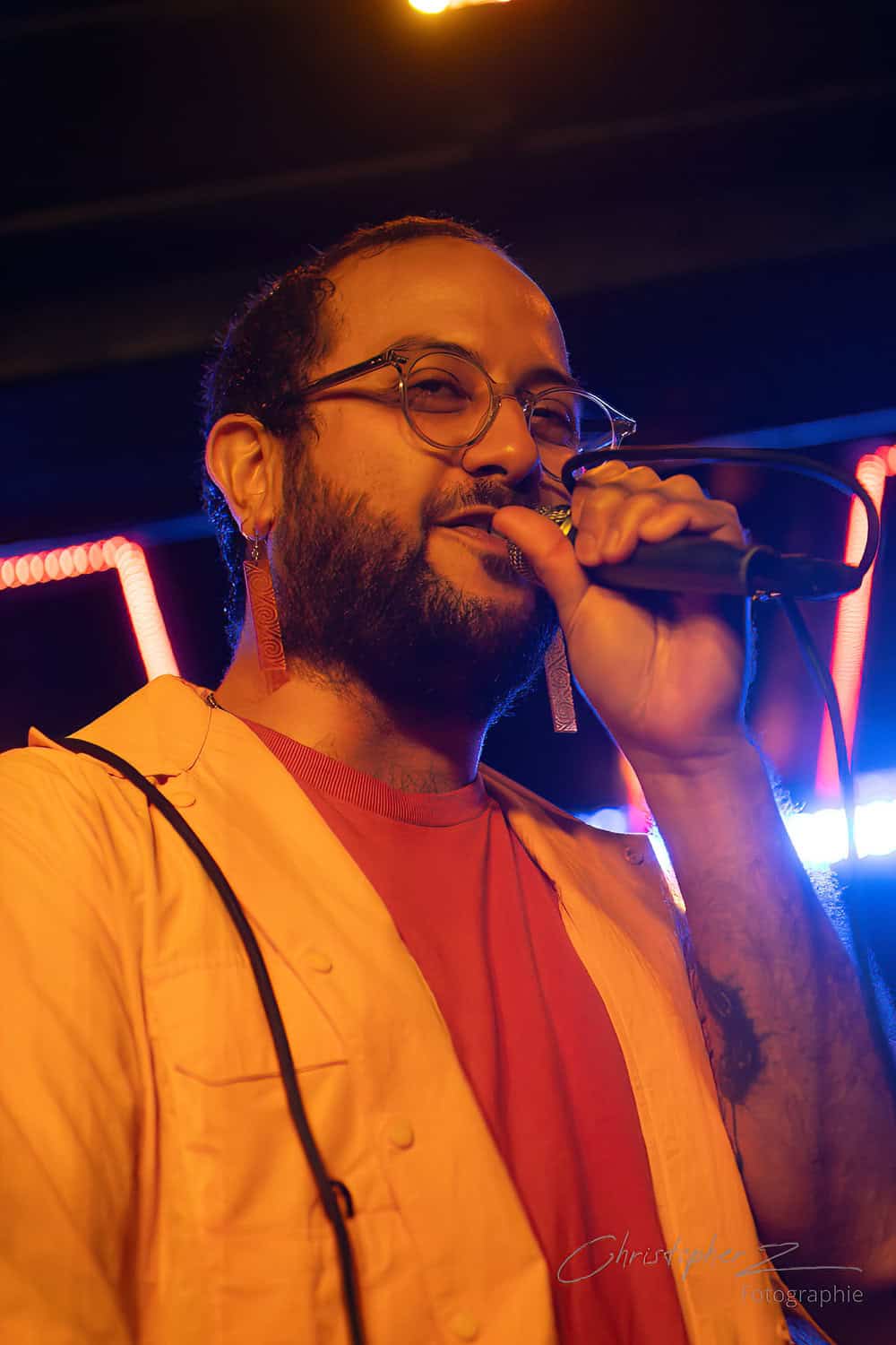Not tonight, Dbldbl is all solo tonight onstage, albeit with his laptop, as tech issues are resolved, he, last minute shuts the backstage door and prowls the stage, works the stage, works the room.