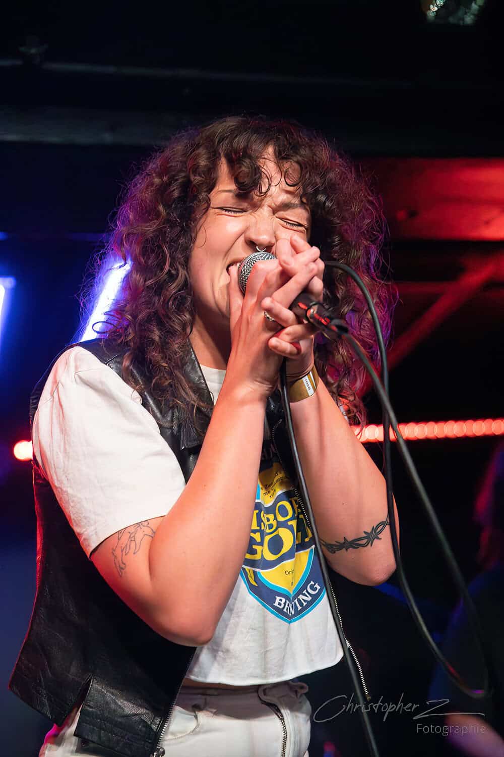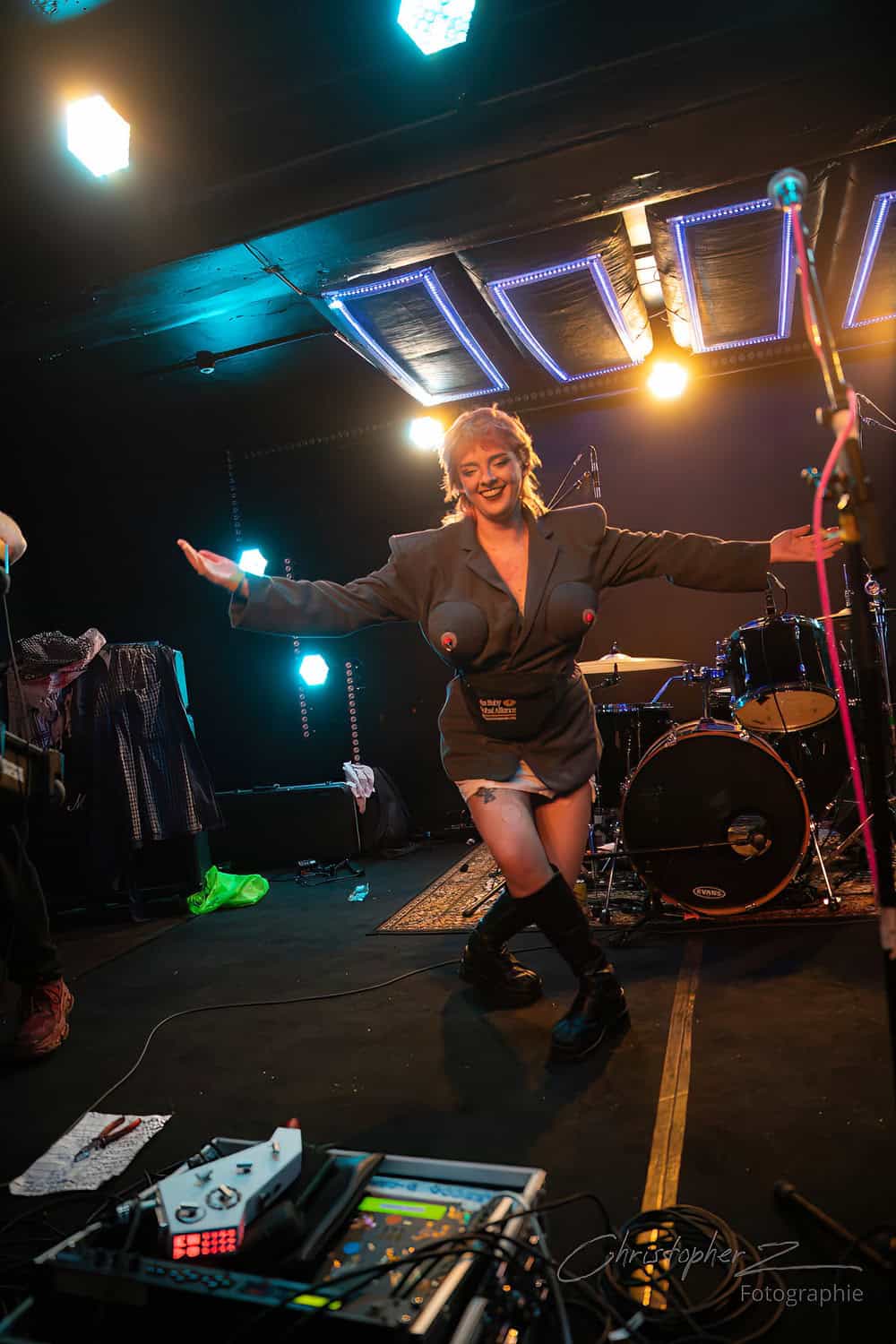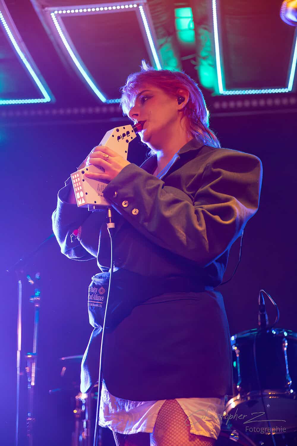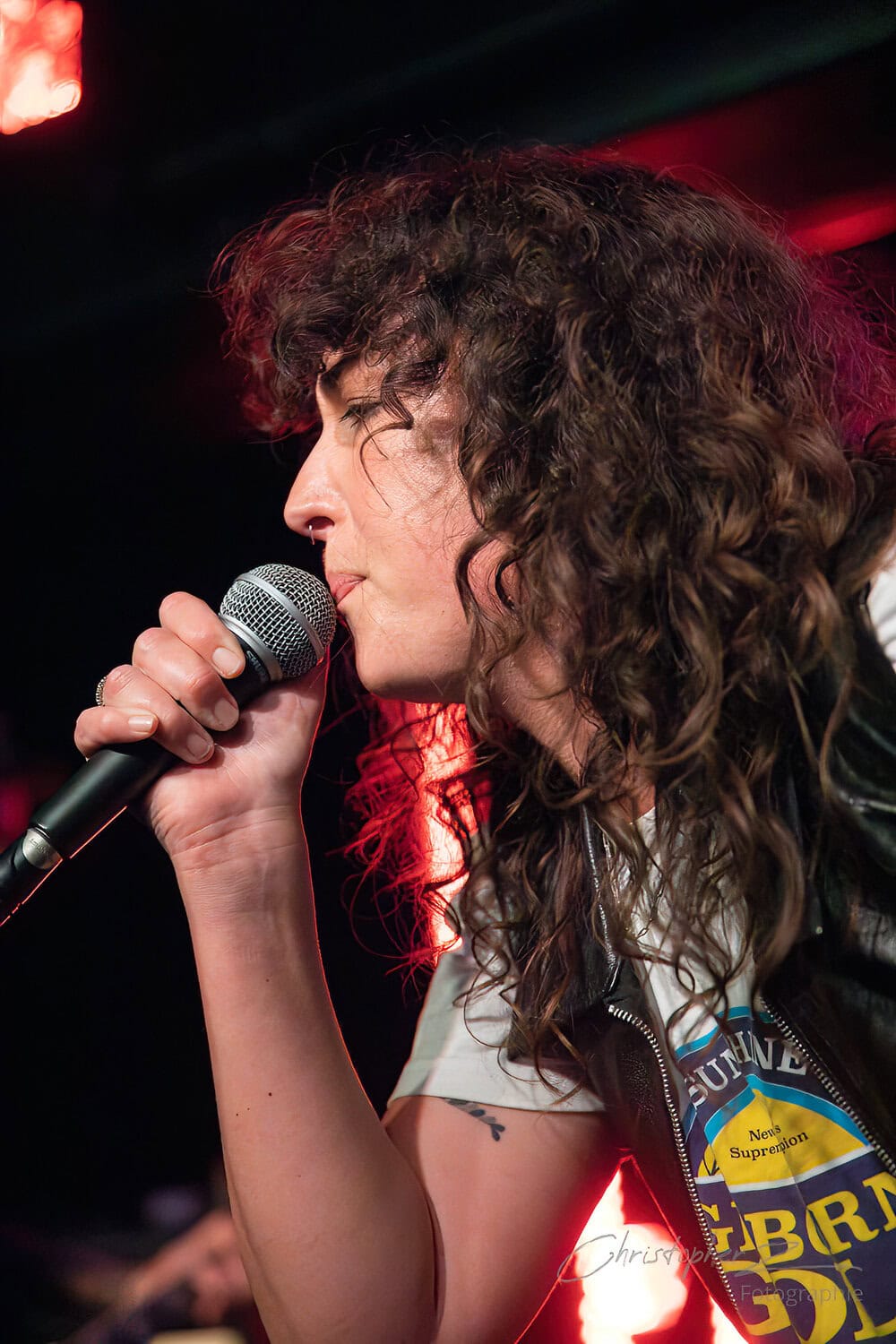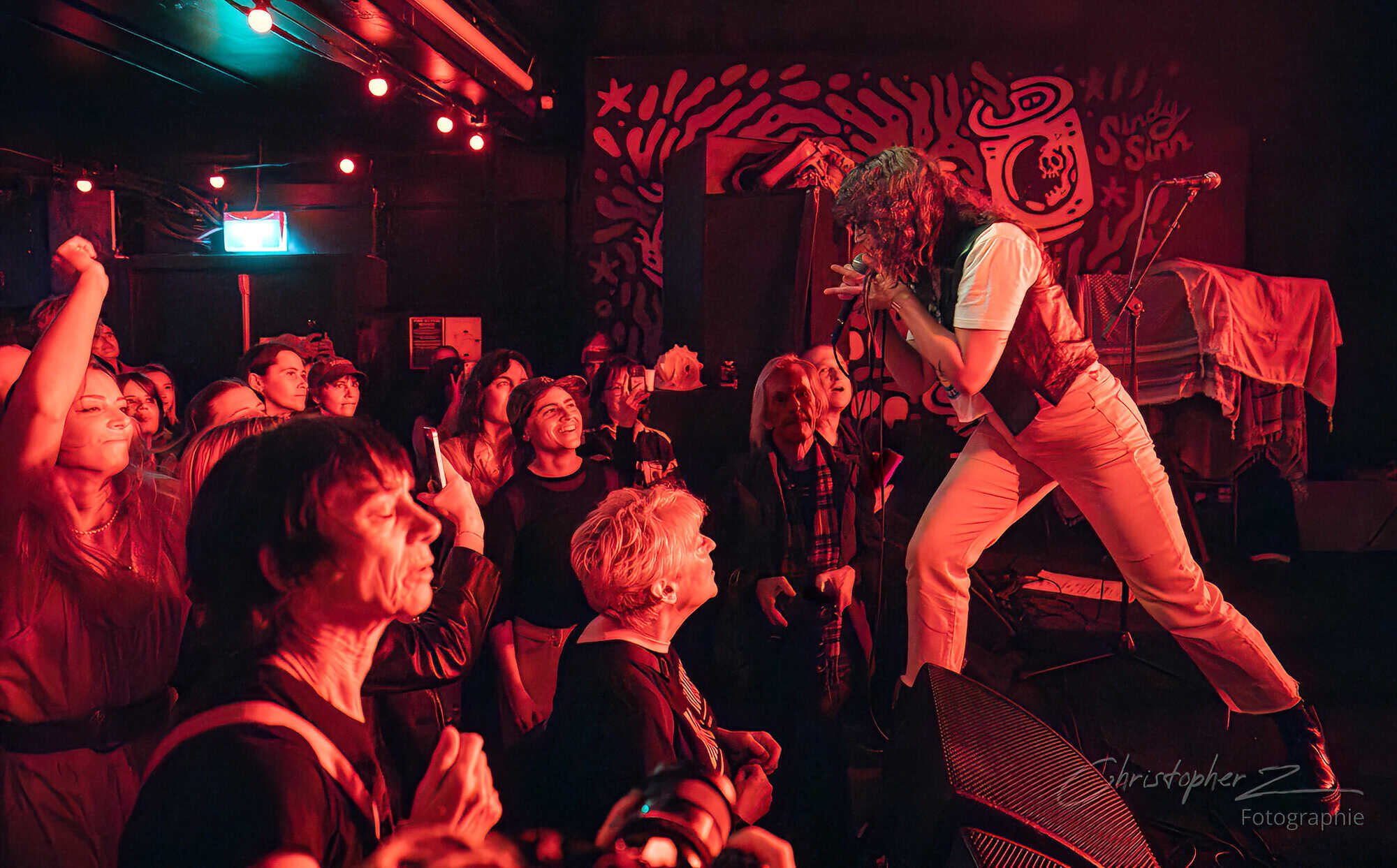 With the twin punk guitars of Justin Lee and Hariet Ellis acting out, noise fills the room, a mosh pit threatens and Lucy Suttor continues to work the room between songs.