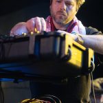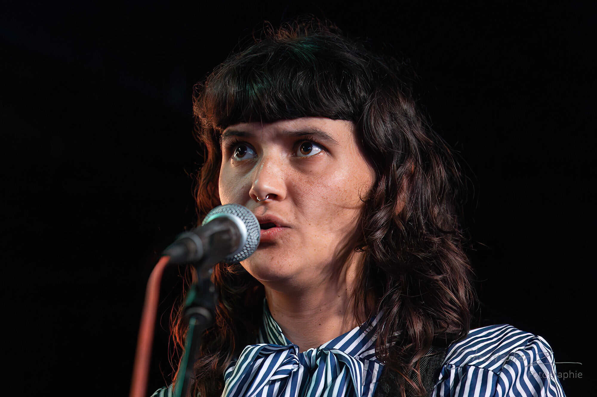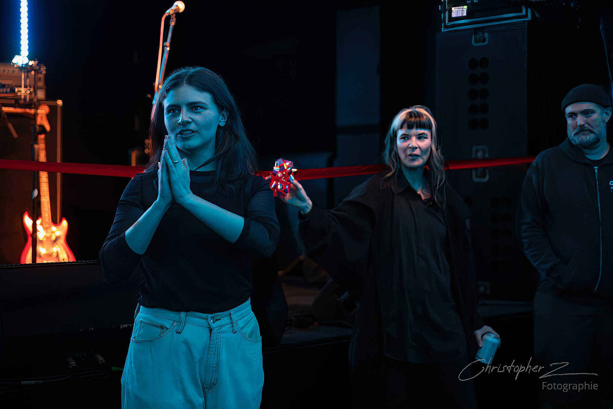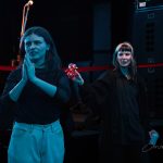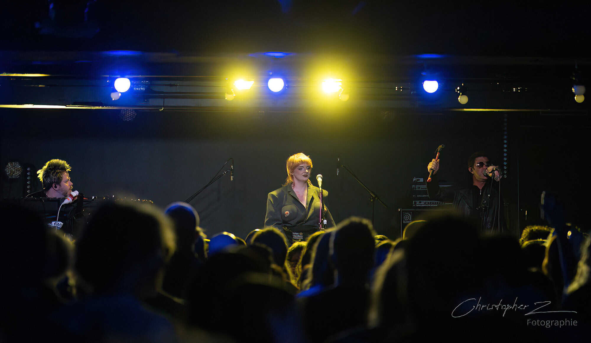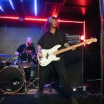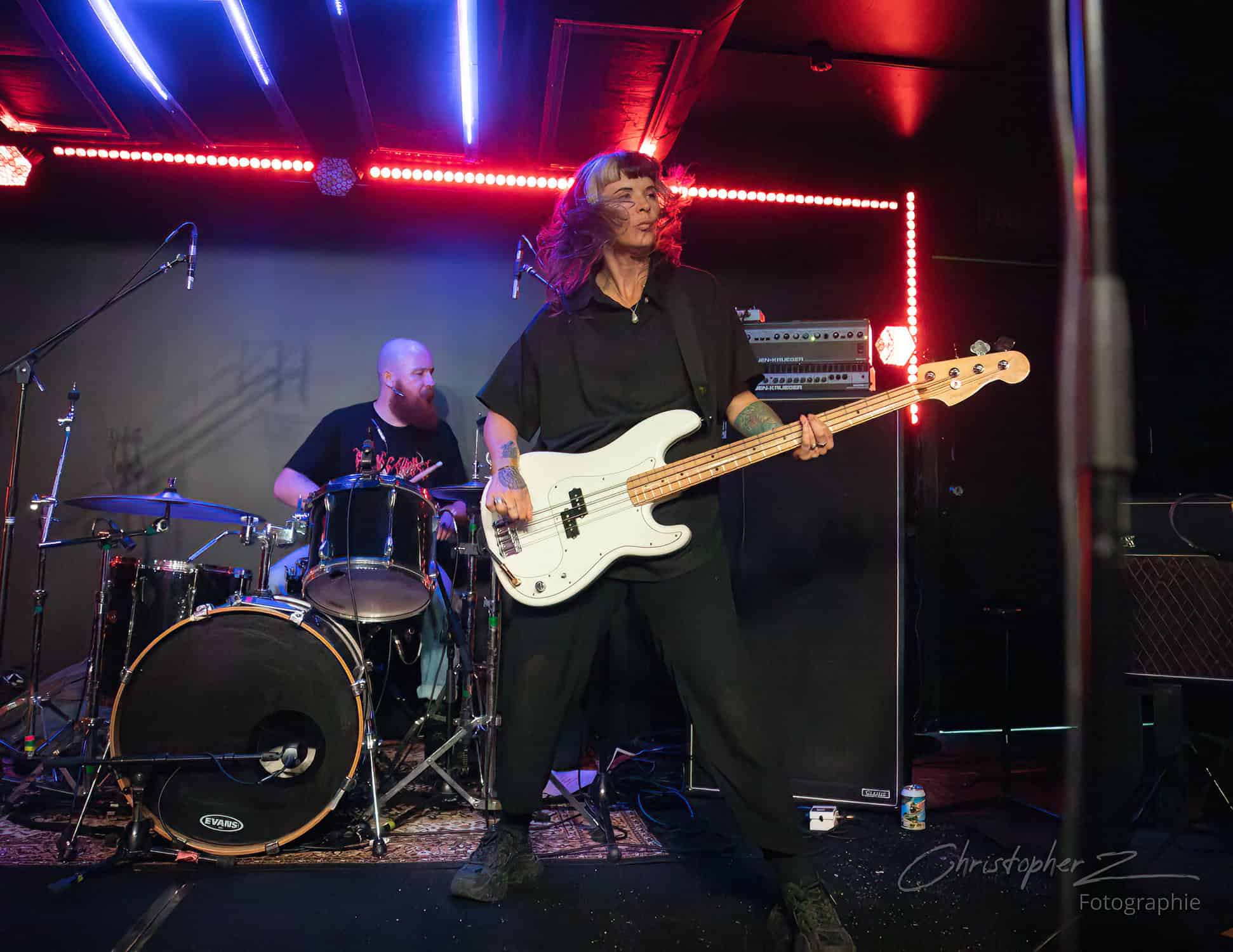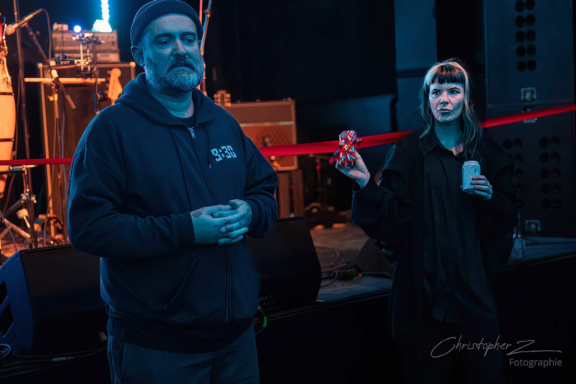Grecco Romank are Tāmaki Makaurau-based trio Billie Fee, Mikey Sperring, and Damian Golfinopoulos. I last saw them at the marvelous Junk Festival in OLD Whammy Bar in the OLD Backroom, a much bigger space crowd (and stage) this time. Finally… as industrial electro beats emanate from Mikey Sperring infernal machines, the other members join him on stage.