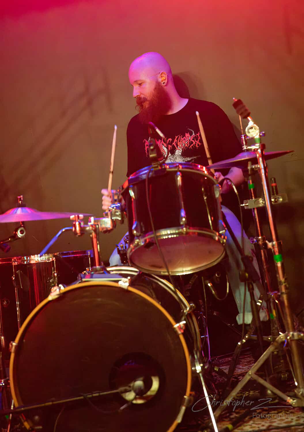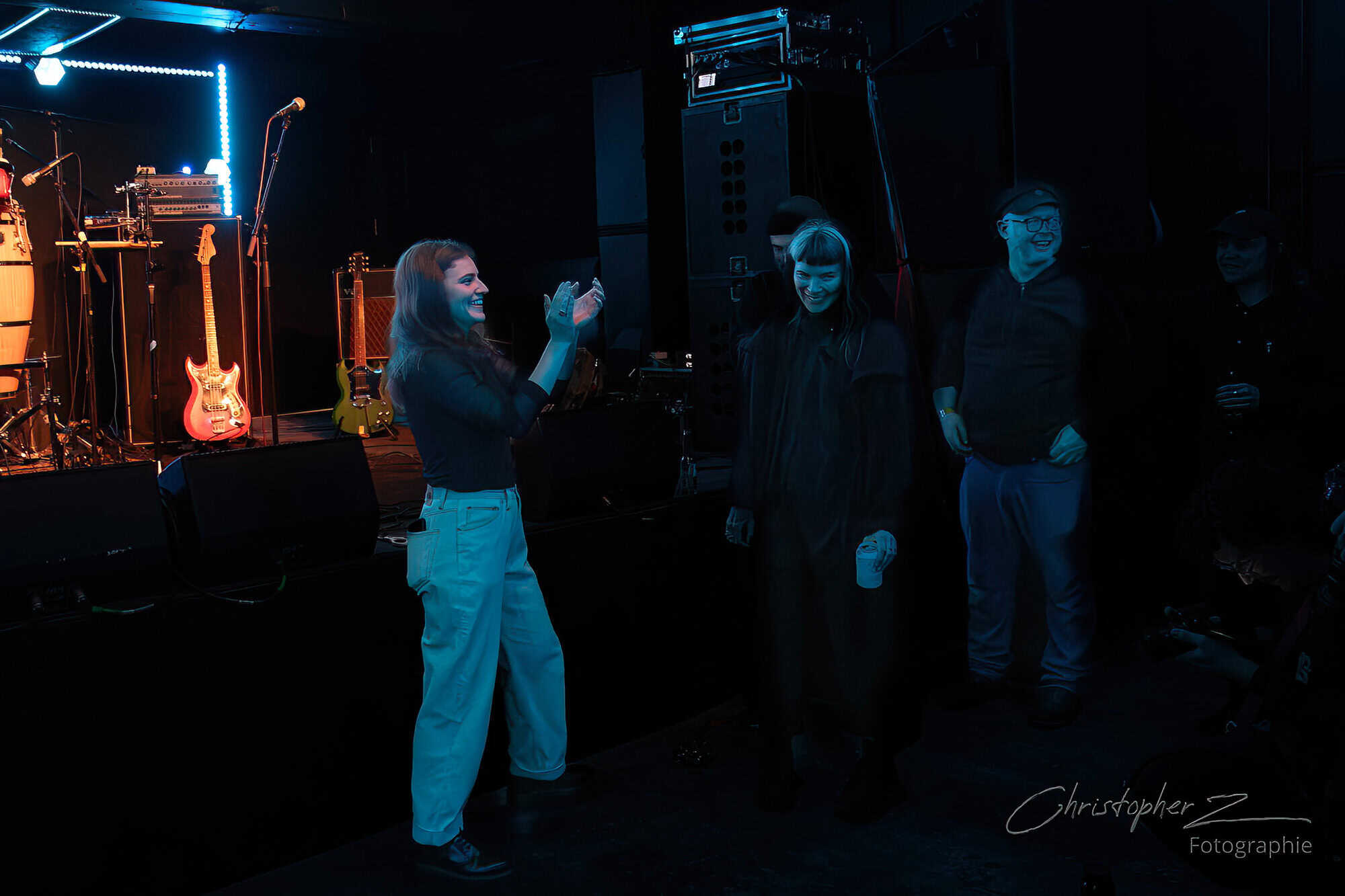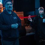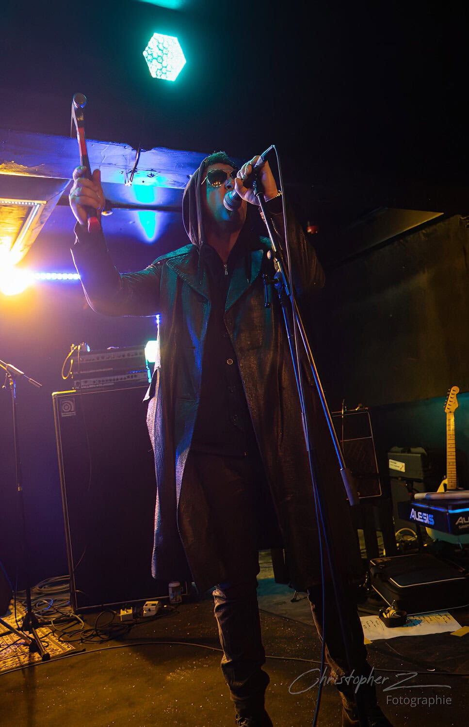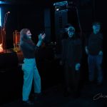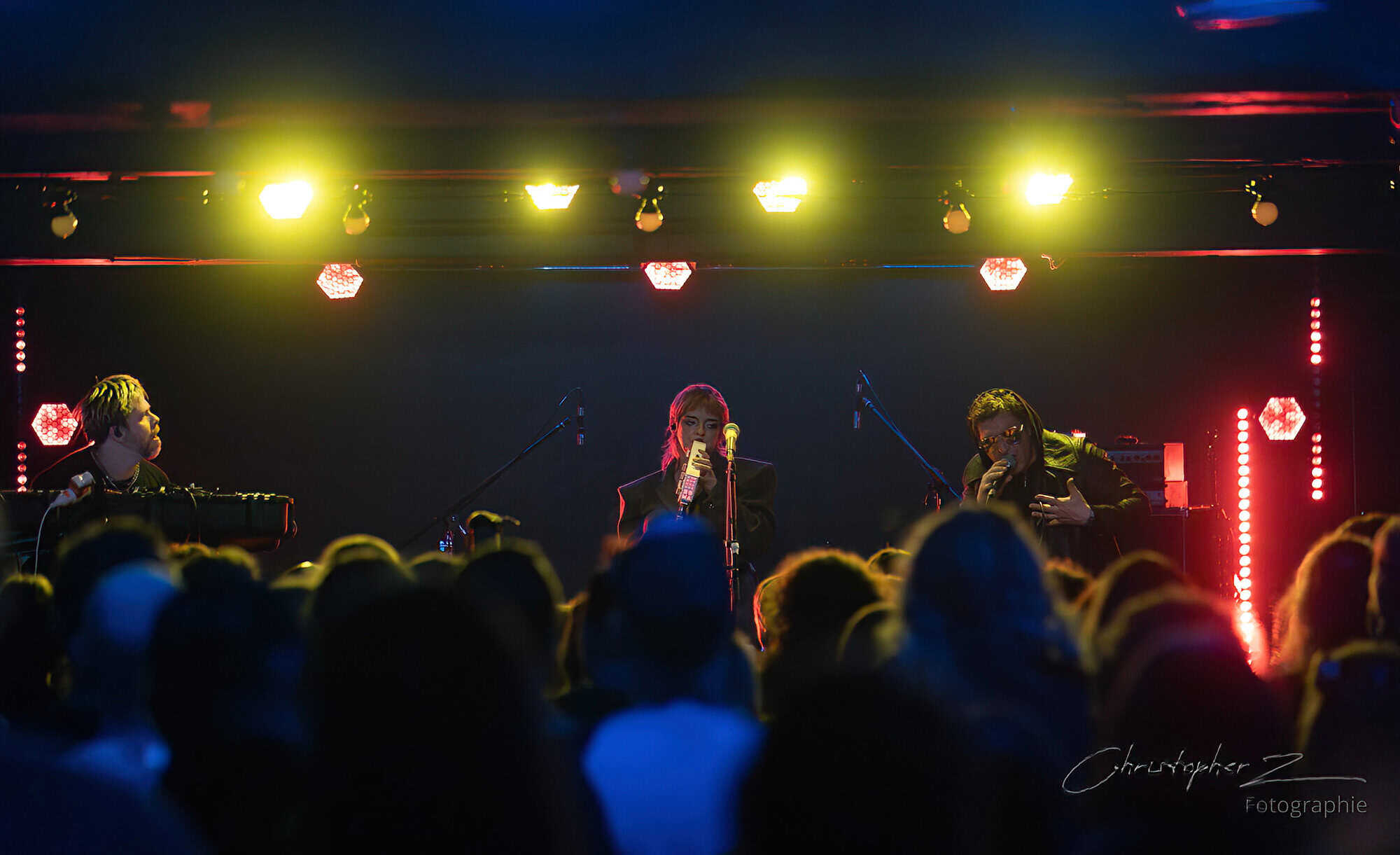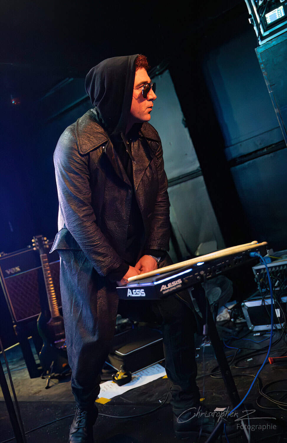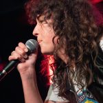 Grecco Romank are Tāmaki Makaurau-based trio Billie Fee, Mikey Sperring, and Damian Golfinopoulos. I last saw them at the marvelous Junk Festival in OLD Whammy Bar in the OLD Backroom, a much bigger space crowd (and stage) this time. Finally… as industrial electro beats emanate from Mikey Sperring infernal machines, the other members join him on stage.