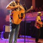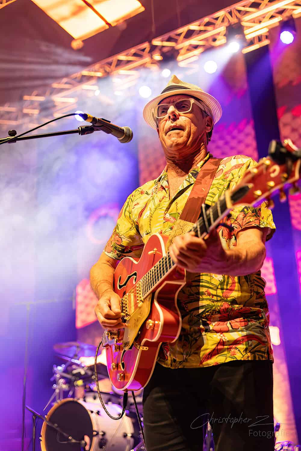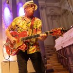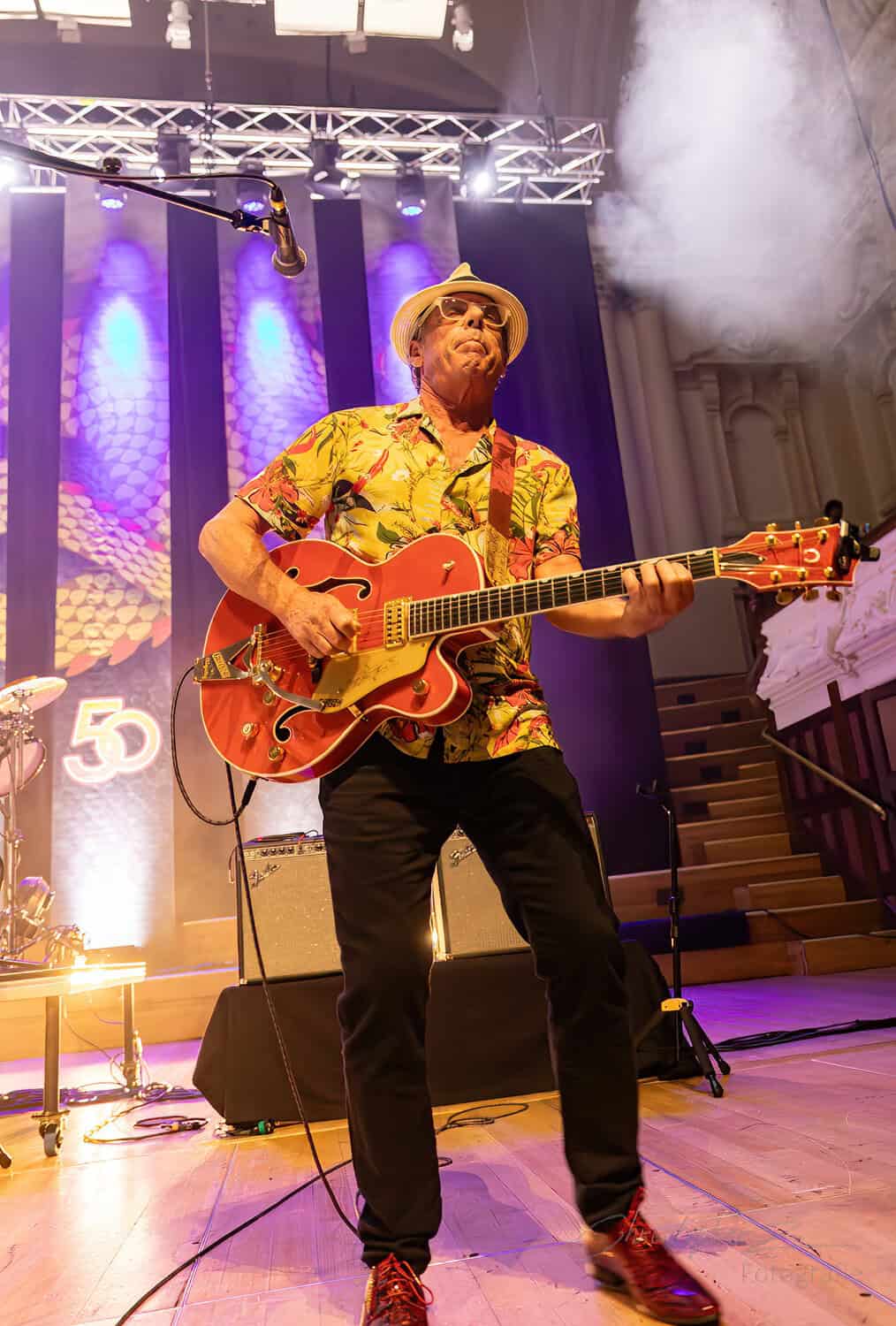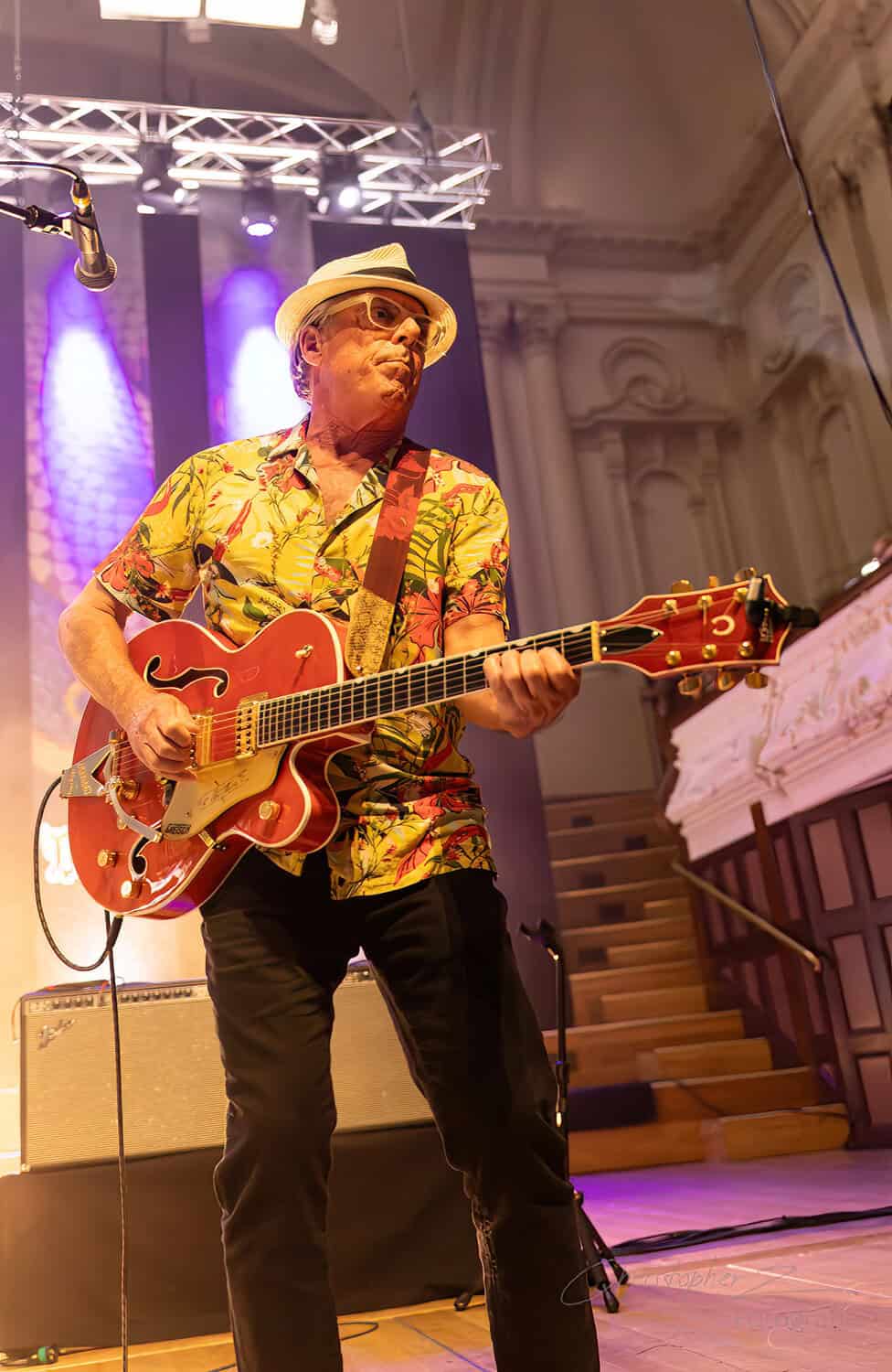 Guitar ace ‘Brucie’ Reid – dressed for comfort in cotton short-sleeved shirt and a straw boater, but shredding his instrument with multiple solos.