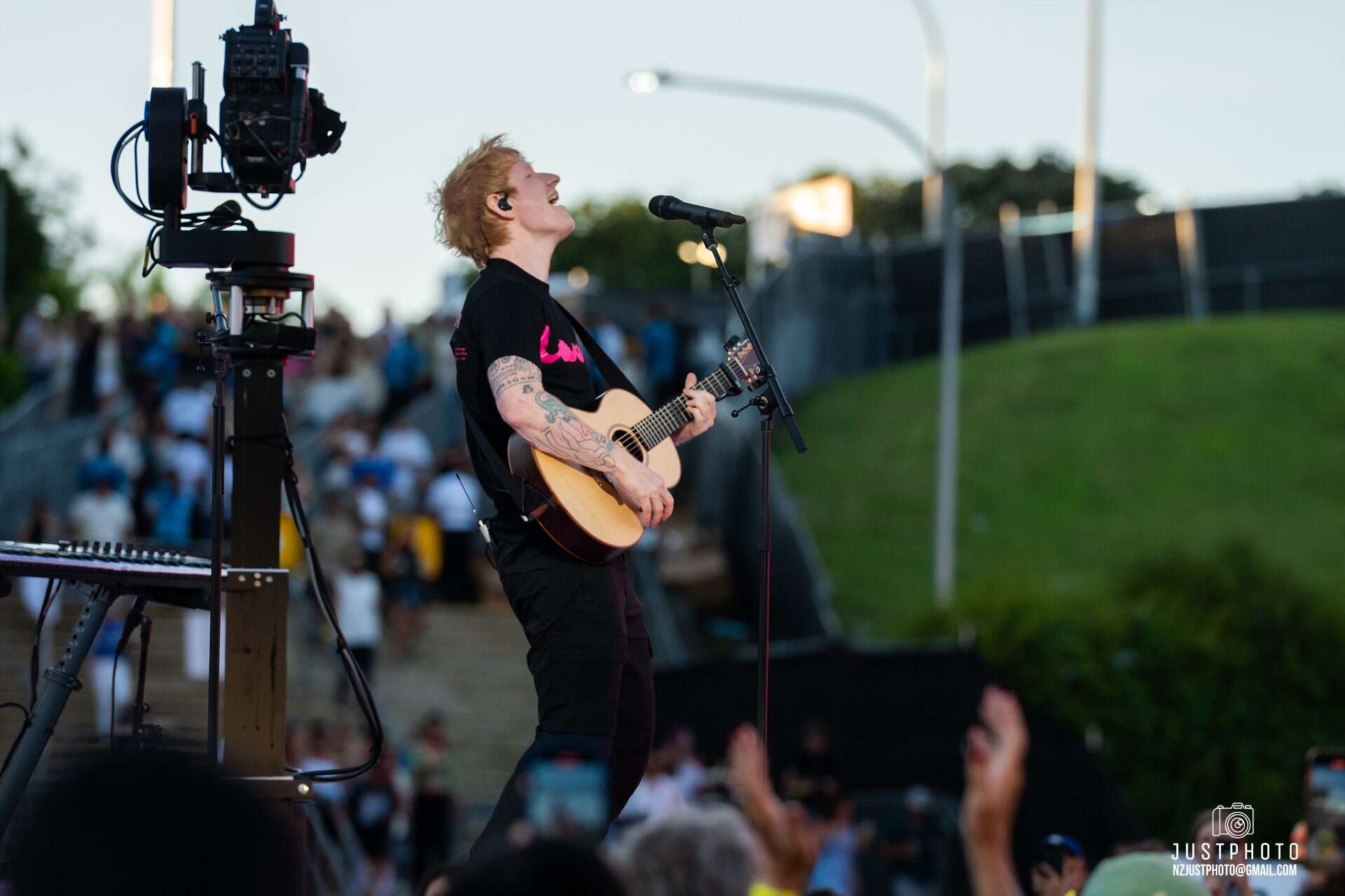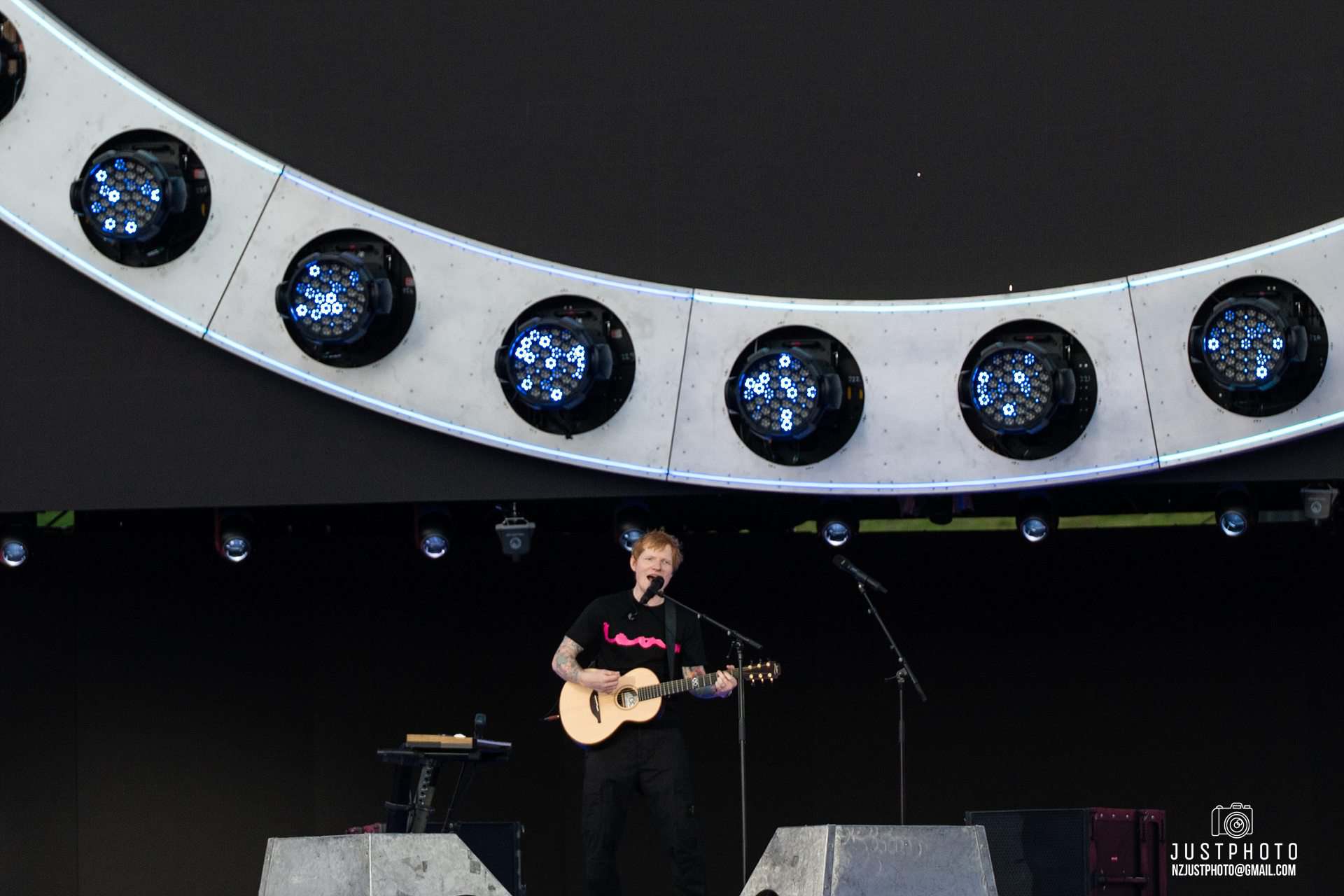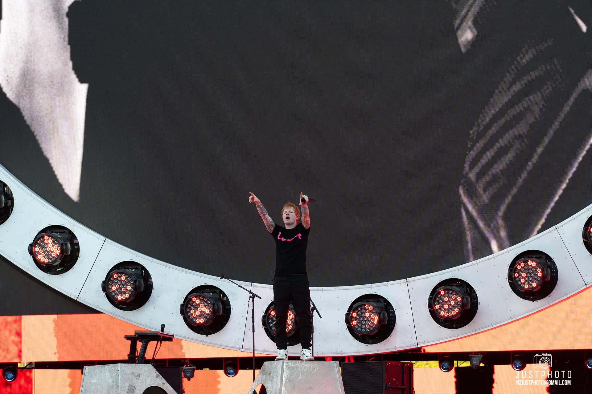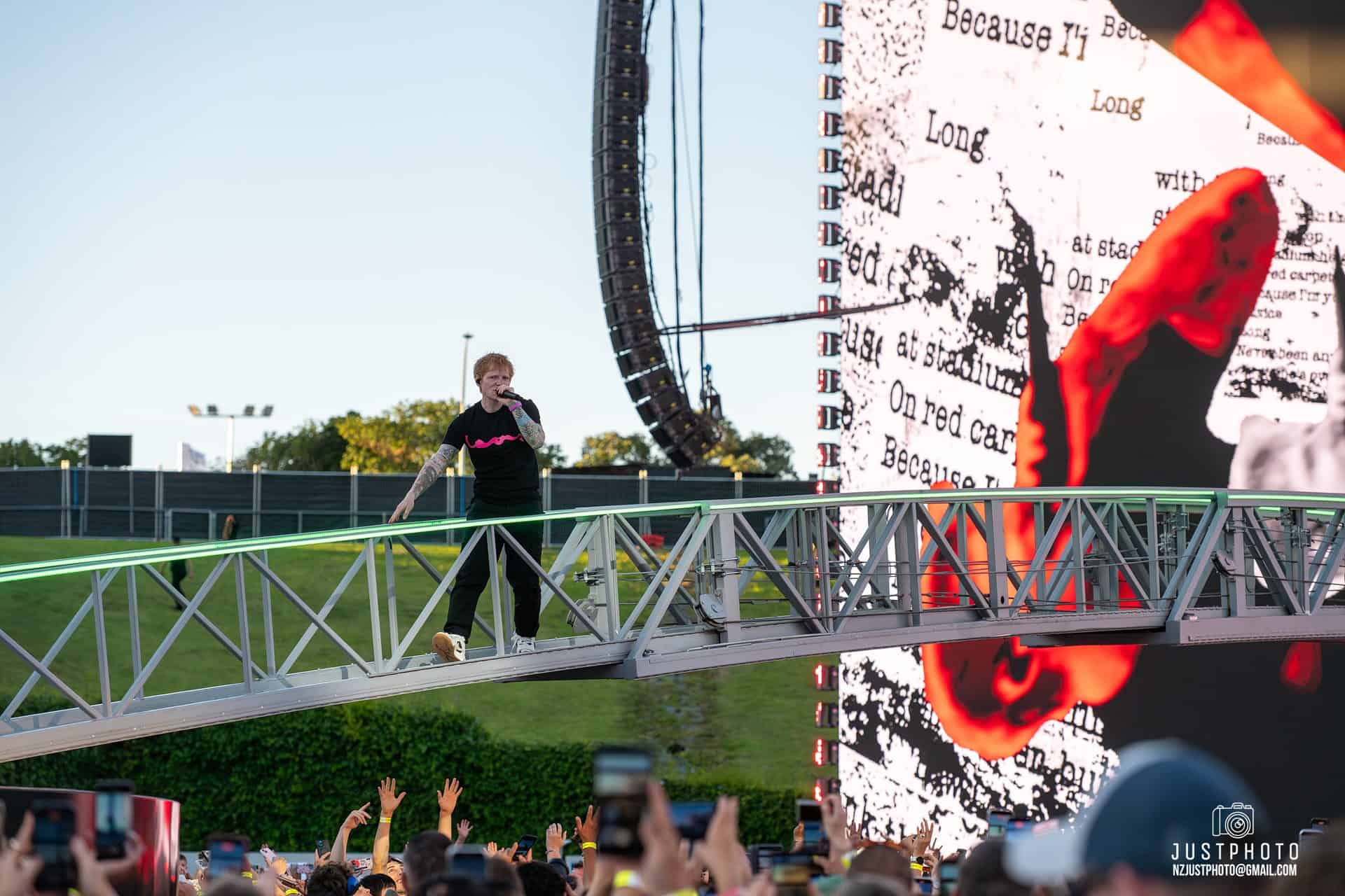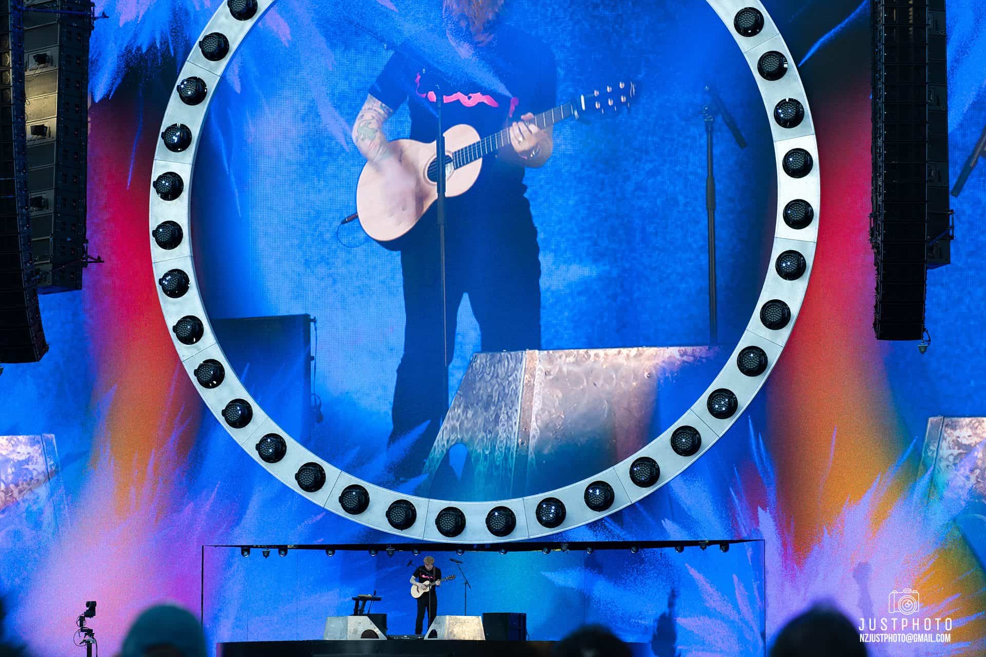 Bang on 8pm, Ed took to the stage – a phenomenal set up with NZ’s largest ever screen. The AV was pretty bloody impressive, as was the bridge which projected back and forth over the standing crowd to allow Sheeran to access a smaller pedestal stage further down the arena. Taking credit for it as an idea hatched a couple of years back, Ed trip-trapped across it several times through the evening, Billy Goats Gruff styley, asking the audience whether they were OK with it launching over their heads. “I’m glad the bridge worked!” he said, making us wonder whether the hydraulics had been less reliable in rehearsal. It would have been a messy and nasty start to the tour had there been an audience squishing incident.