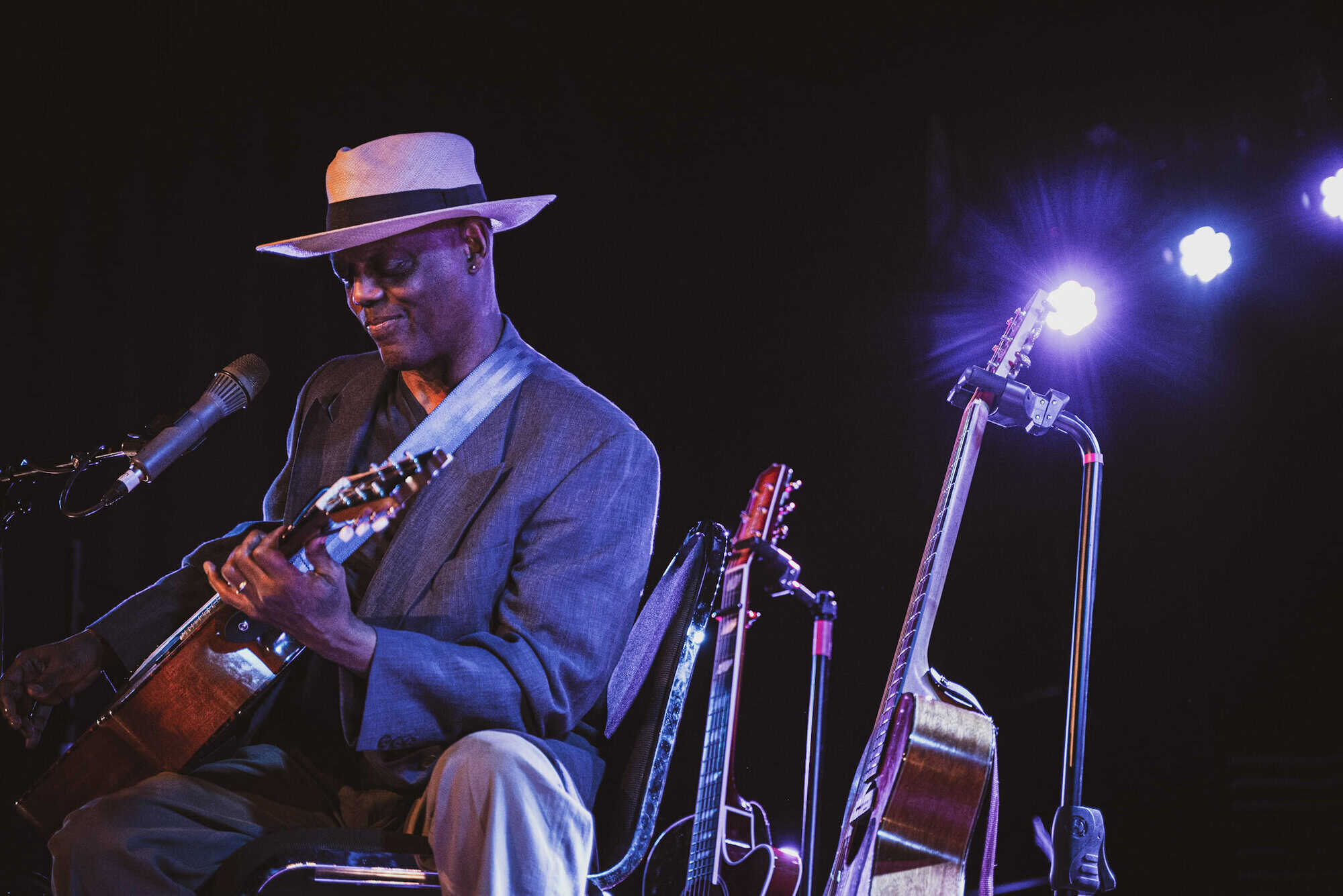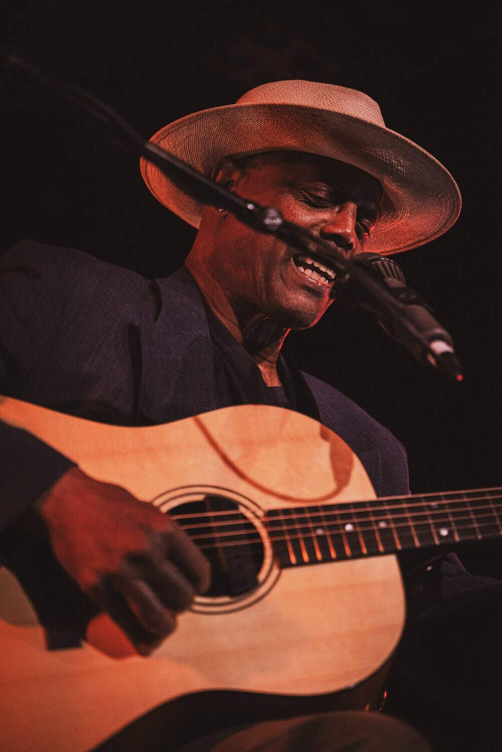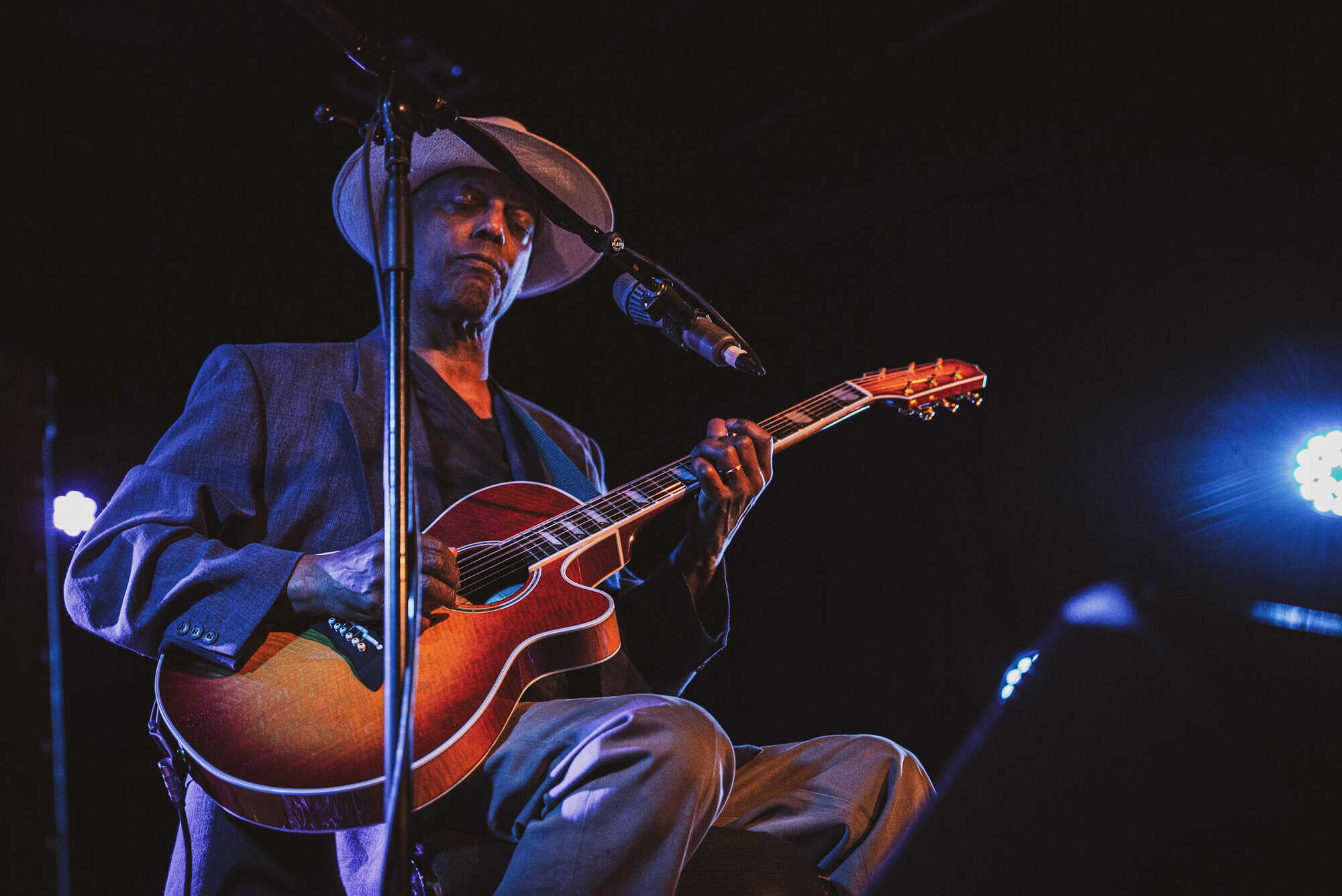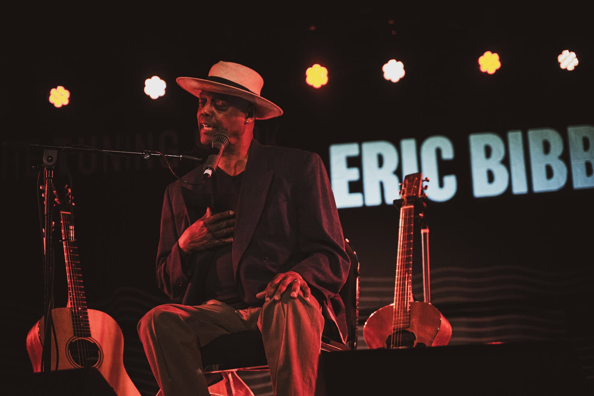 Three acoustic guitars surround one chair on stage. Just after 8pm, Eric Bibb walks through the crowd and up onto the stage. Tall, loose pants, straw hat, wide smile. No need for an opening act. The crowd mostly in their 60s are clearly only here for one man.