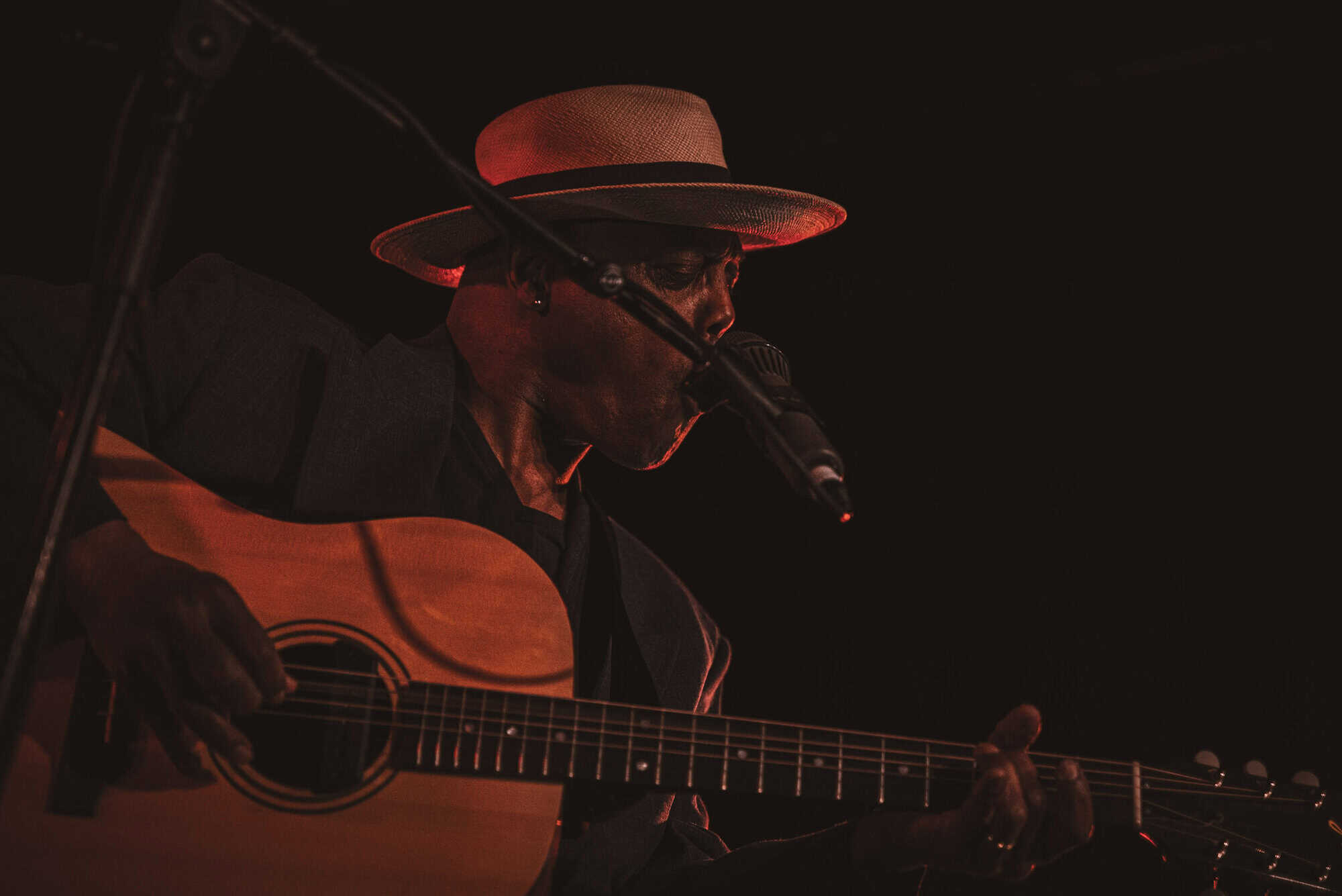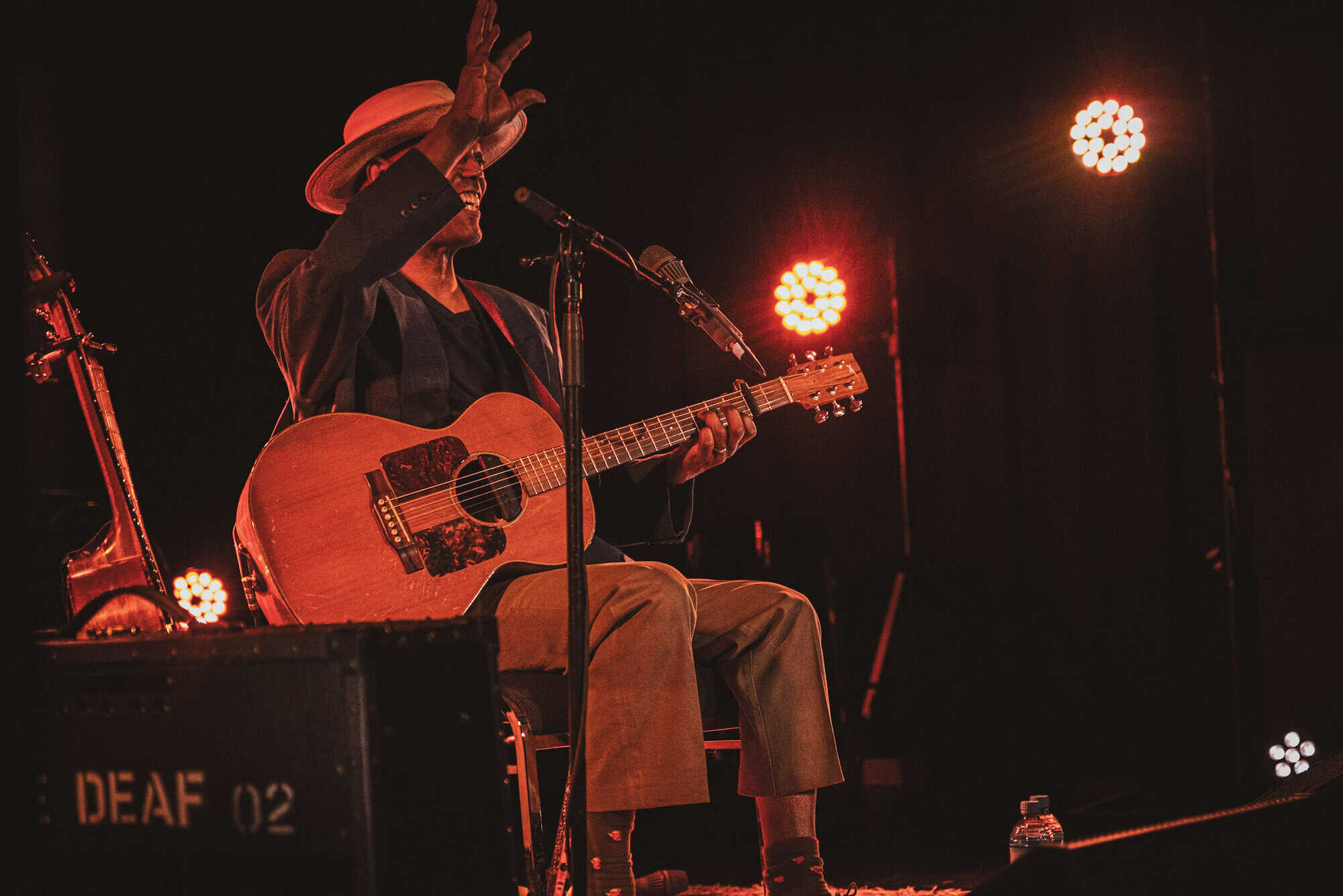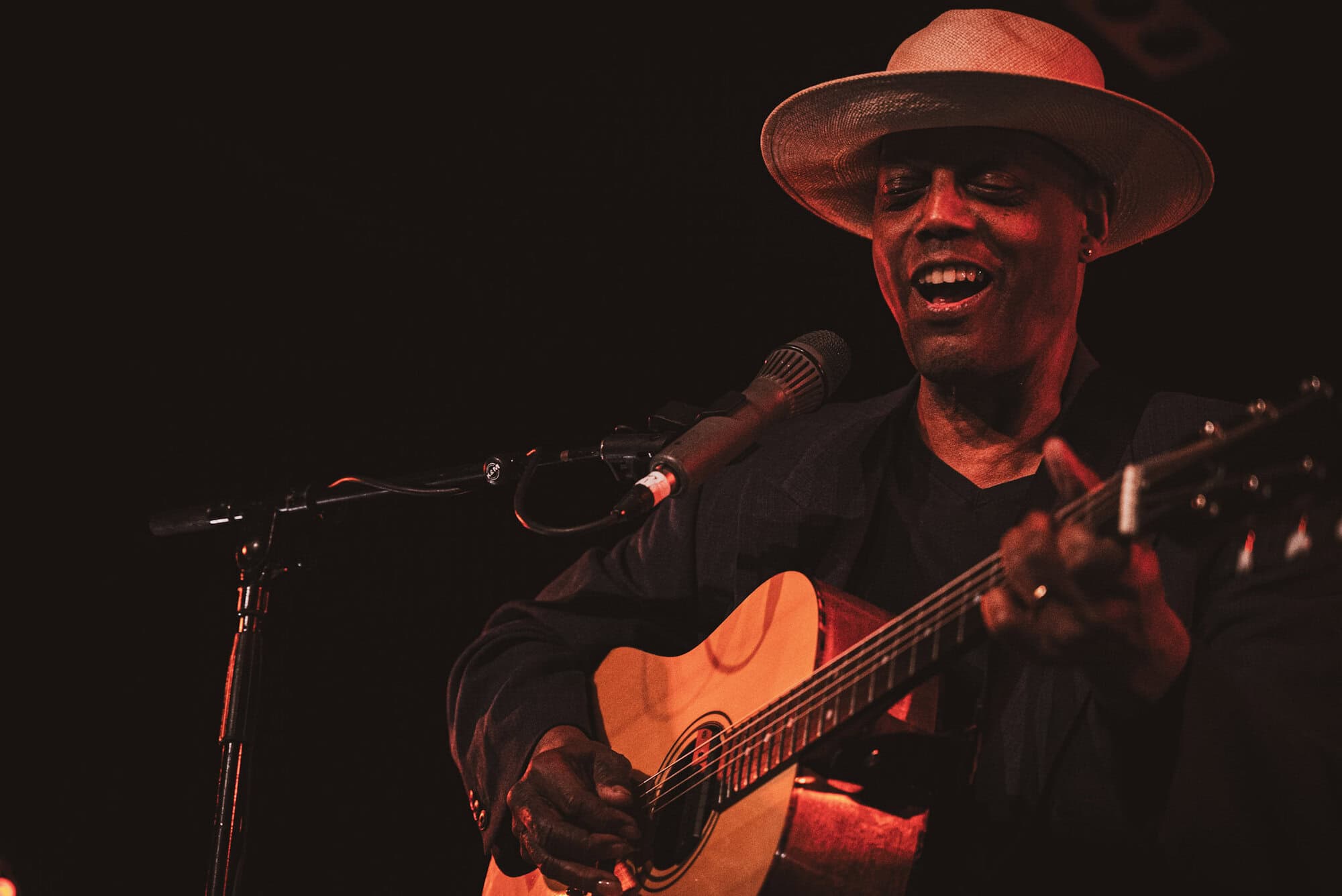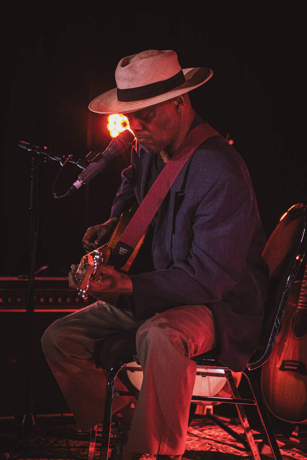 Three acoustic guitars surround one chair on stage. Just after 8pm, Eric Bibb walks through the crowd and up onto the stage. Tall, loose pants, straw hat, wide smile. No need for an opening act. The crowd mostly in their 60s are clearly only here for one man.