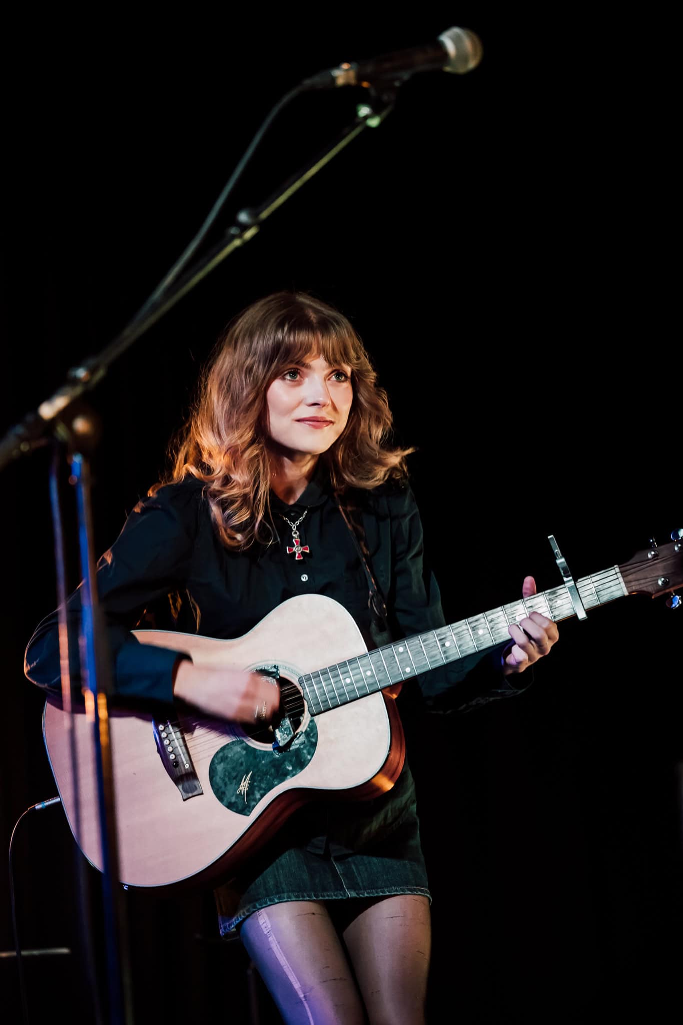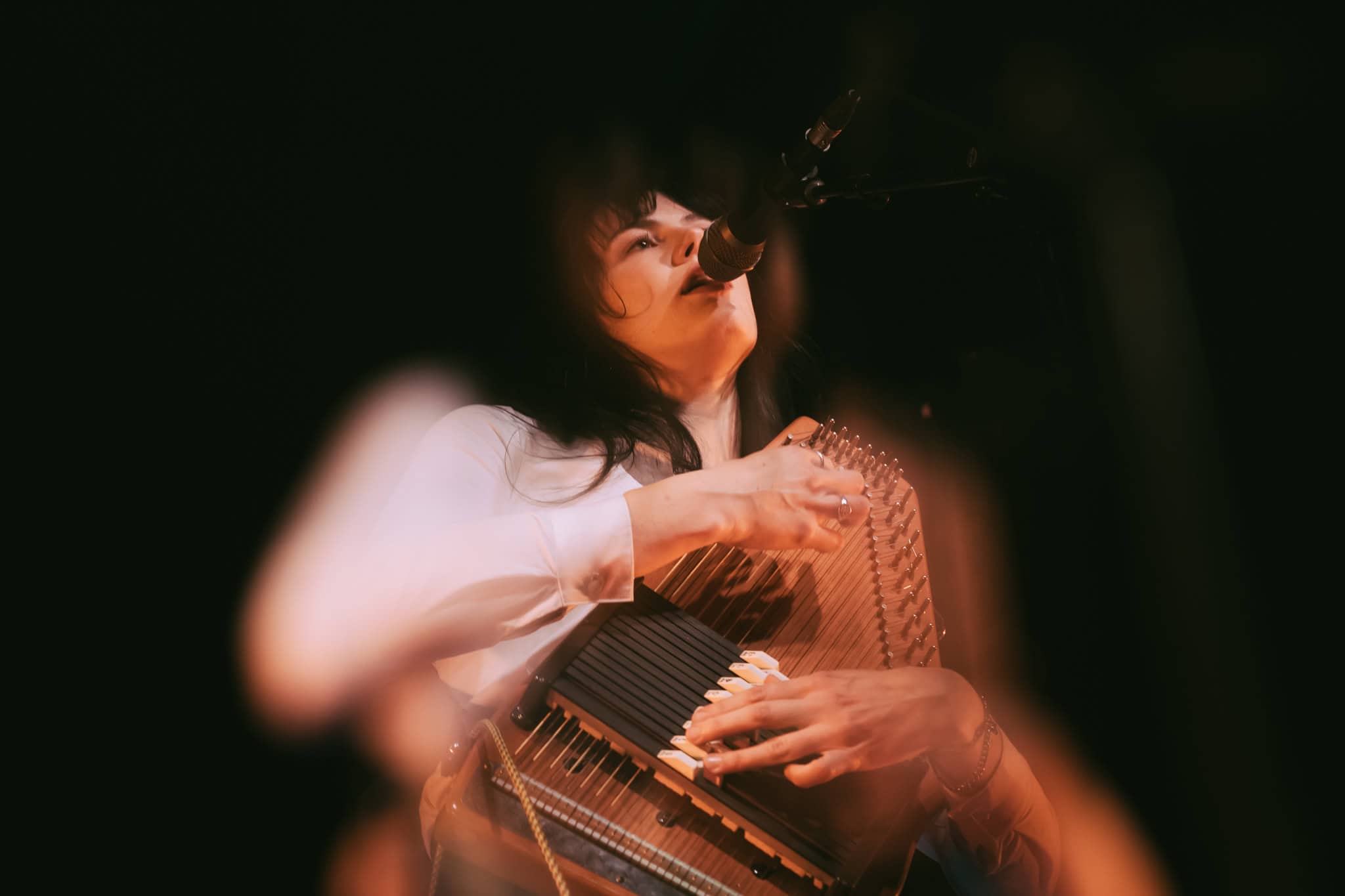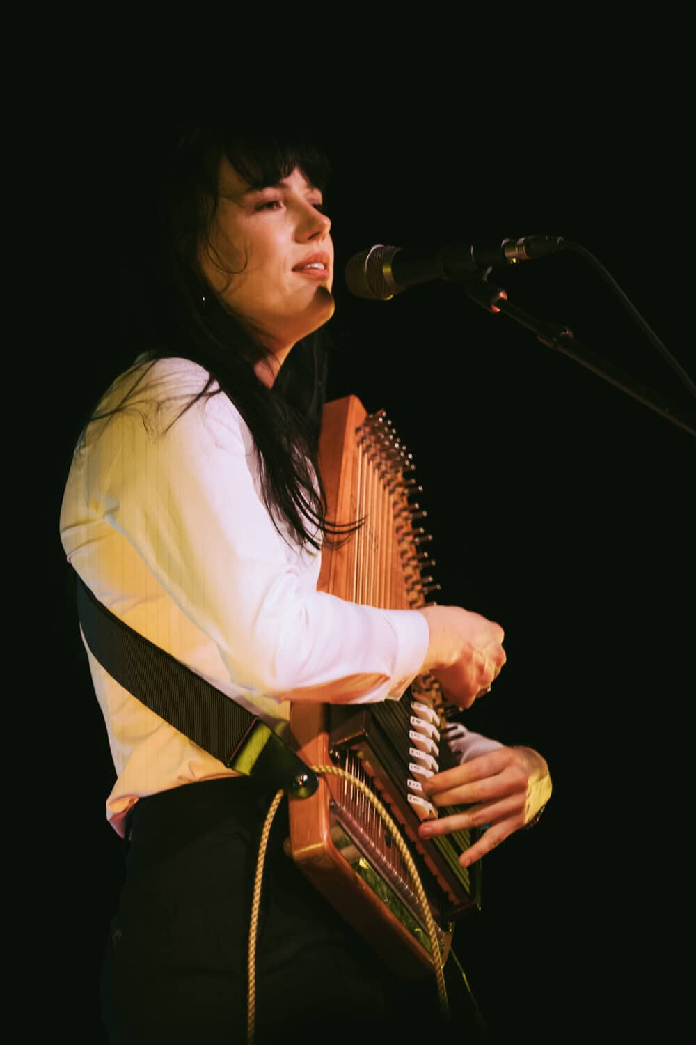 First up, though, its Georgia Knight. Walks on, takes off a puffer jacket and dons an autoharp. Holds it in affectionate embrace, whispering into the beginnings of first song Mingle. Spacious, atmospheric, mysterious sounds. Lyrics to match I’m looking for something to do/we can talk revolution/I say maybe. Something alluringly hypnotic in her repetitive strums.